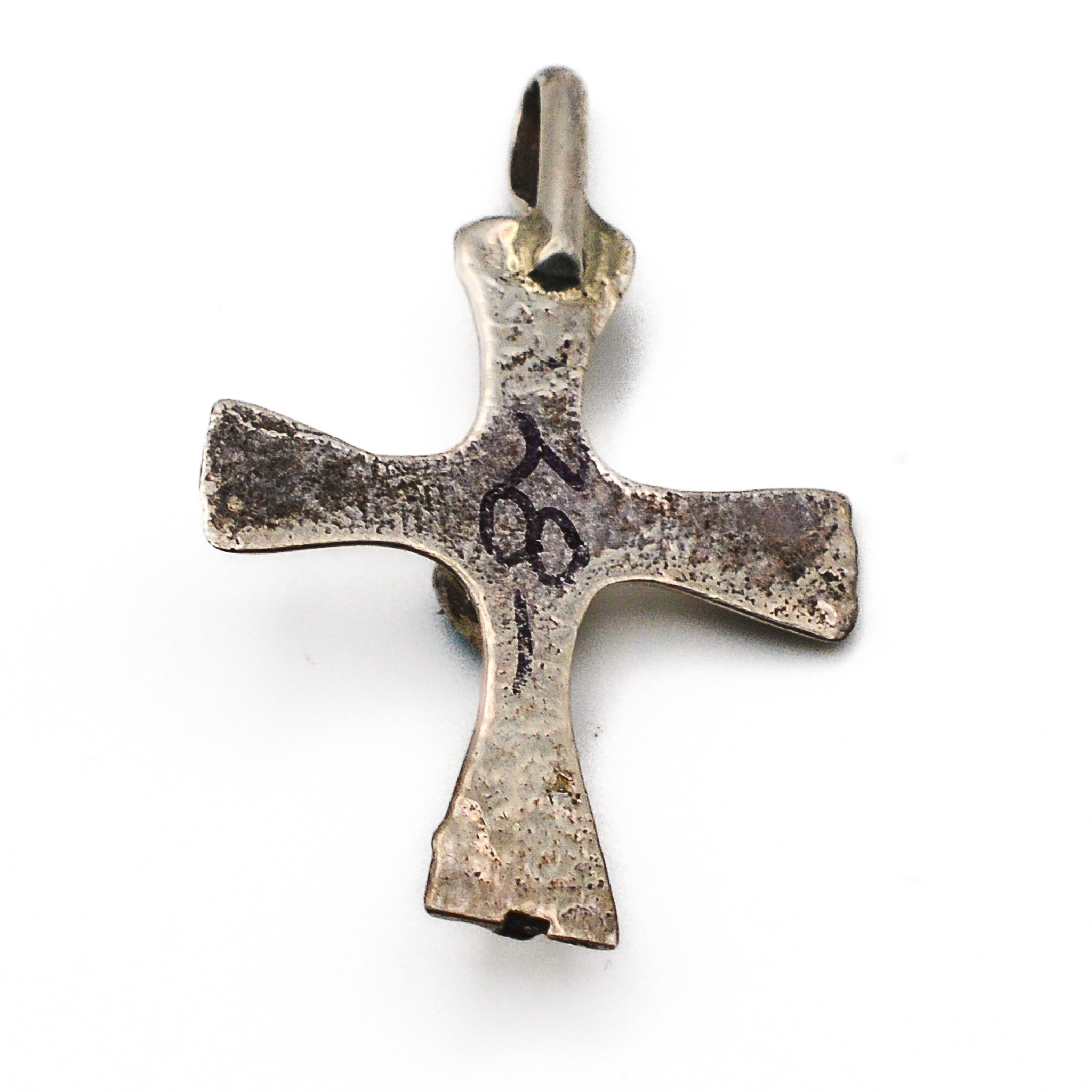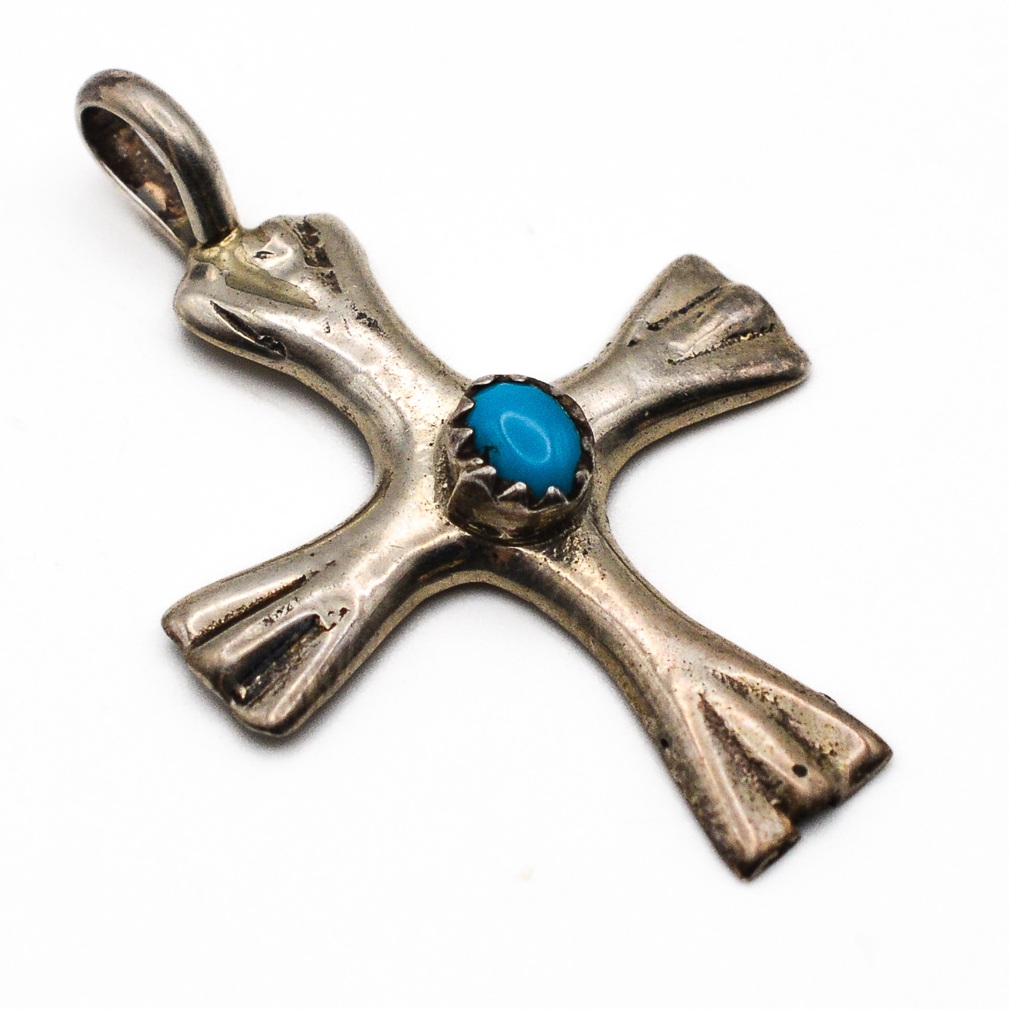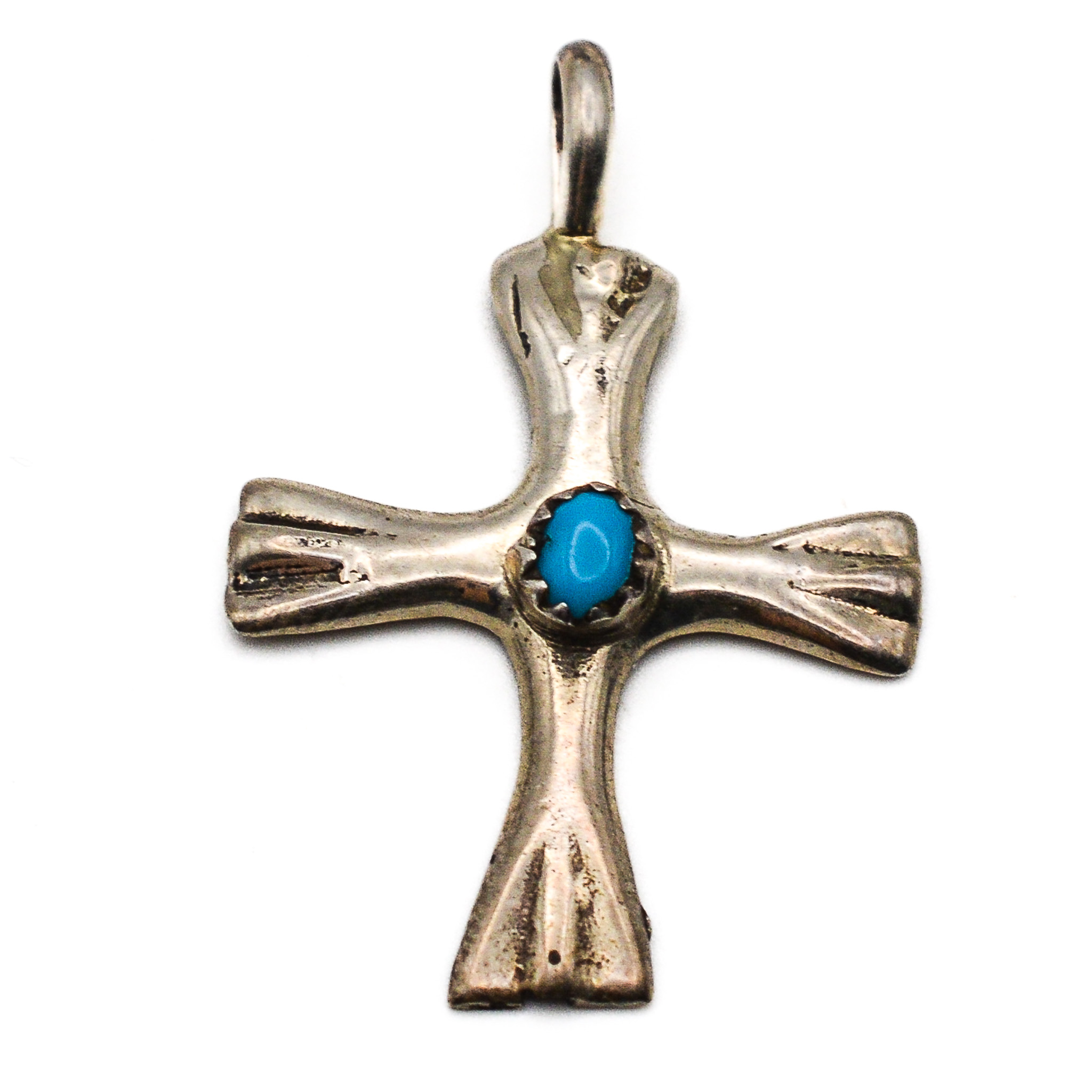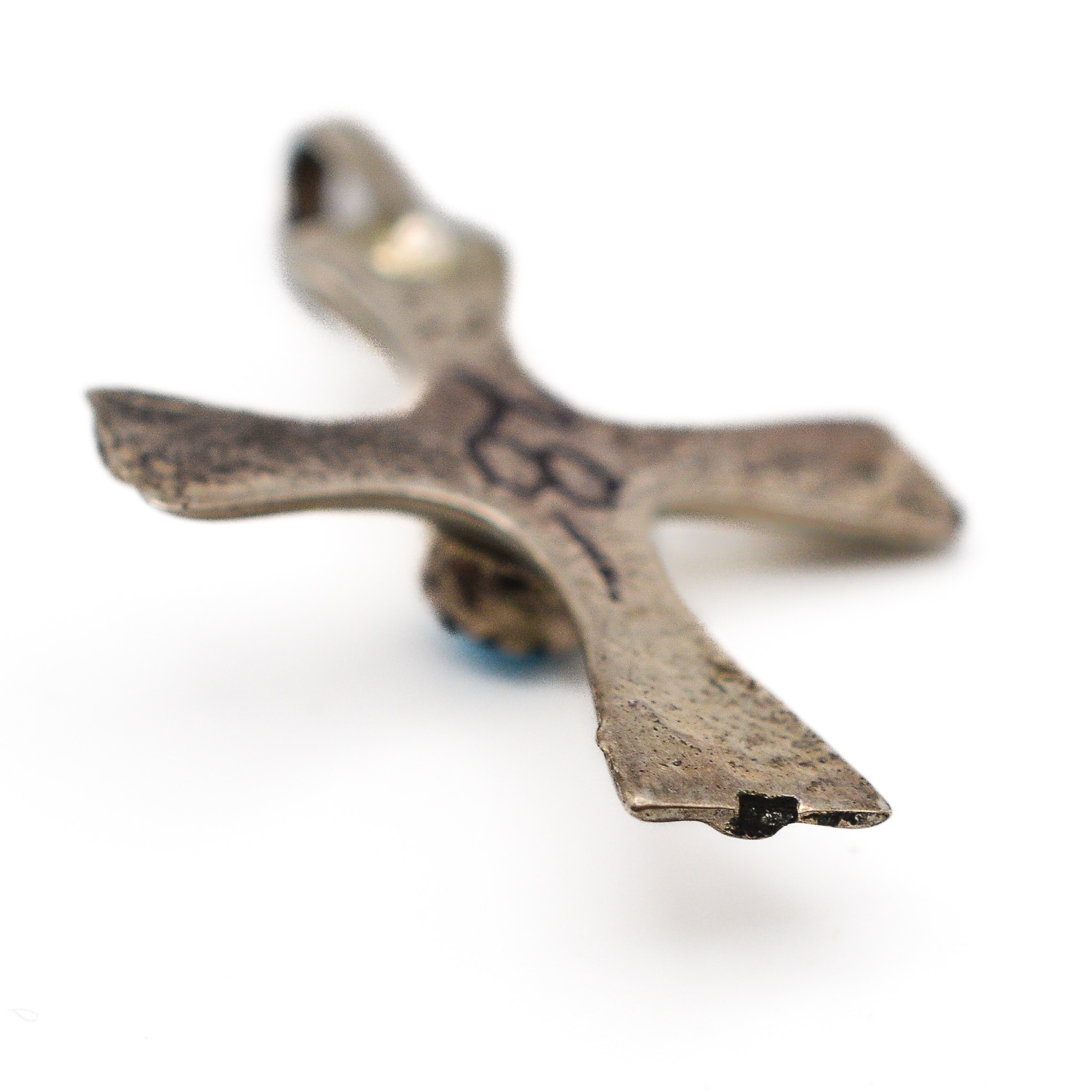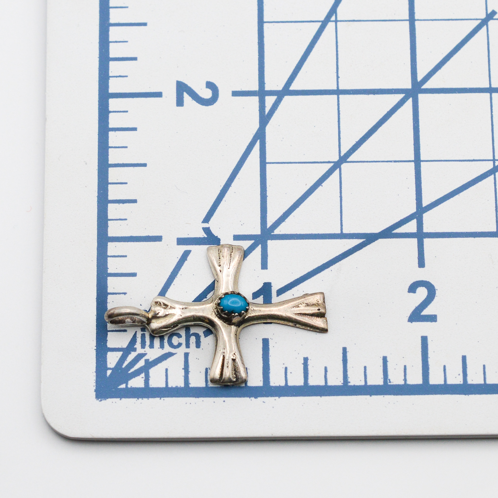 Vintage Navajo Turquoise Sandcast Sterling Cross Pendant 3g, small chip in bottom of cross- as shown in photos
