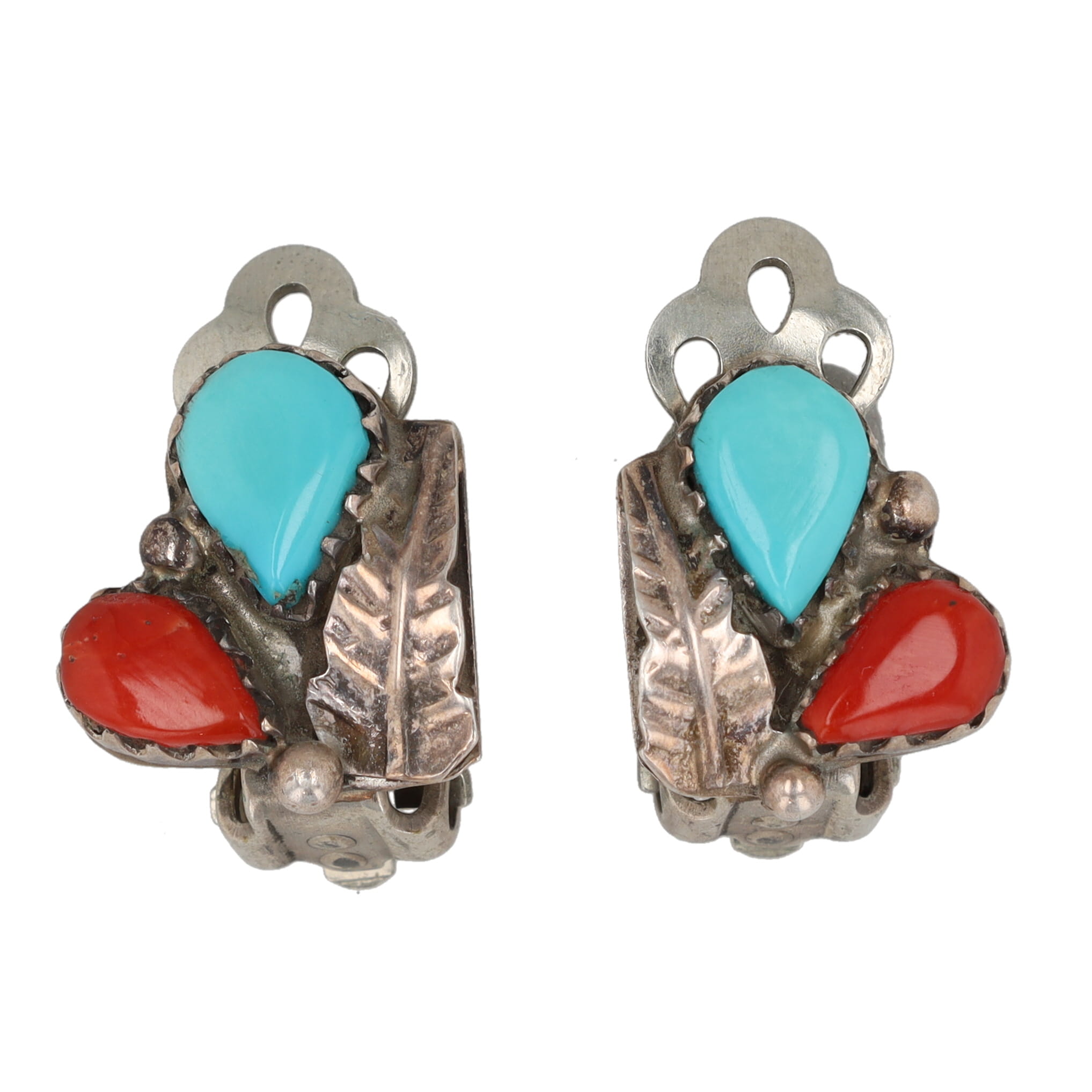 Vintage Navajo Turquoise Coral Sterling Clip On Earrings 3g