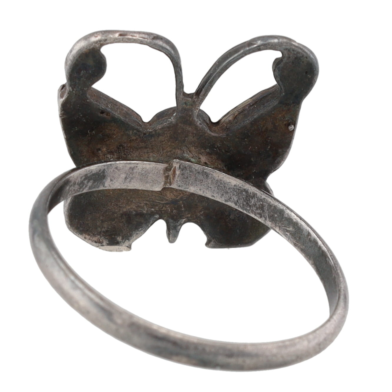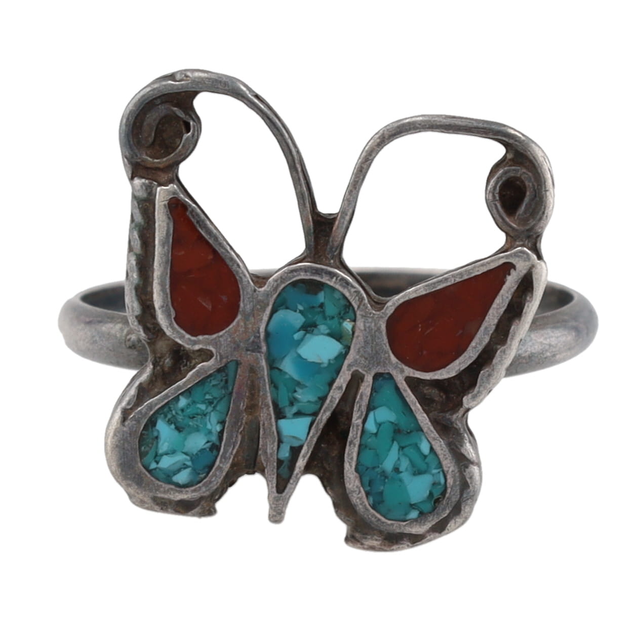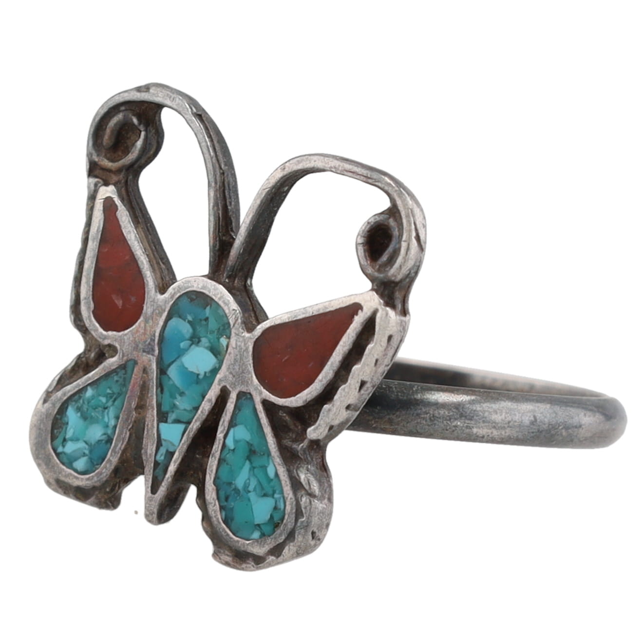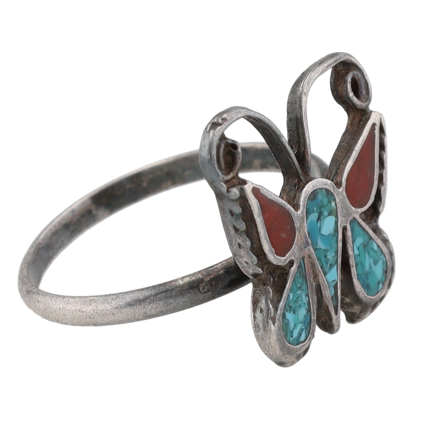 Vintage Navajo Crushed Turquoise Coral Sterling Butterfly Ring Sz. 9, 3g