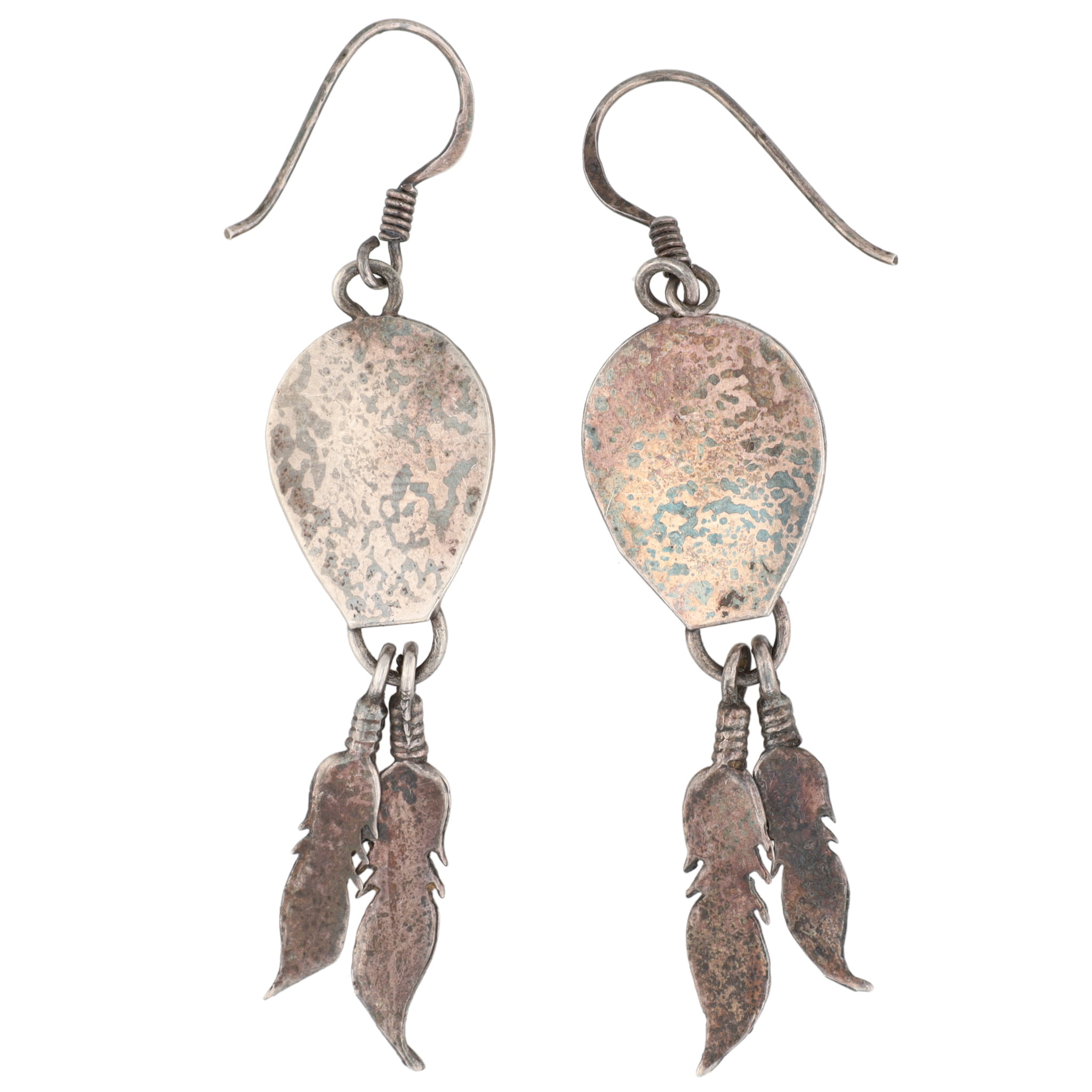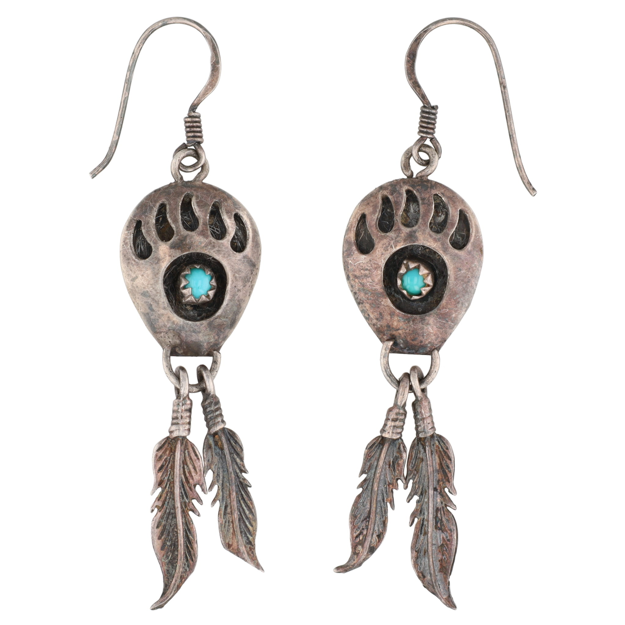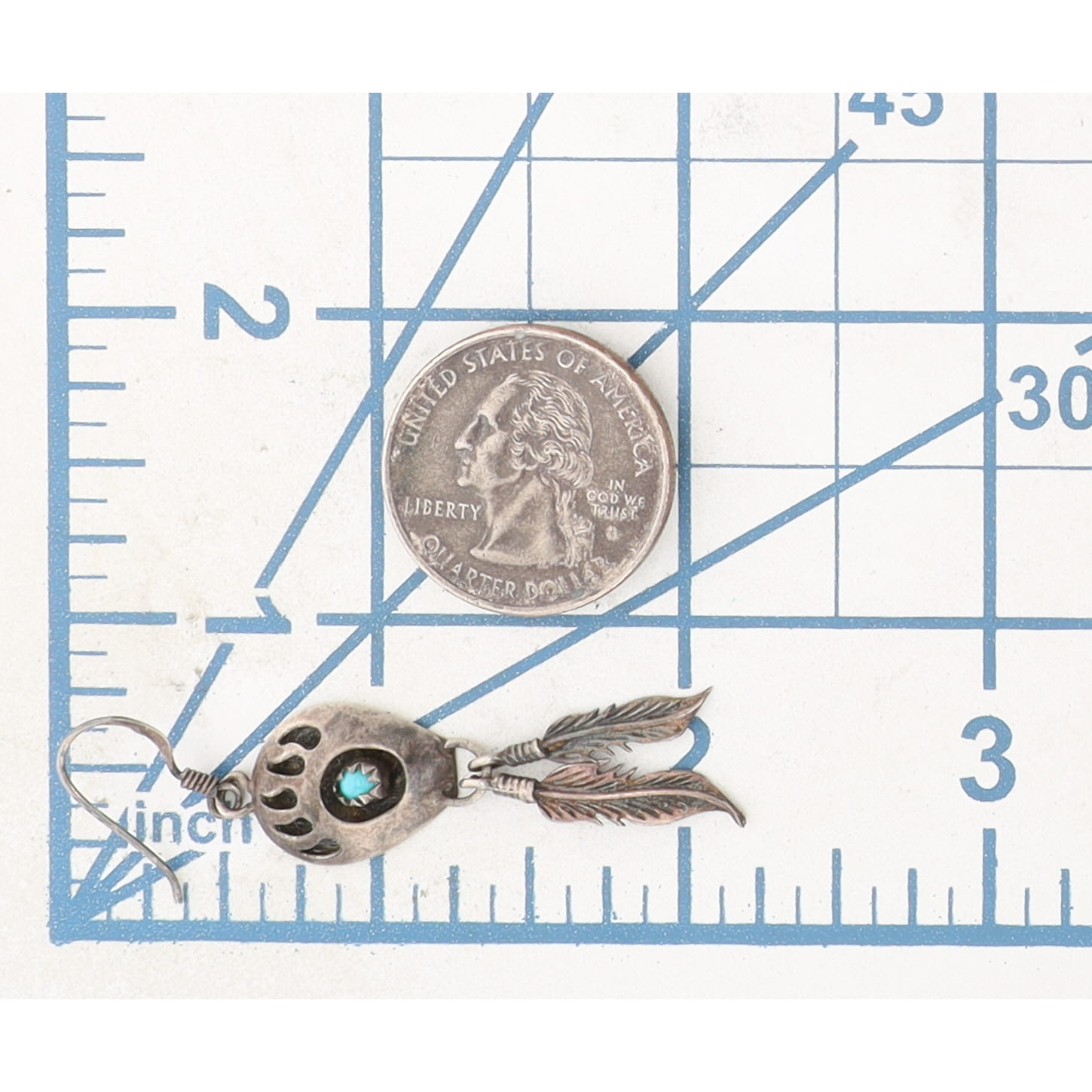 Vintage Navajo Turquoise Sterling Bear Paw Feather Dangle Earrings 4.5g