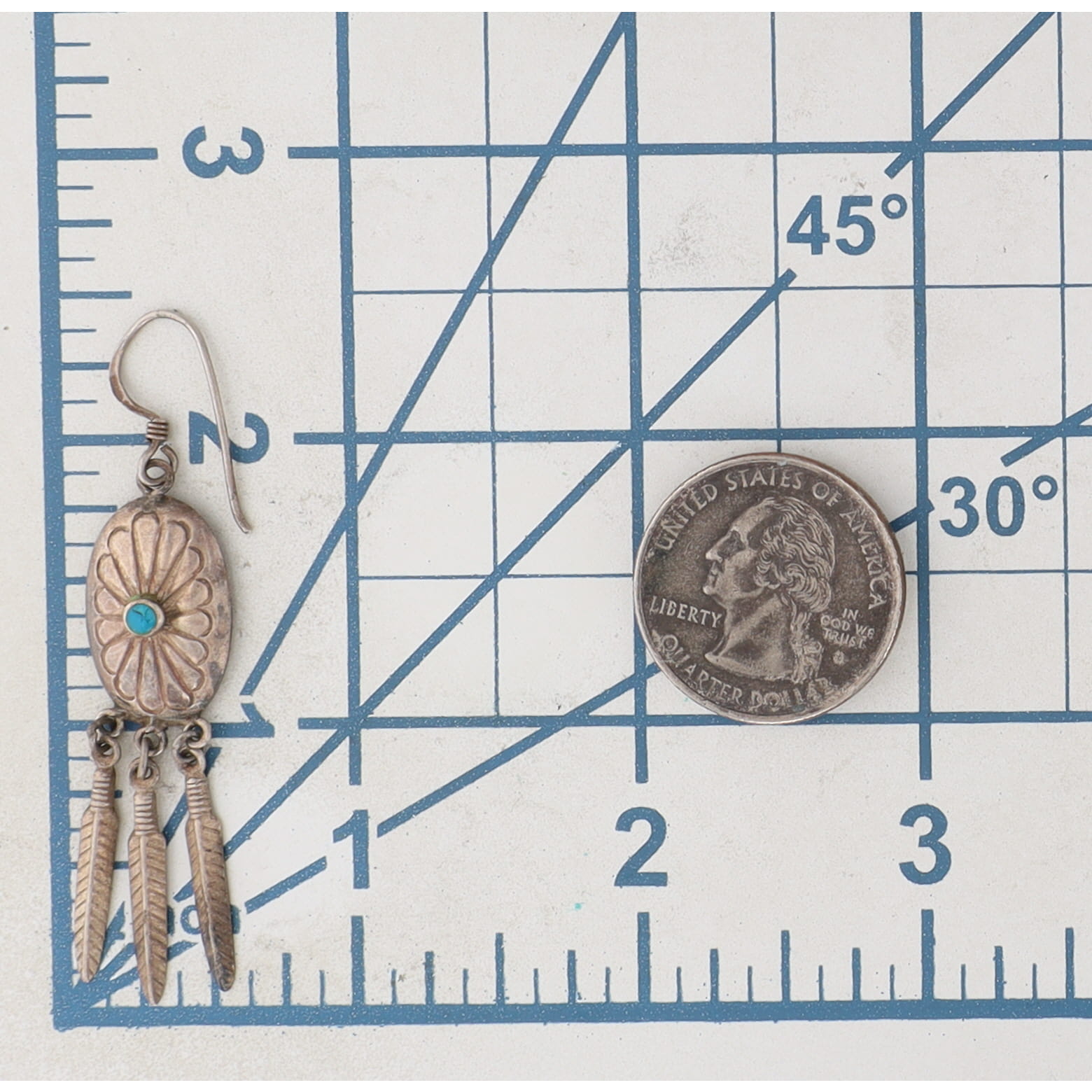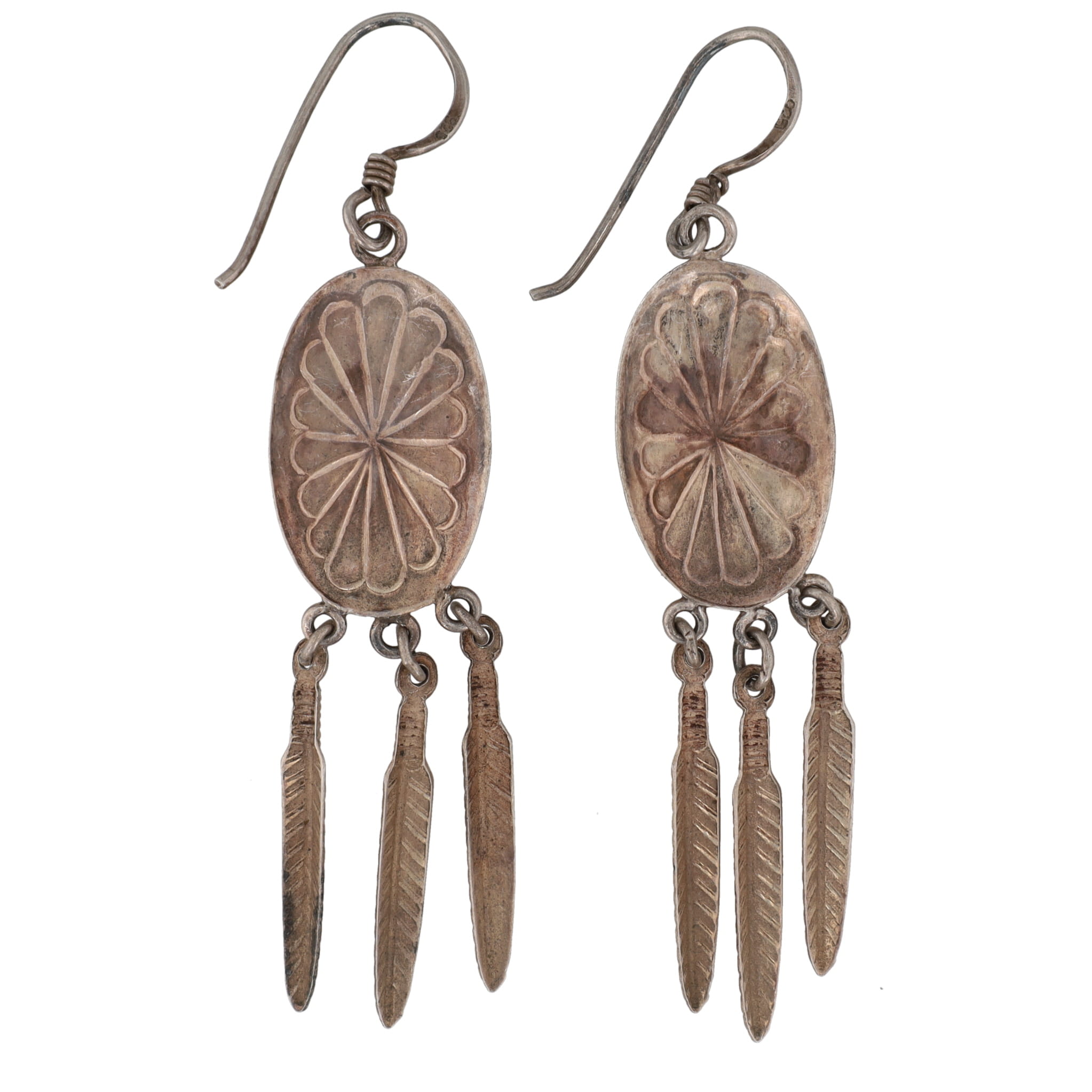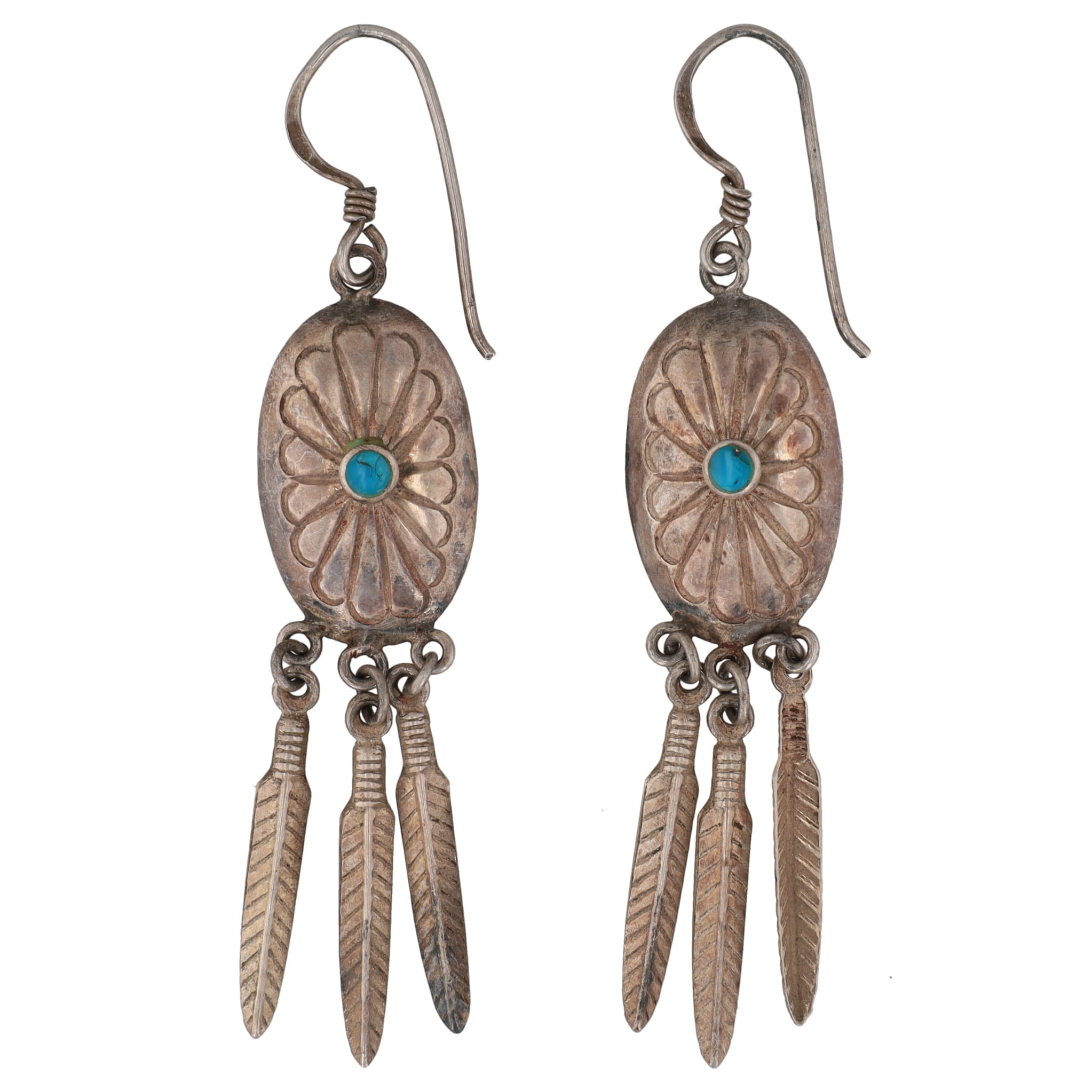 Vintage Navajo Turquoise Sterling Concho Feather Dangle Earrings 4g