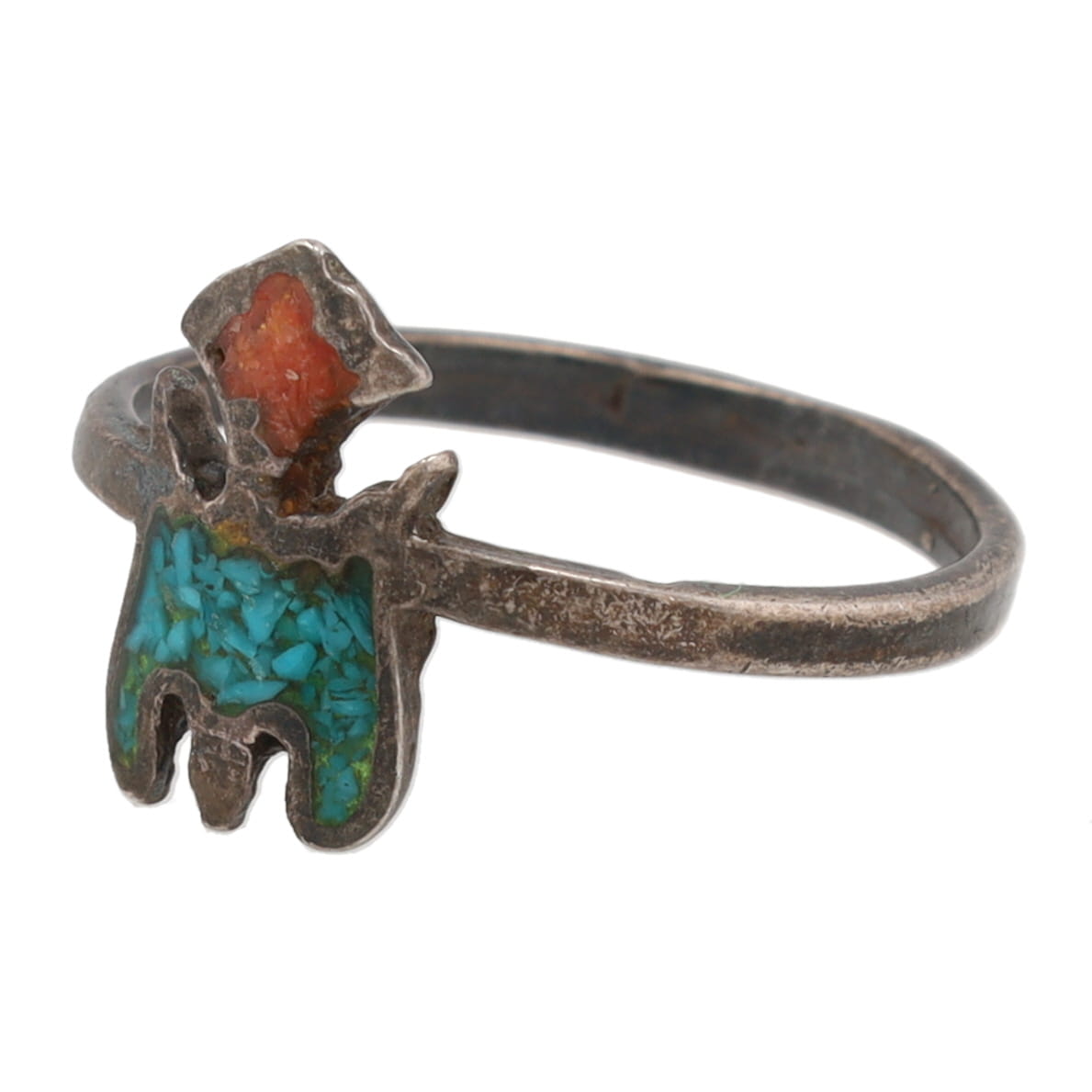 Vintage Navajo Sterling Crushed Turquoise Coral Thunderbird Ring Sz. 5.25