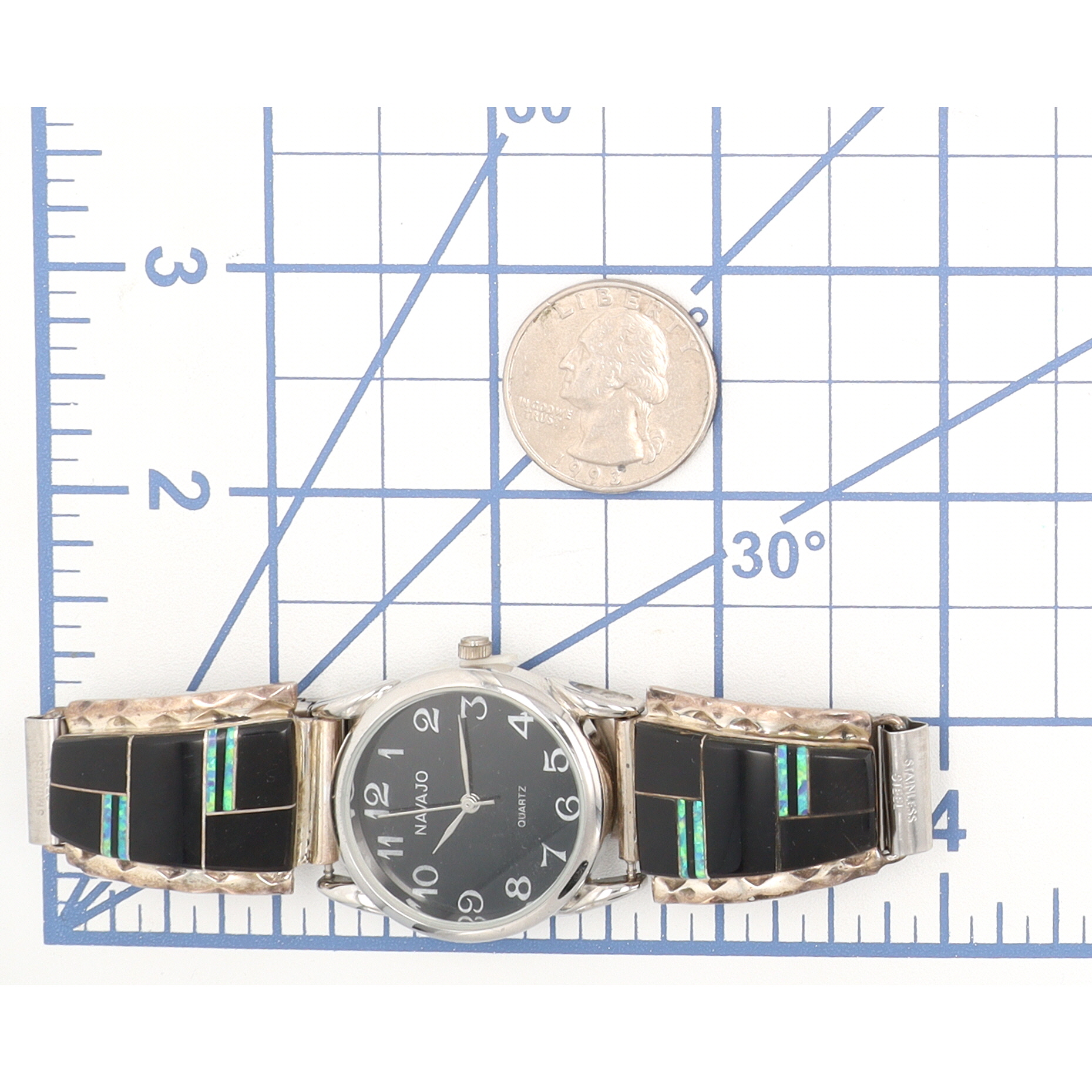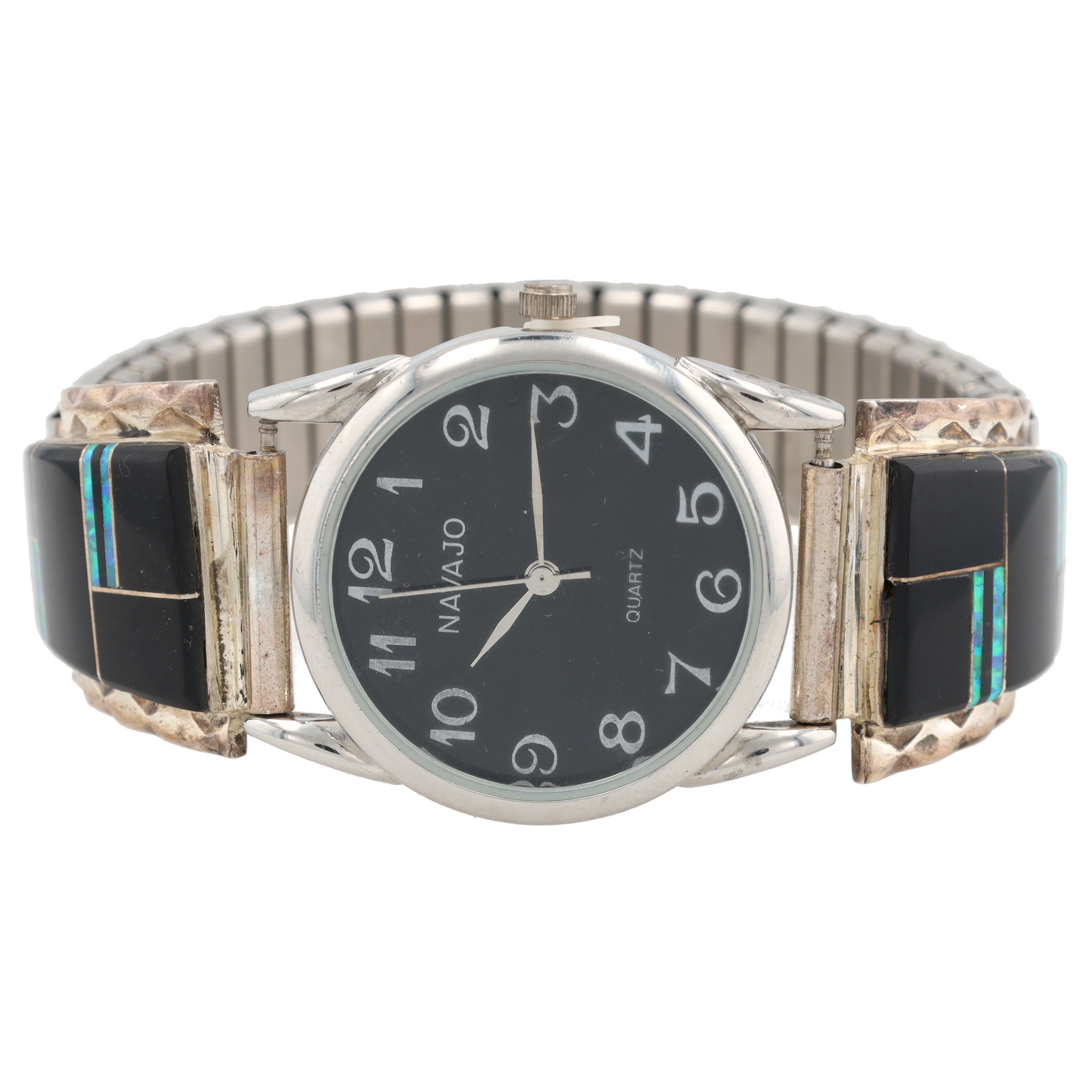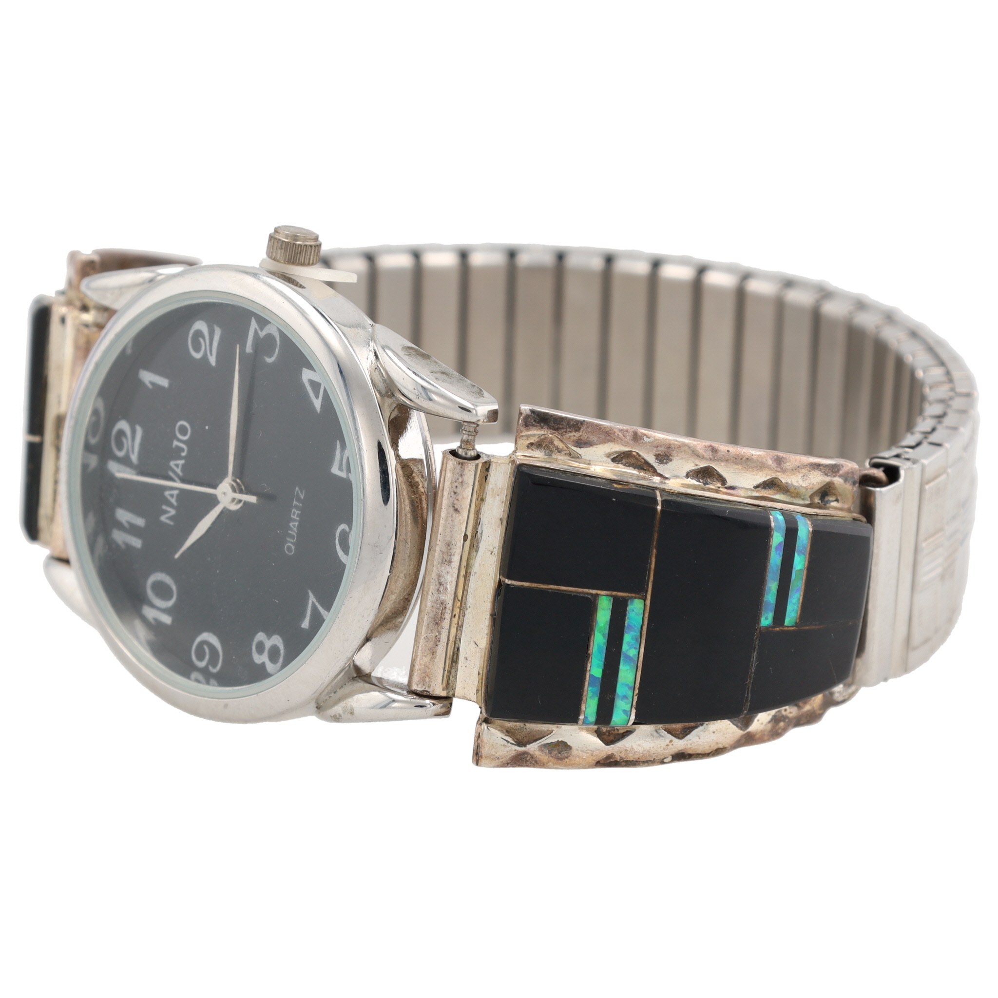 Navajo Sterling Onyx Opal Inlay Watch Nibs Japanese Watch 52.5g