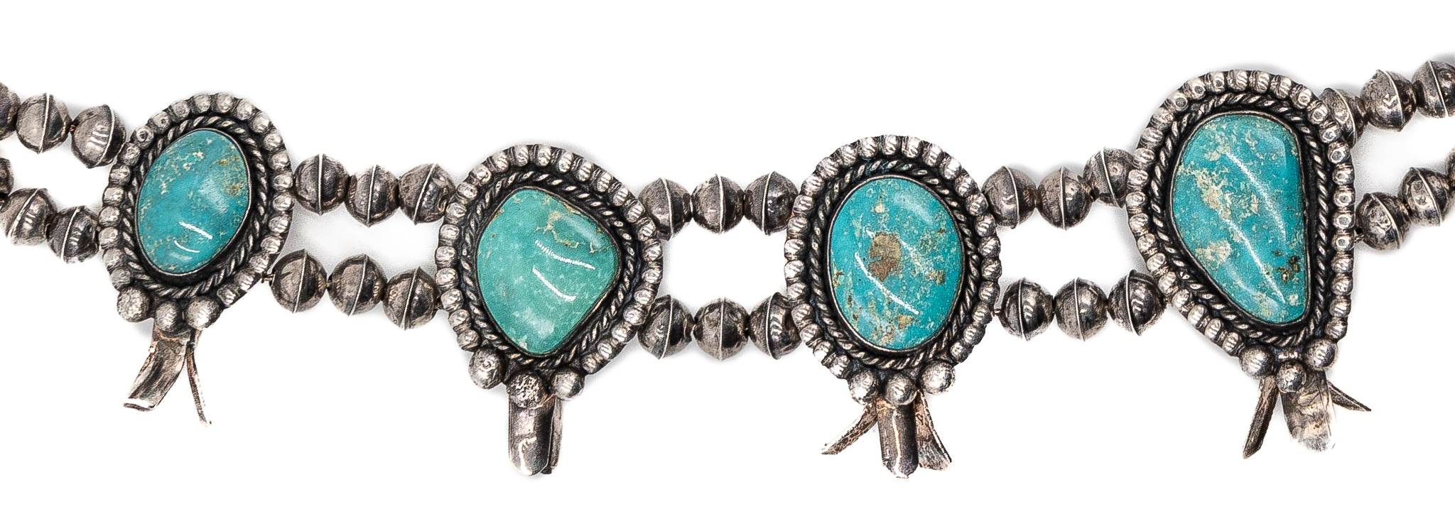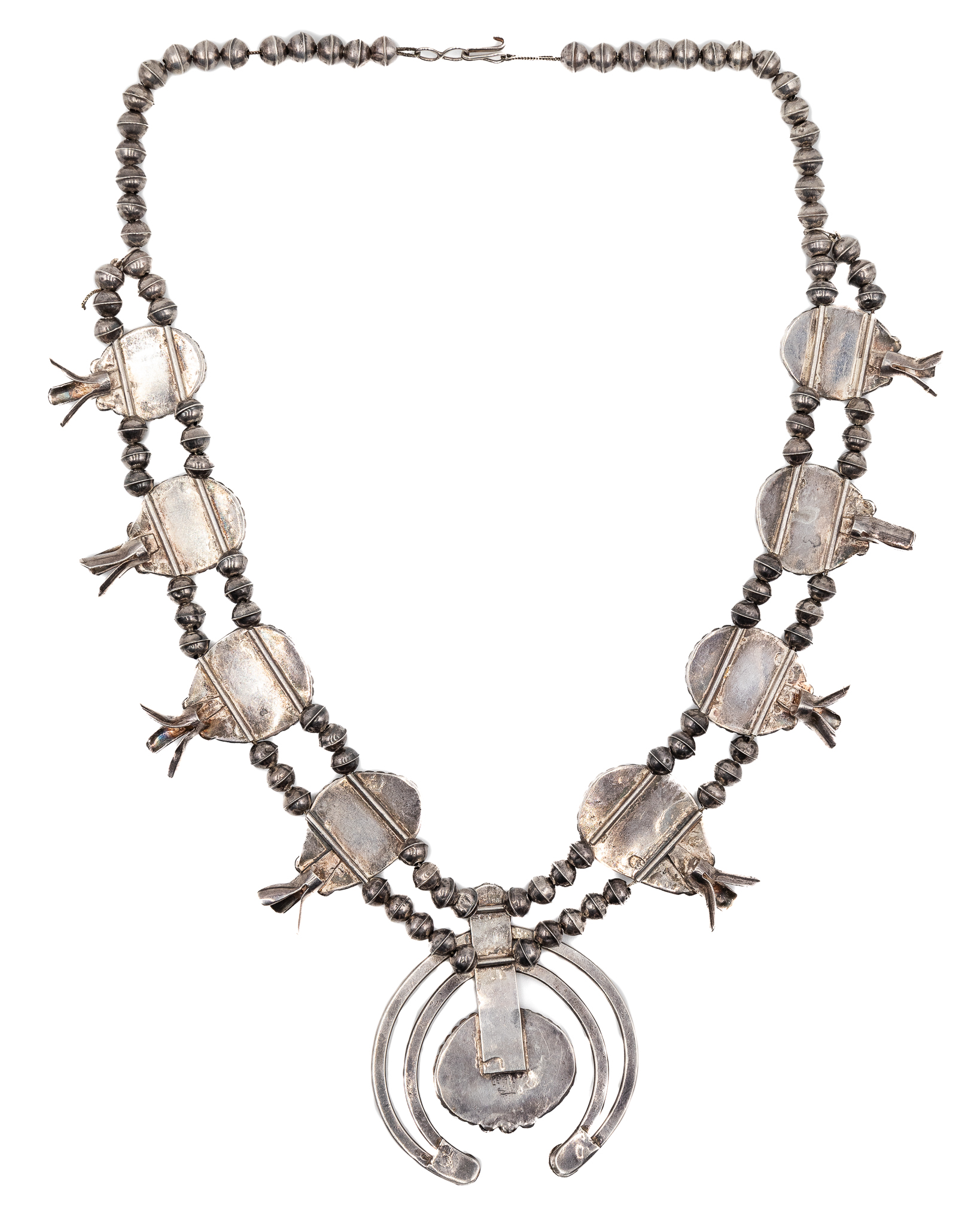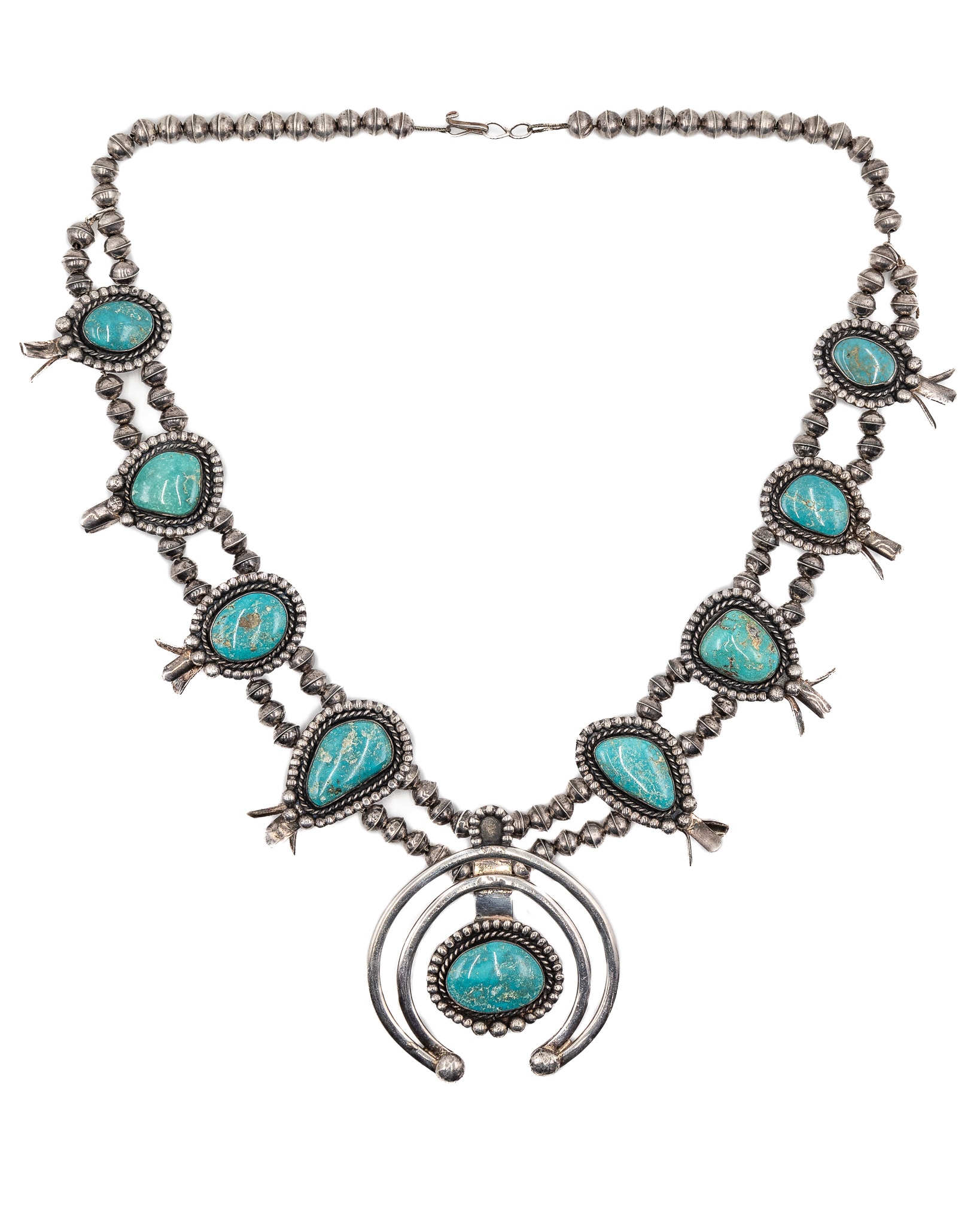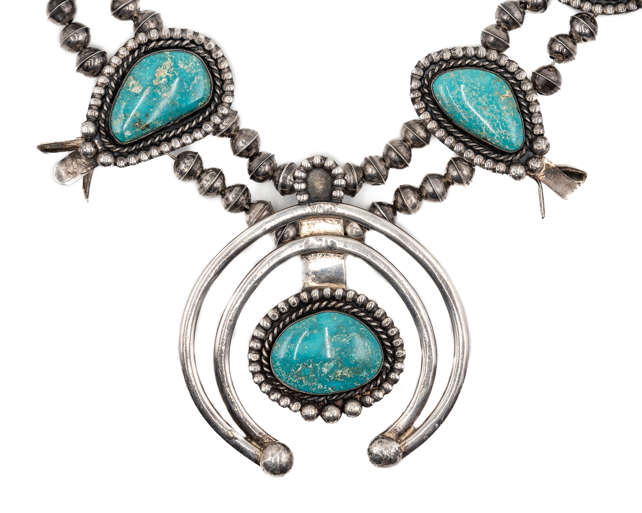 Huge Signed Navajo Sterling Turquoise Squash Blossom Necklace 210g