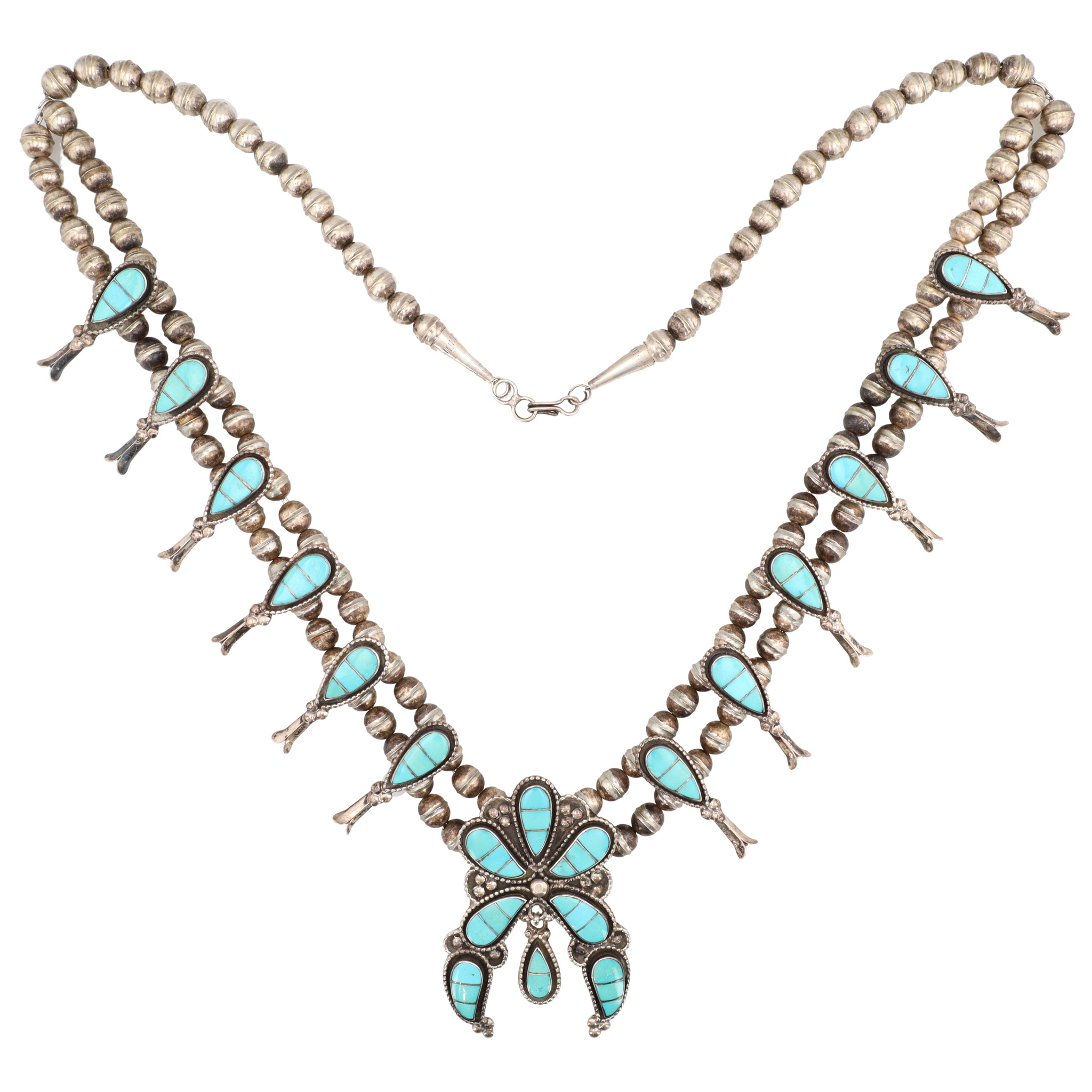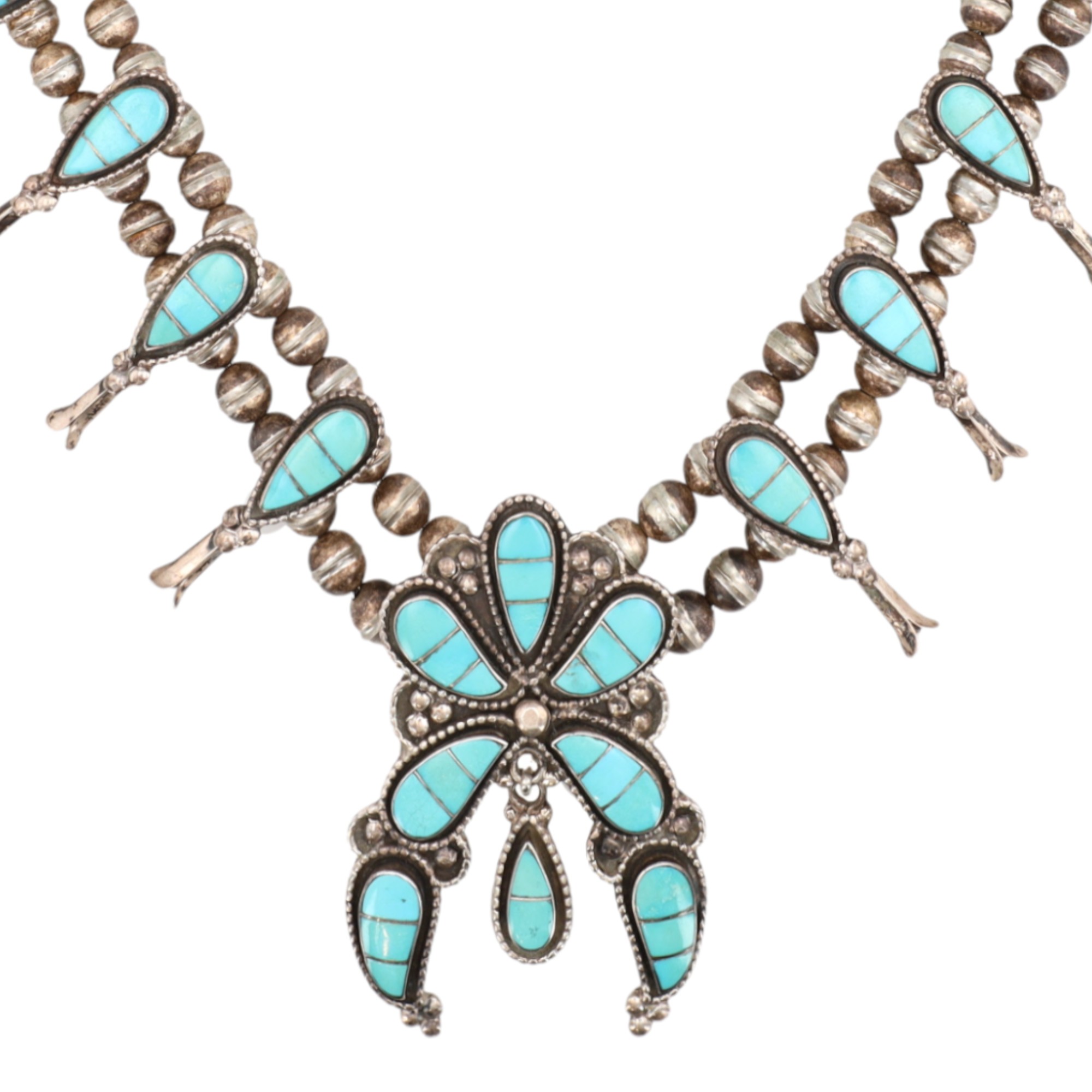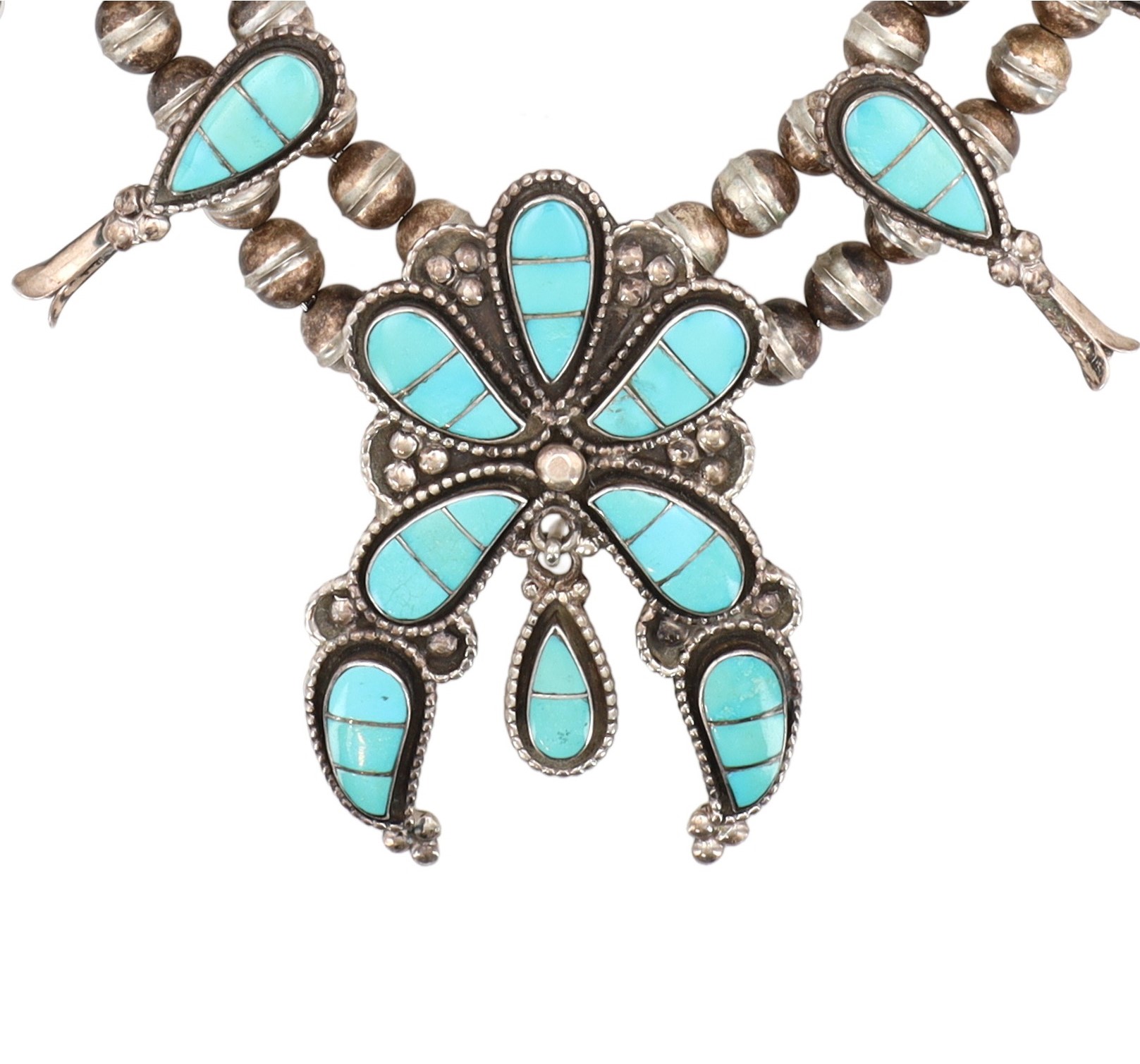Willis & Susan Leekity Zuni Sterling Hummingbird Turquoise Inlay Squash Blossom Necklace 85g