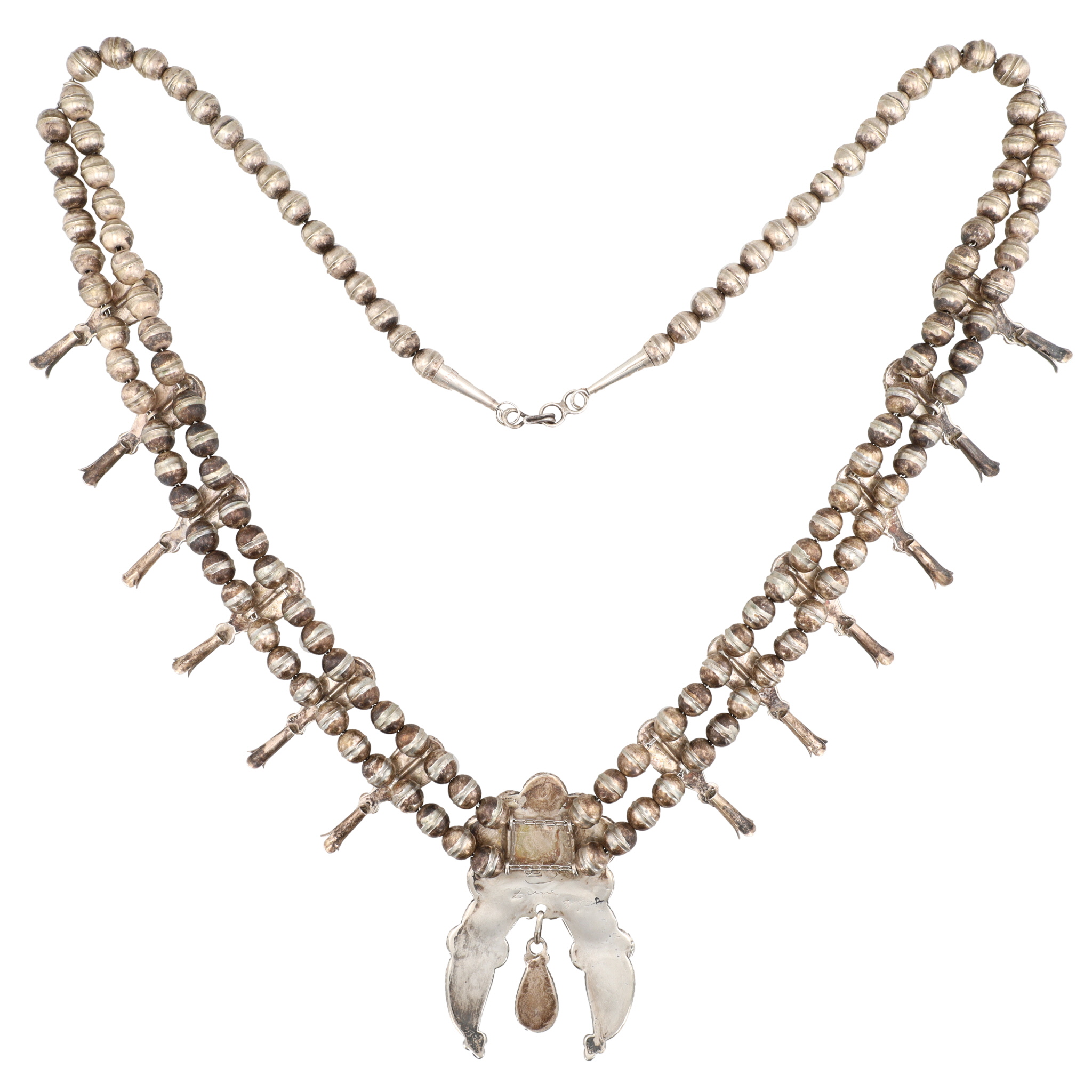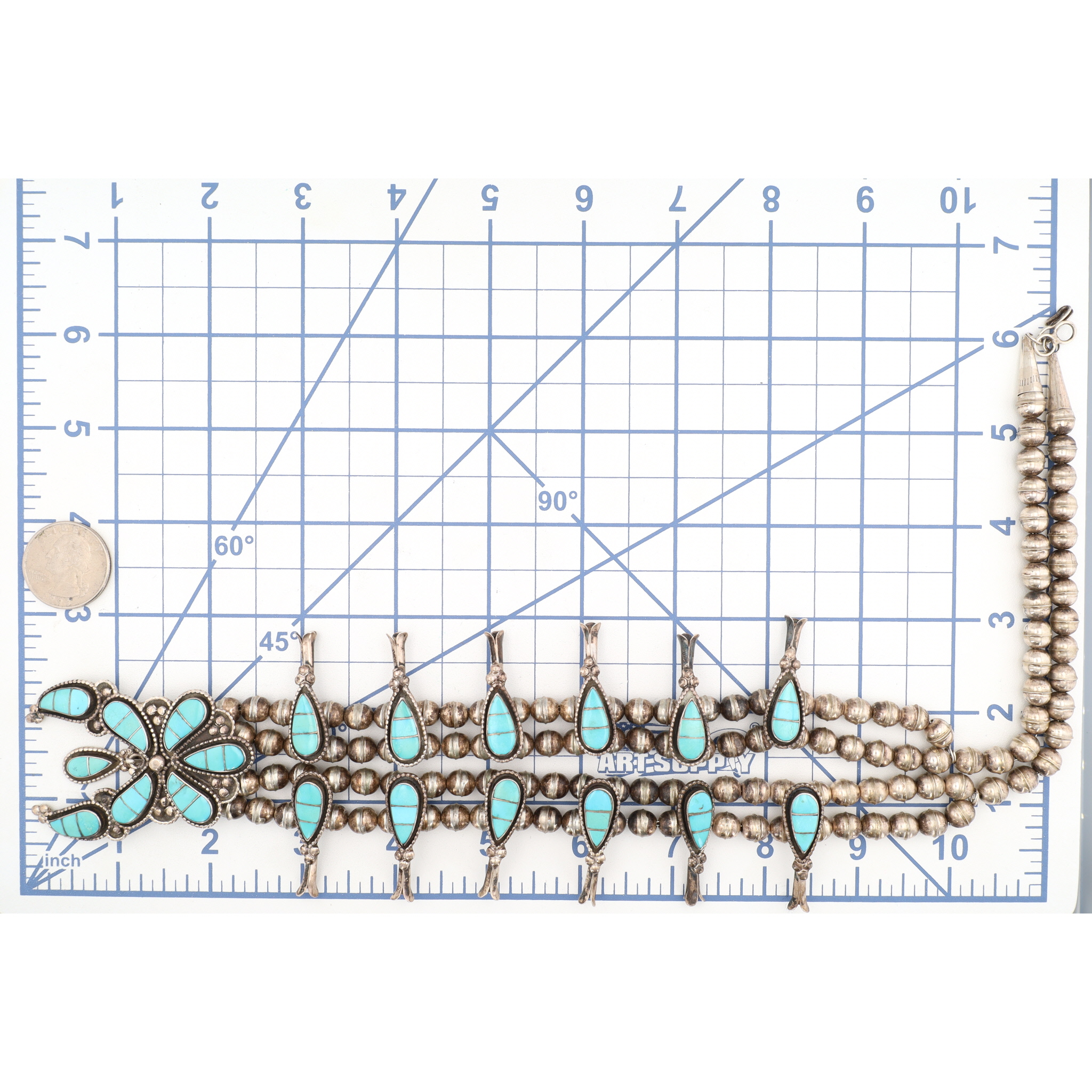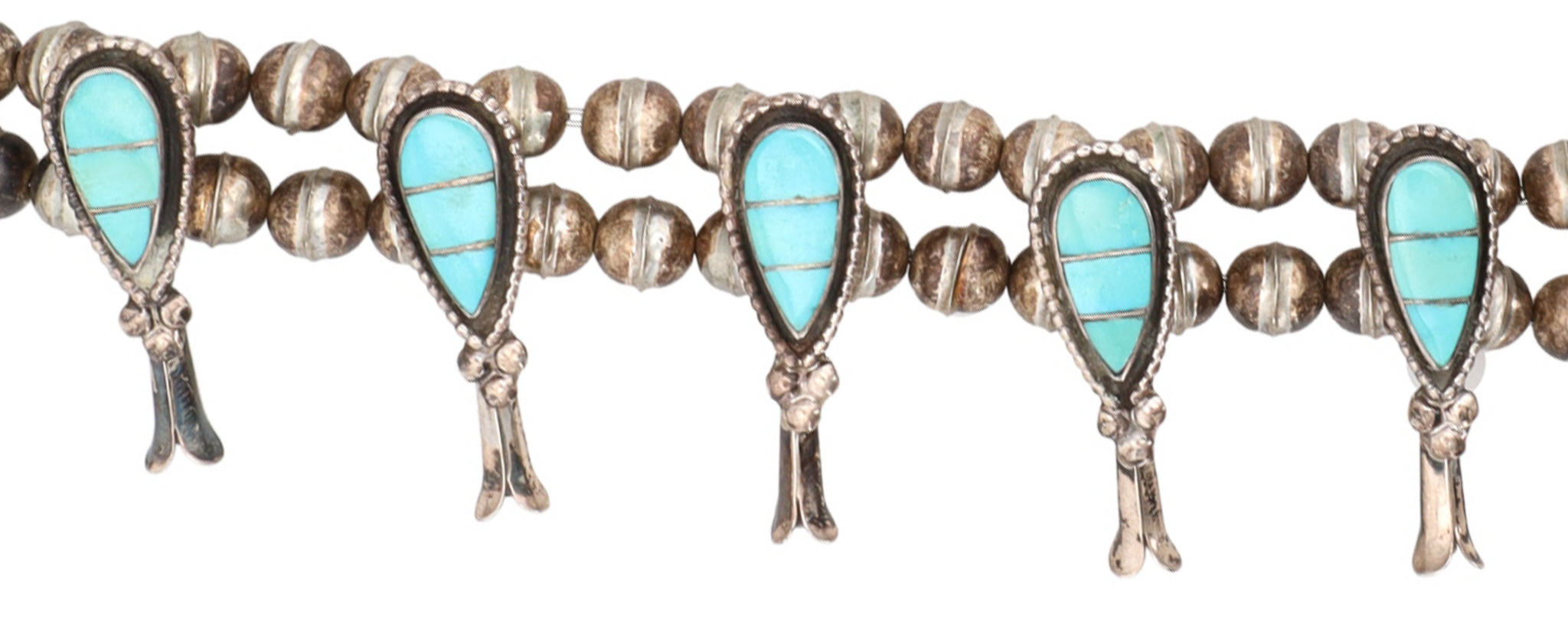 Willis & Susan Leekity Zuni Sterling Hummingbird Turquoise Inlay Squash Blossom Necklace 85g