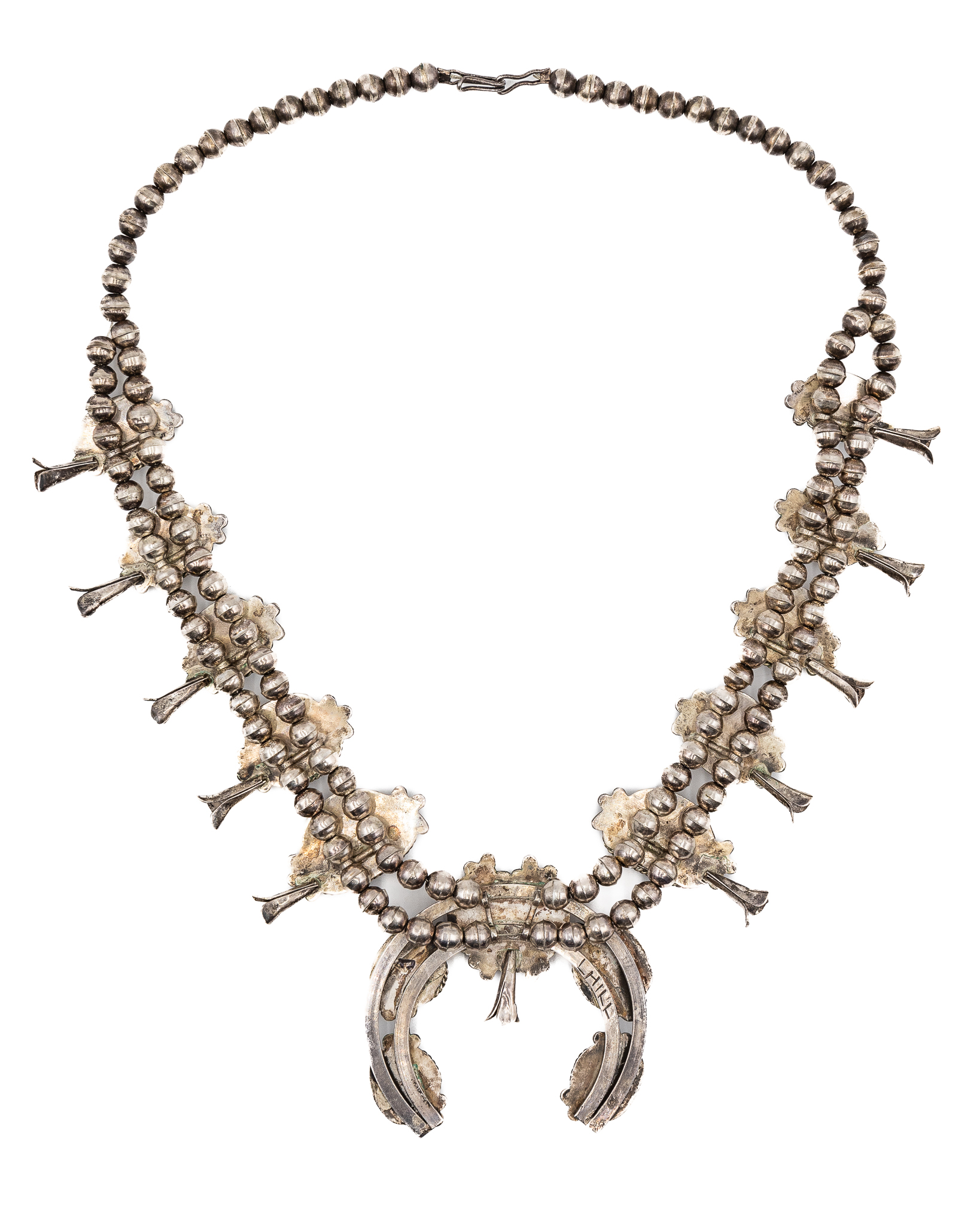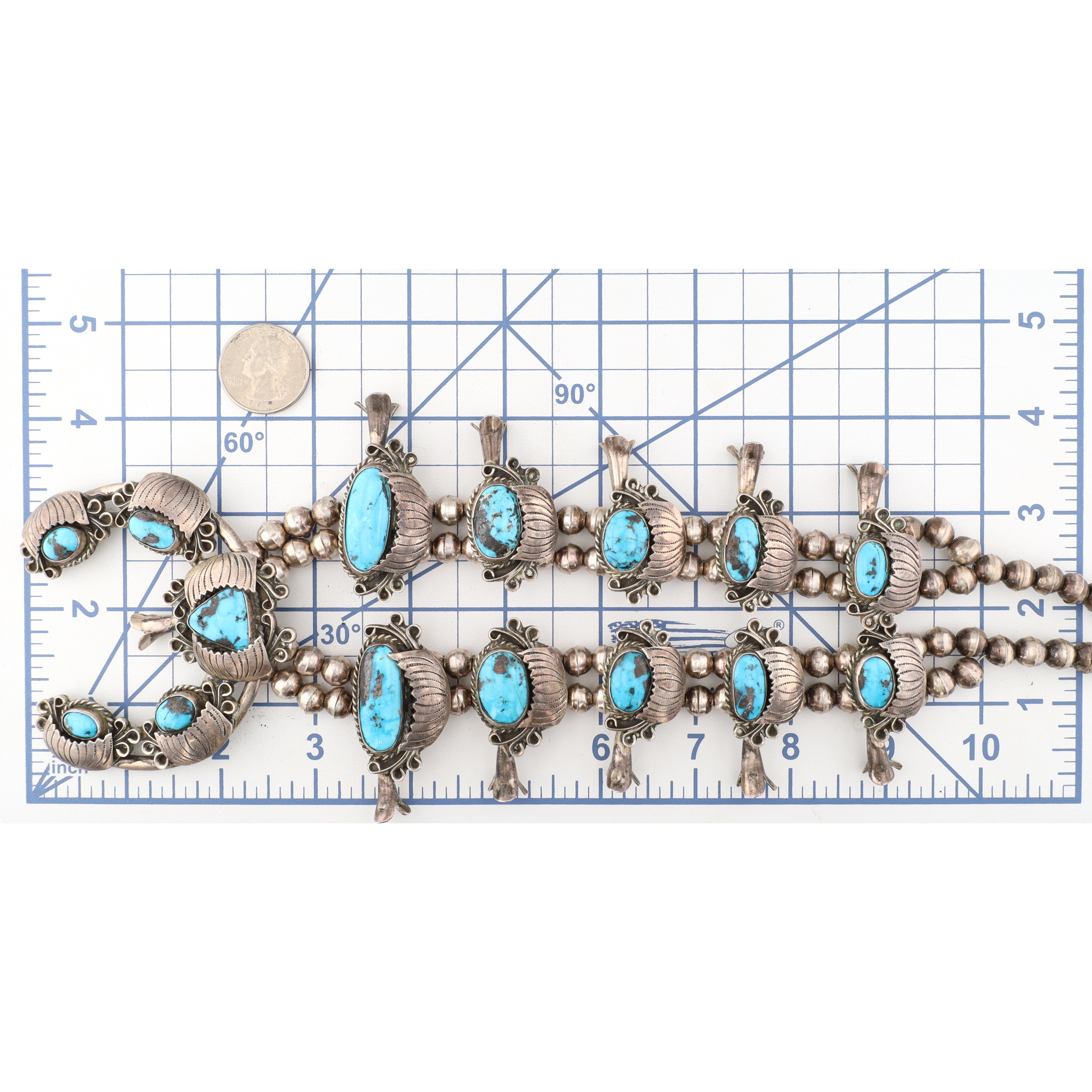 Signed Navajo Sterling Morenci Turquoise Squash Blossom Necklace 217g