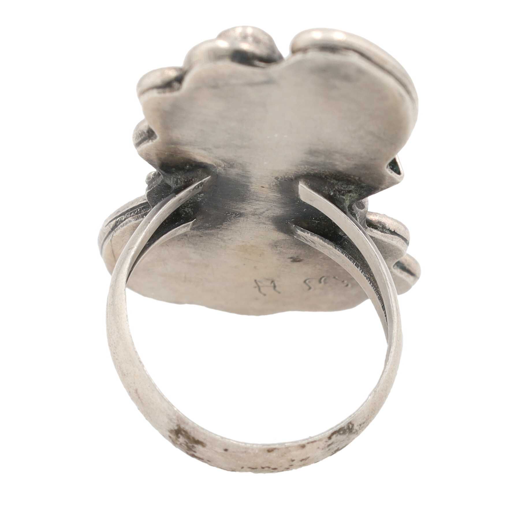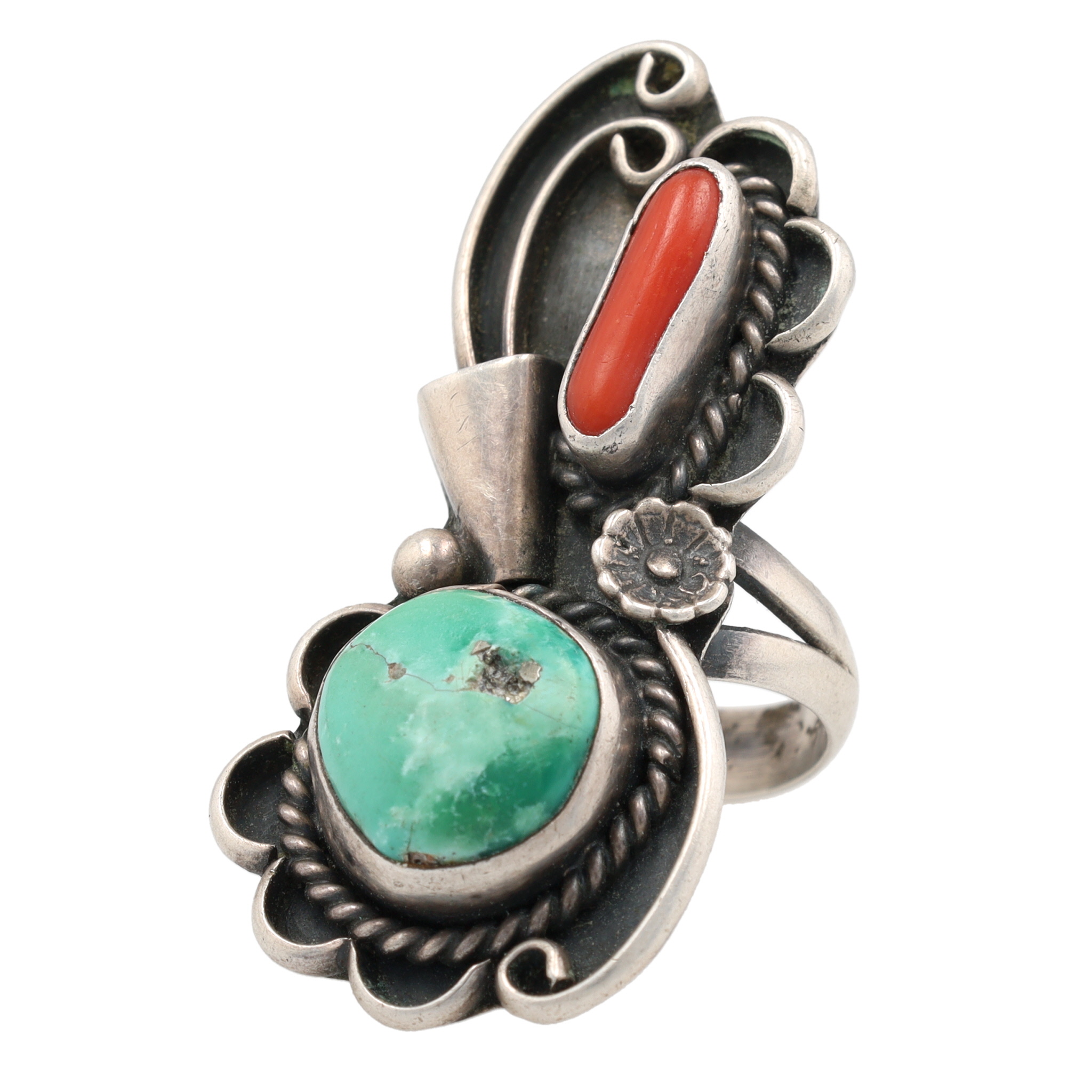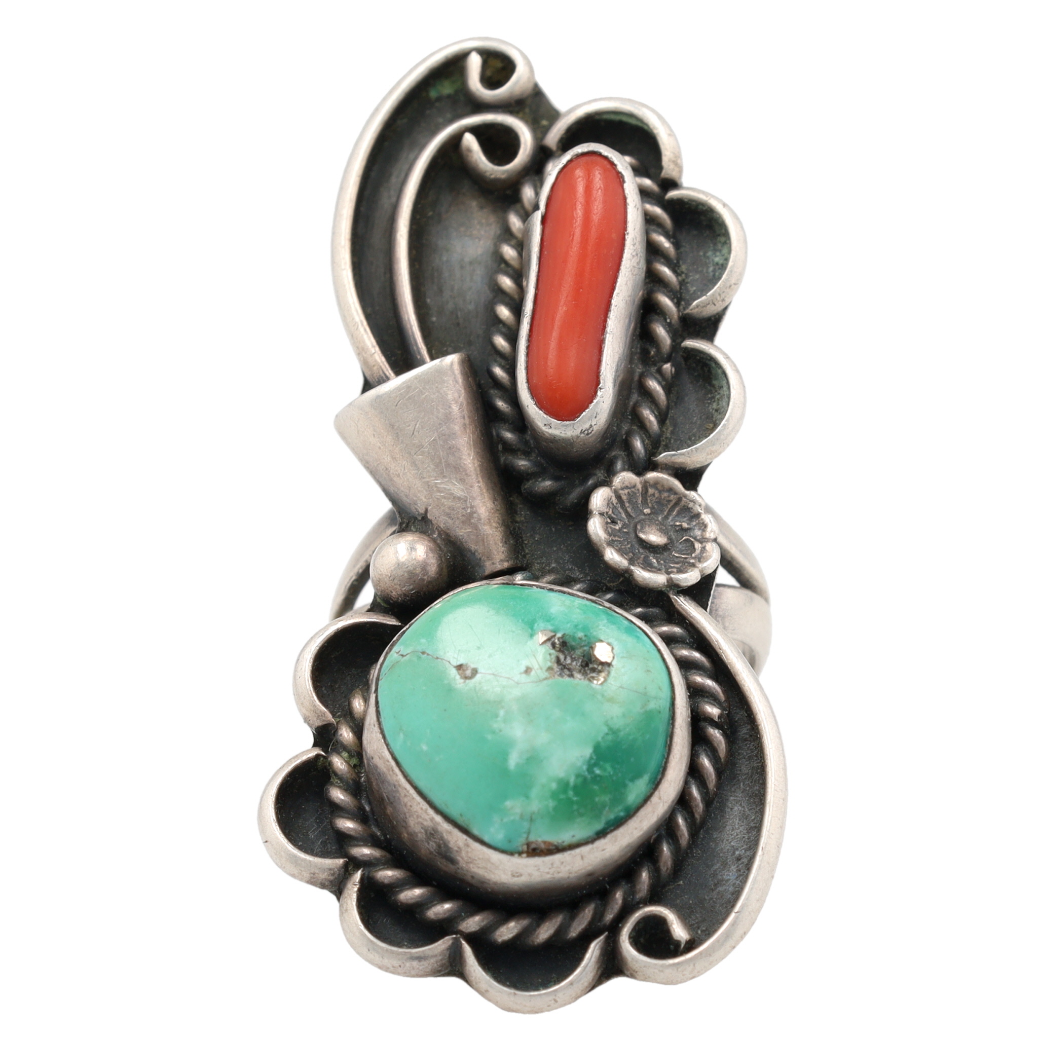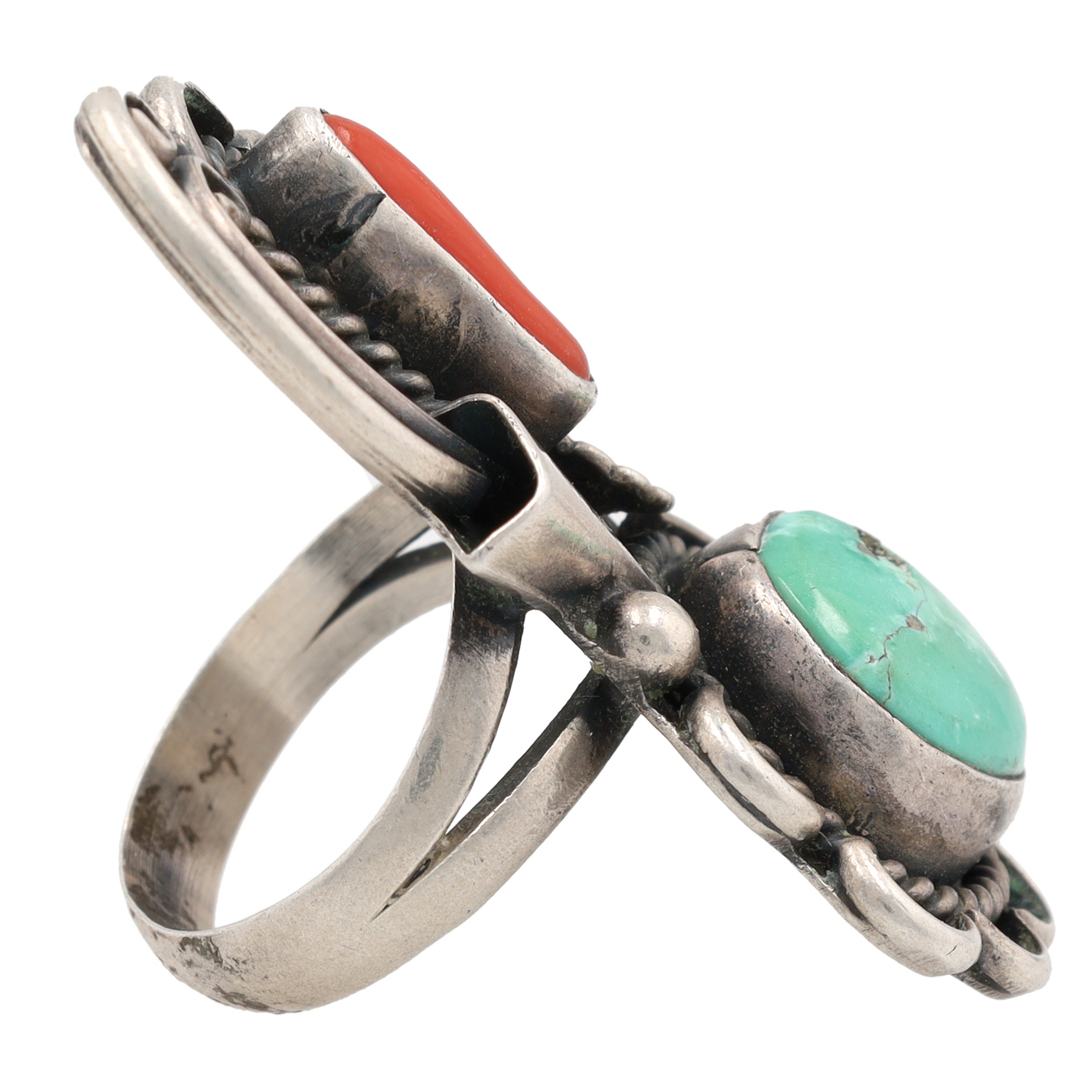 Hand Signed WH Navajo Sterling Coral Turquoise Blossom Ring Sz. 5.75, 10g