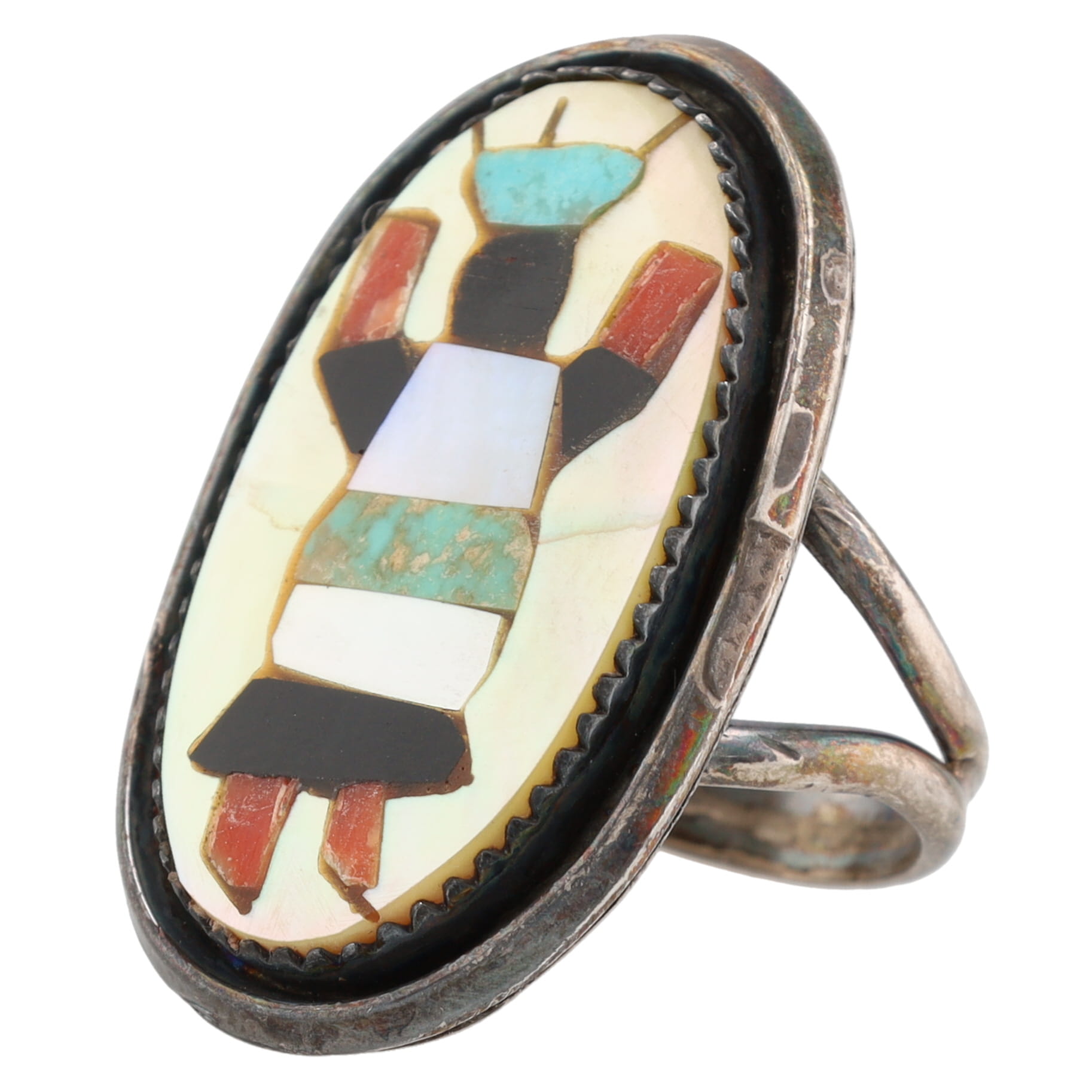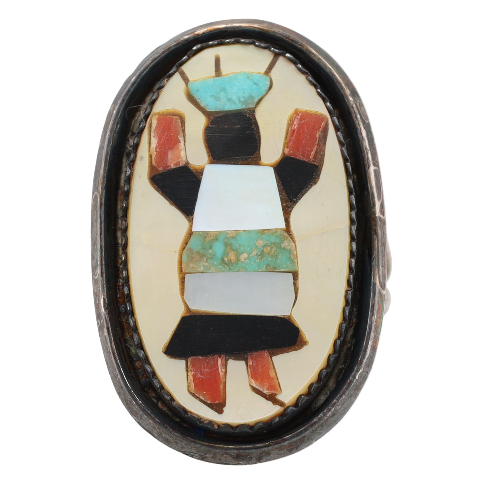 Vintage Zuni Sterling Multi Stone Kachina Inlay Ring Sz. 8.5, 9g