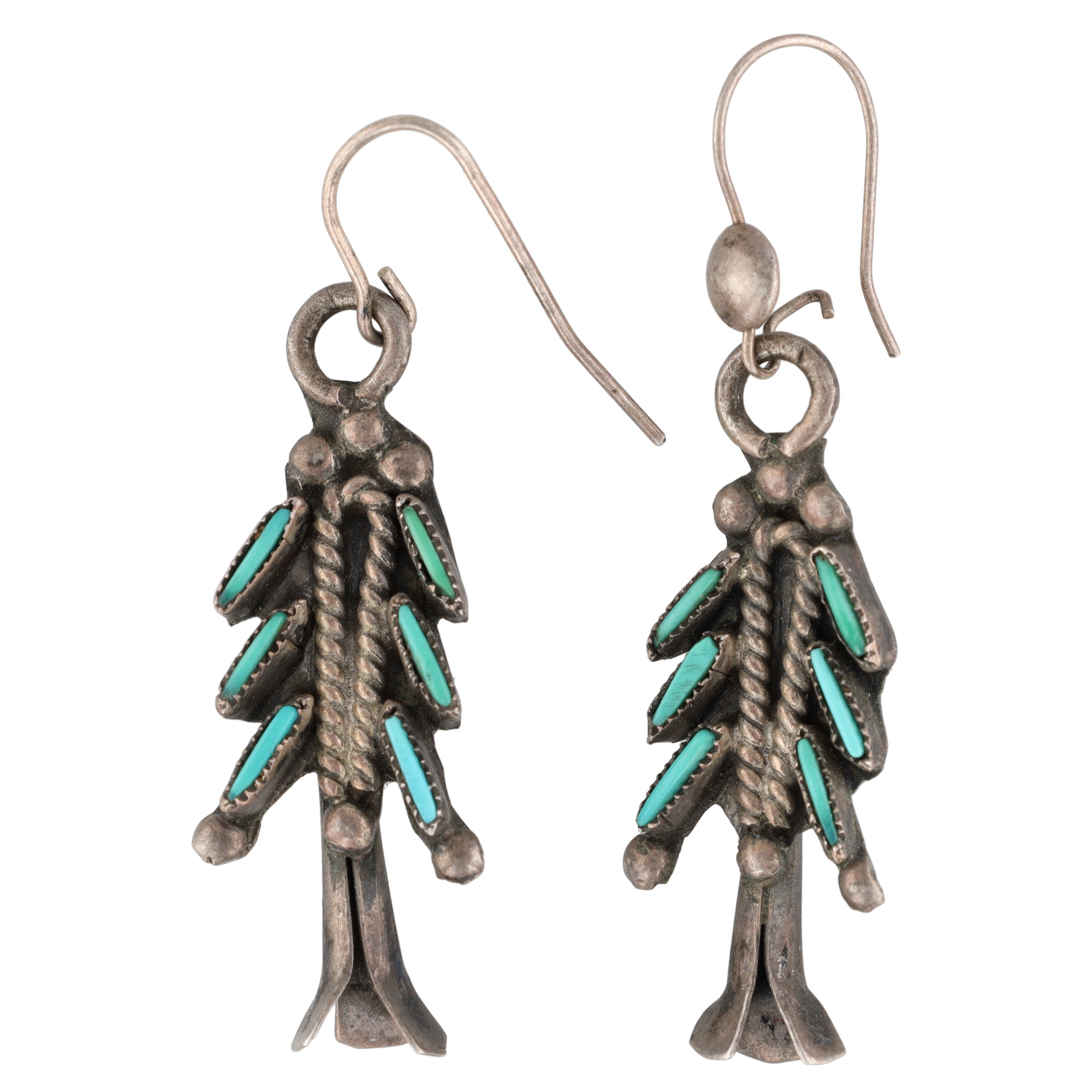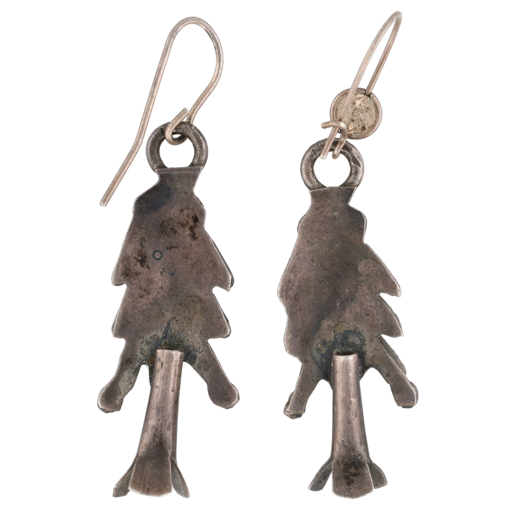 Lorraine Kendy Zuni Sterling Needlepoint Turquoise Squash Blossom Earrings 5.5g, attributed to Lorraine Kendy as consignor reports they were given in a set with the signed Lorraine Kendy squash blossom necklace in lot 61.
