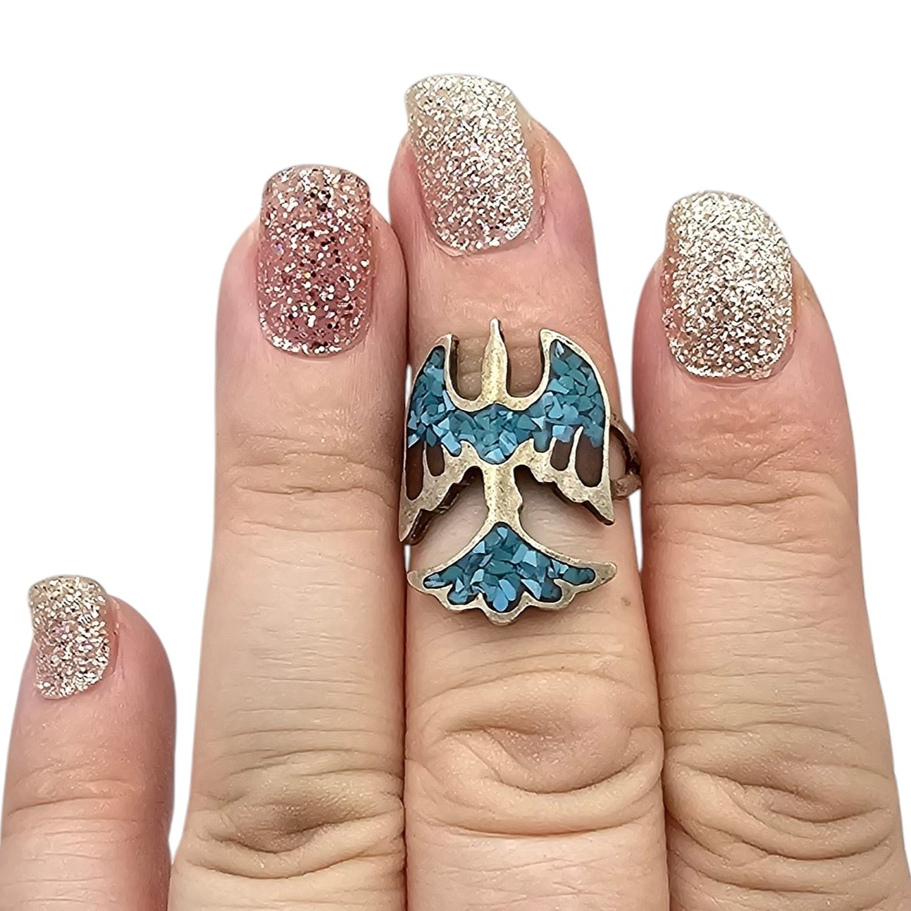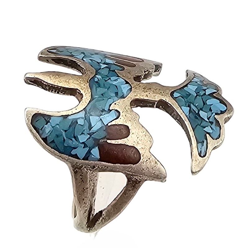 Native Crushed Turquoise Coral Sterling Silver Thunderbird Ring Size 6.25 4.4 G