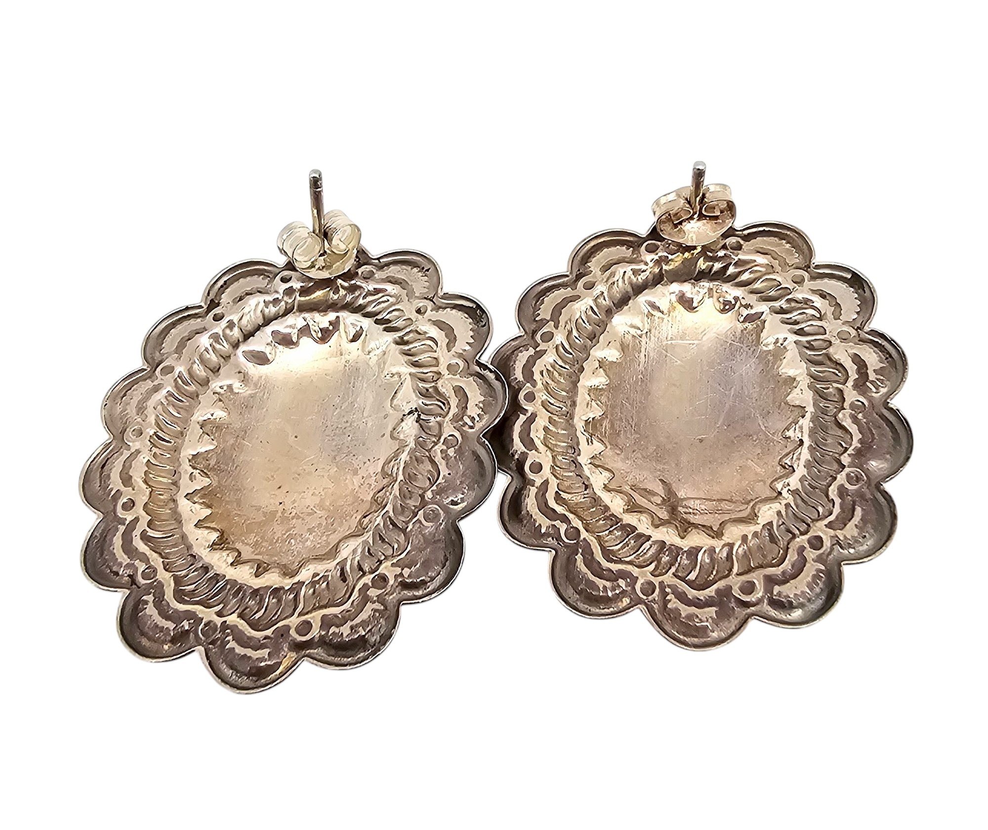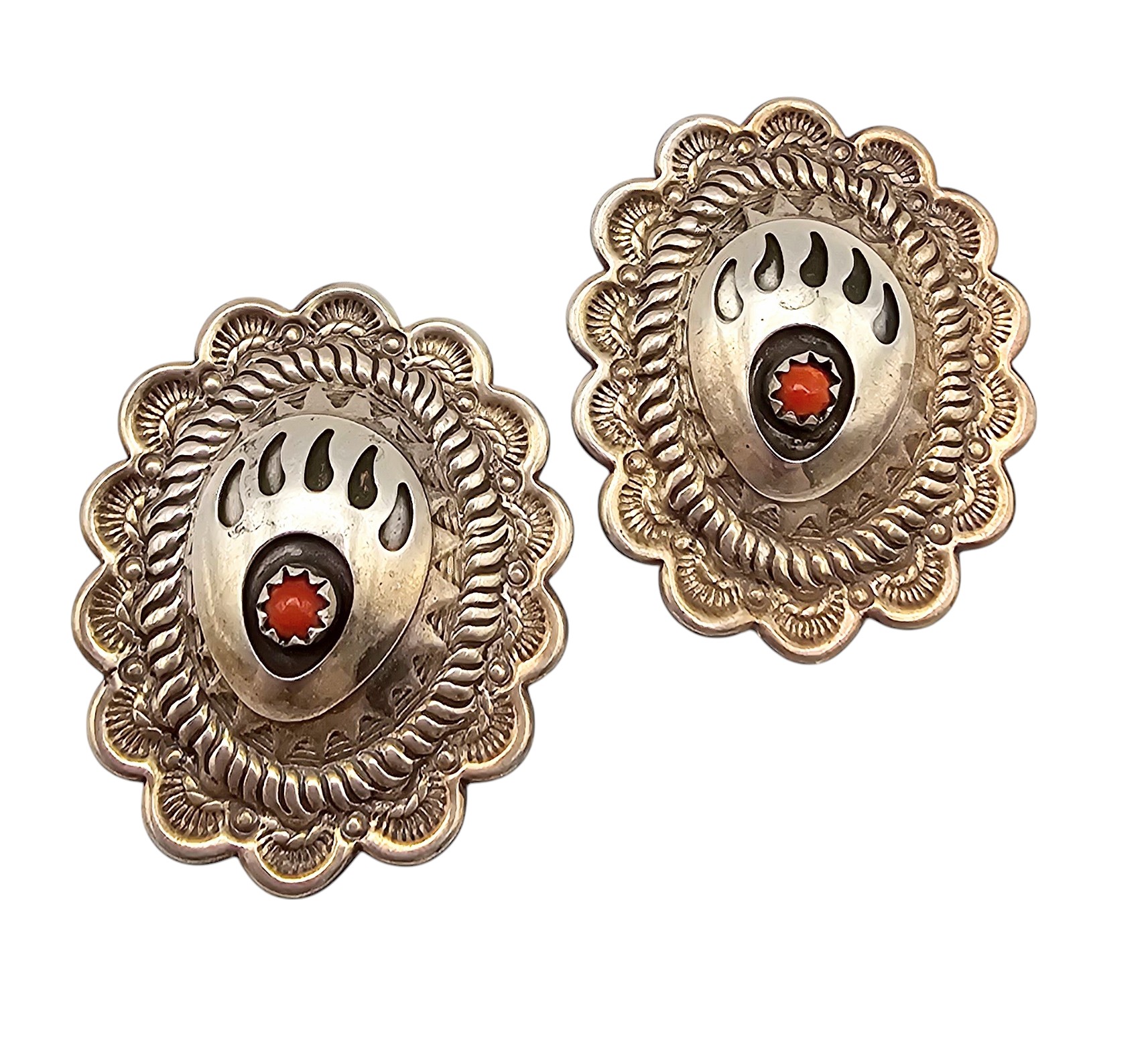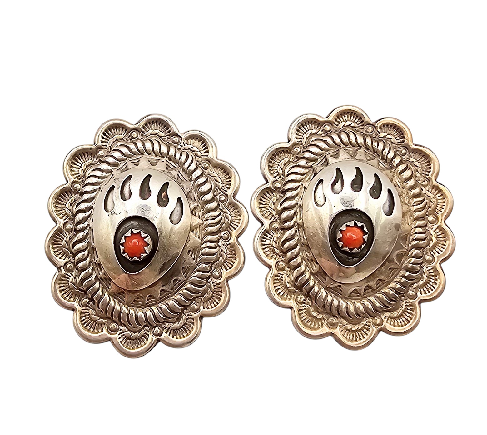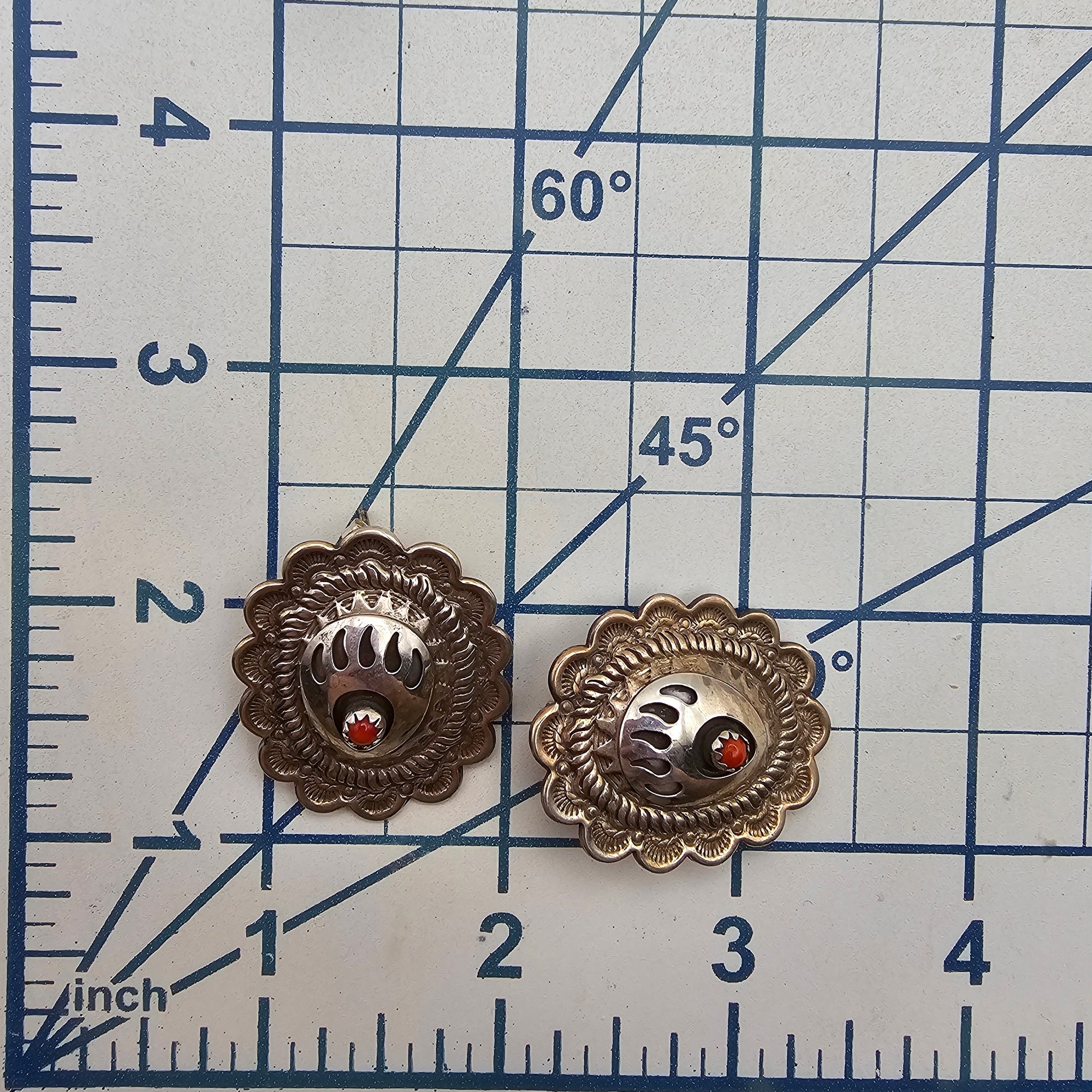 Native Coral Sterling Silver Concho Style bear paw Earrings 6.3 G
