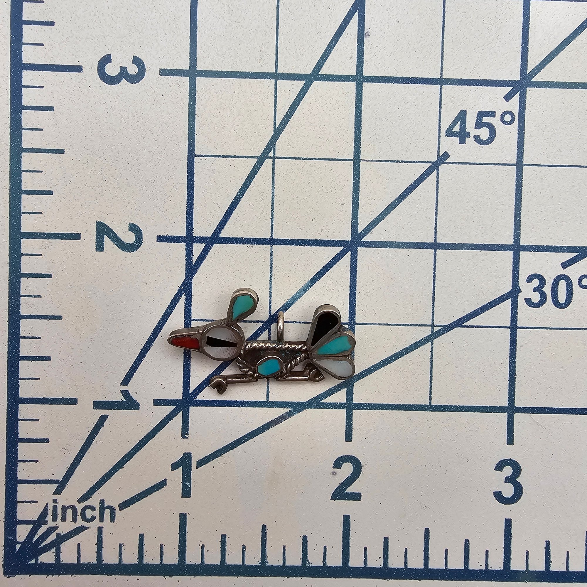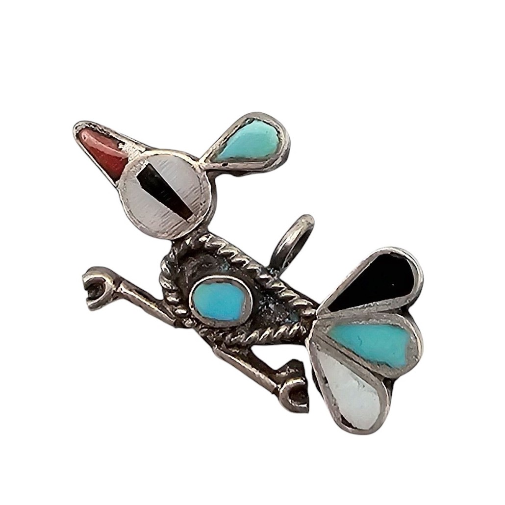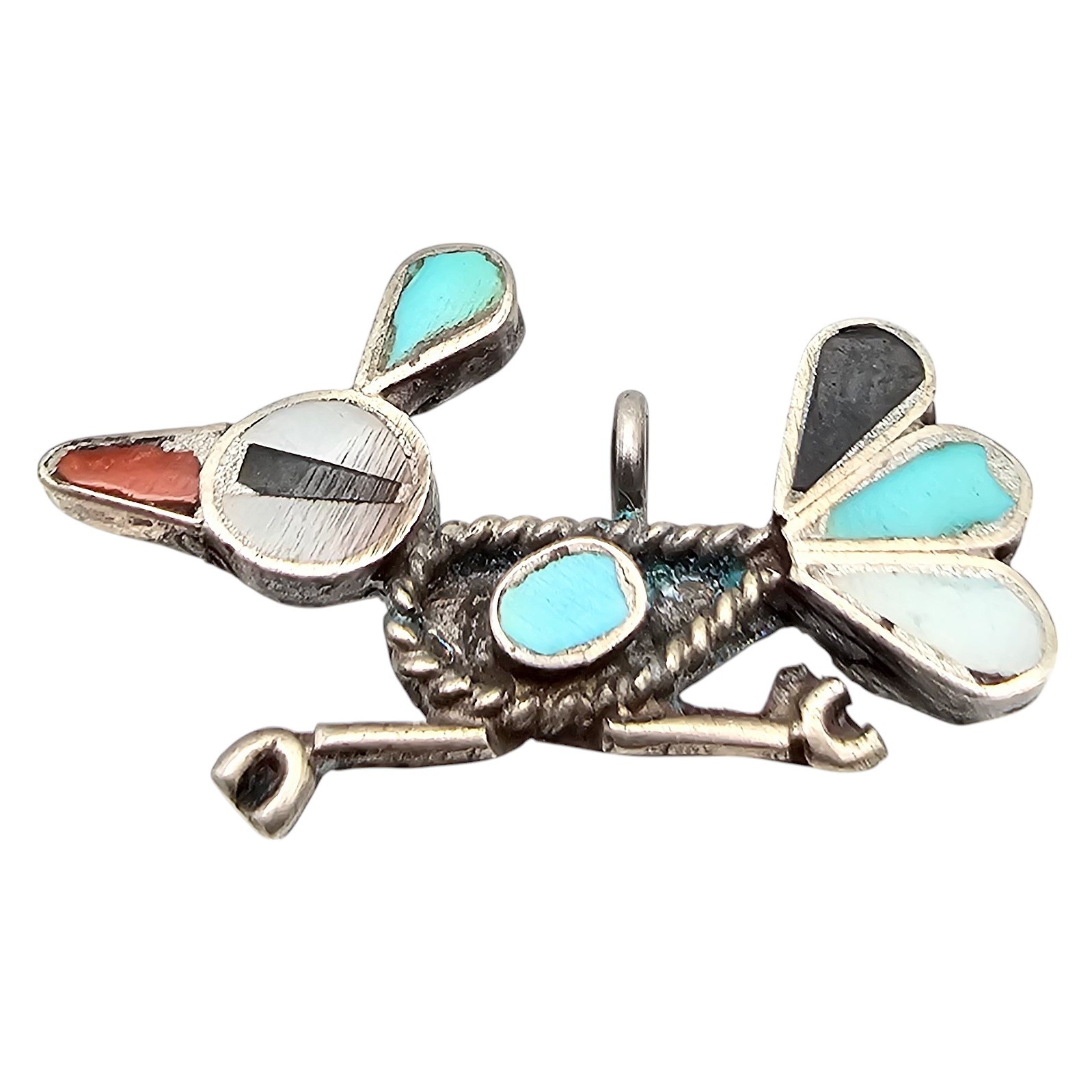 Zuni Mother Of Pearl Onyx Coral Turquoise Sterling Silver Roadrunner Pendant 2.2 G