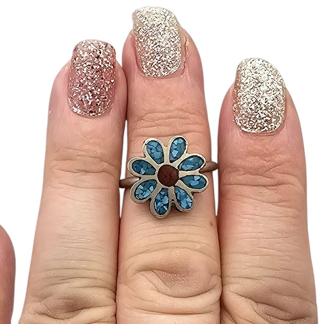 Native Crushed Turquoise Coral Sterling Silver Flower Ring Size 6.75 2.8 G