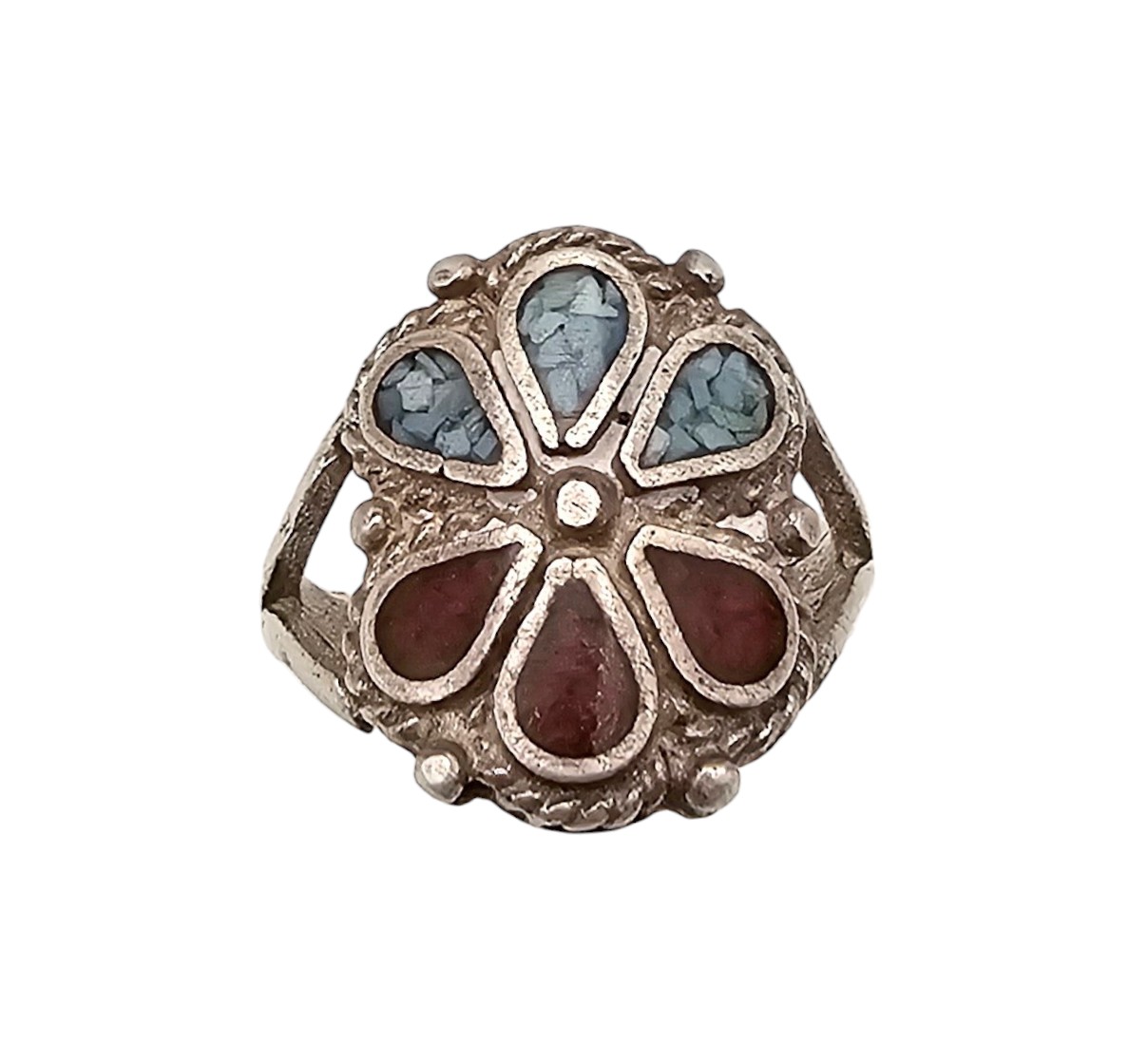 Native Crushed Turquoise Coral Sterling Silver Flower Ring Size 6.75 5.2 G as is broken band