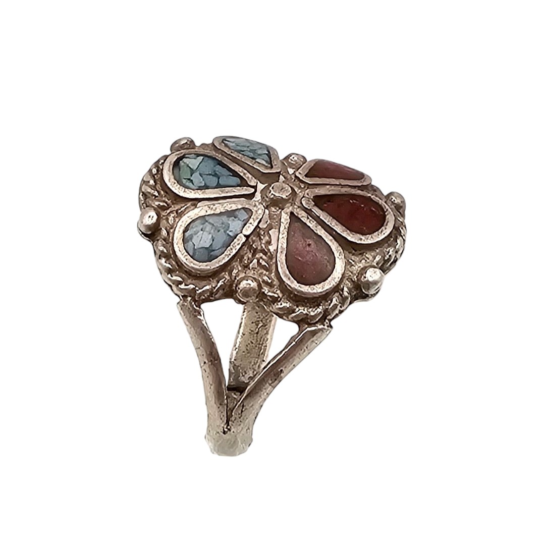 Native Crushed Turquoise Coral Sterling Silver Flower Ring Size 6.75 5.2 G