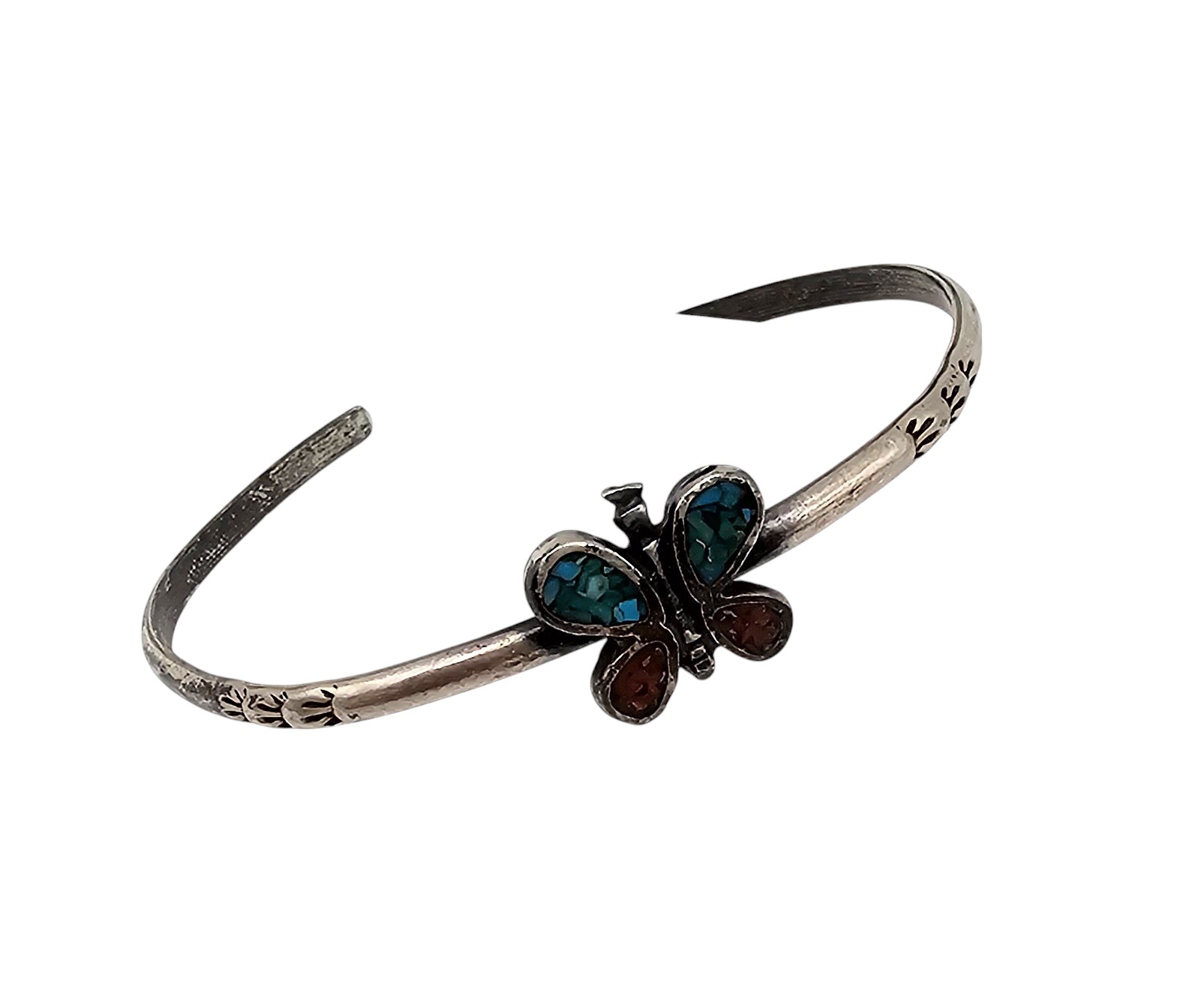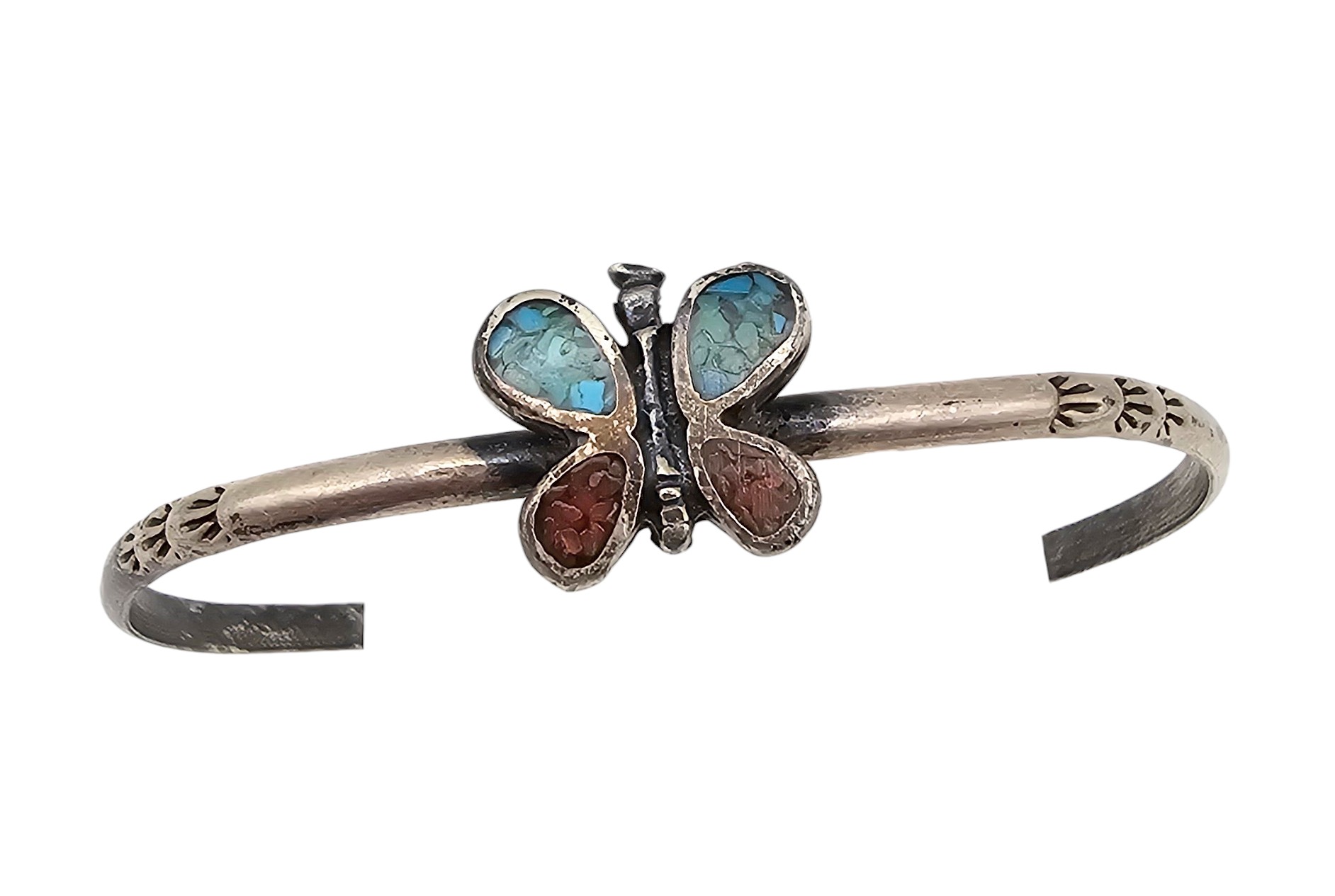 Navajo Crushed Turquoise Coral Sterling Silver Butterfly Cuff Bracelet 4.7 G