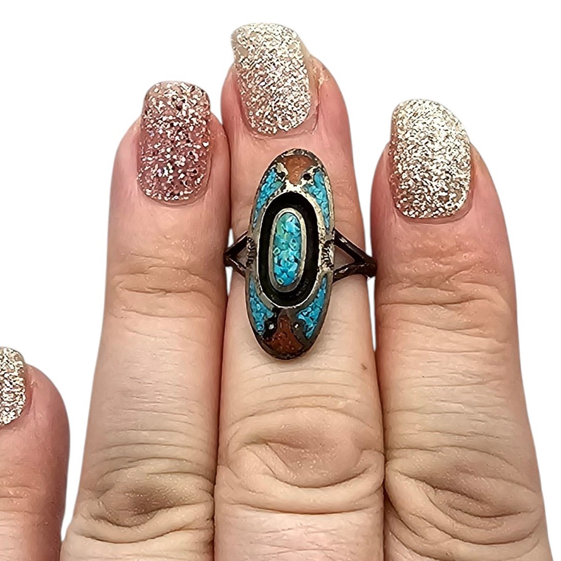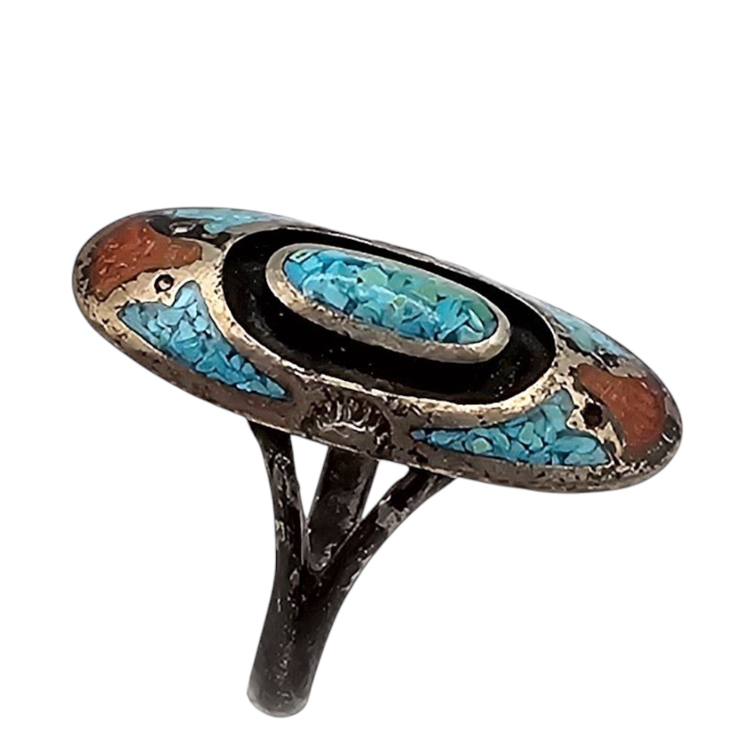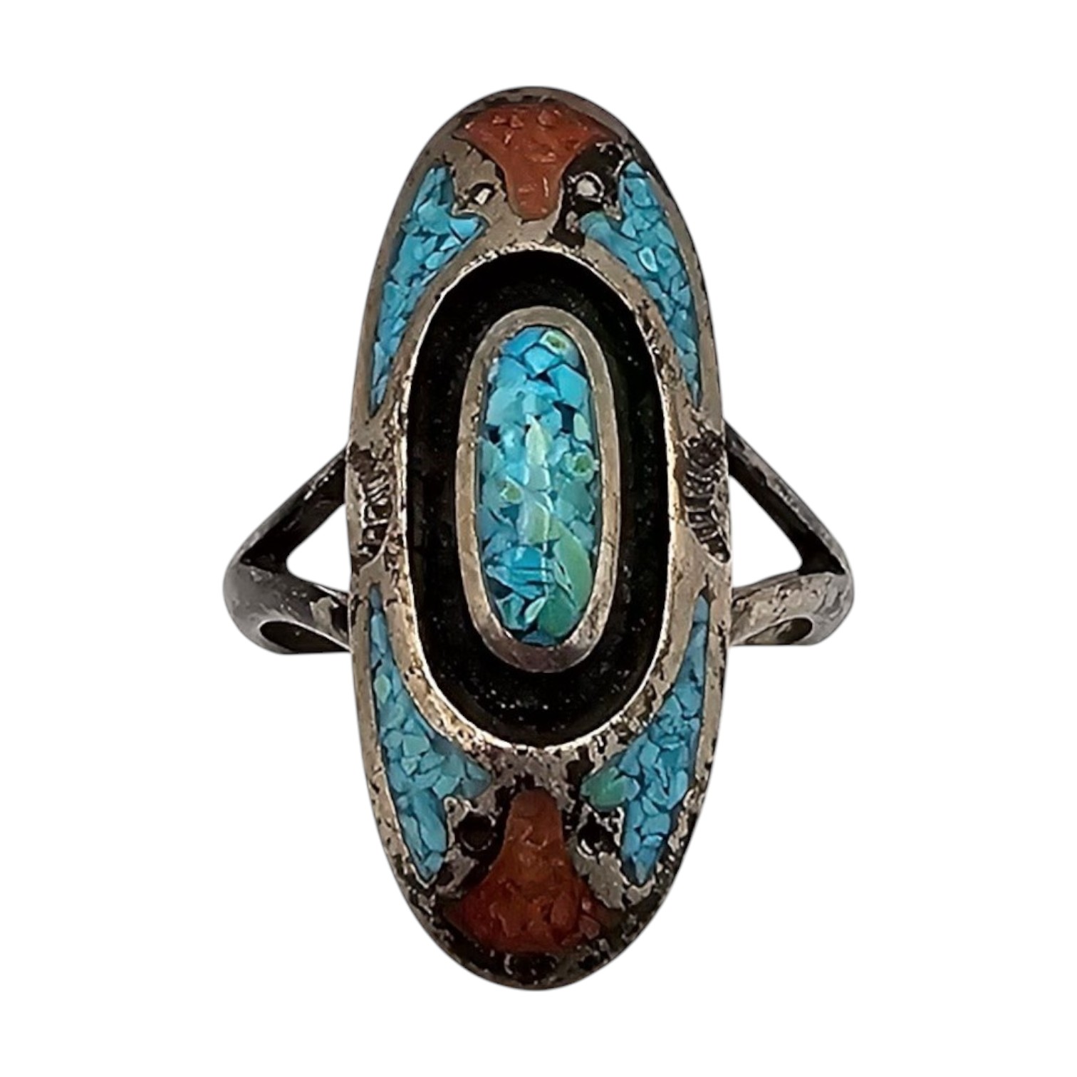 Navajo Crushed Turquoise Coral Sterling Silver Ring Size 5.5 5.3 G