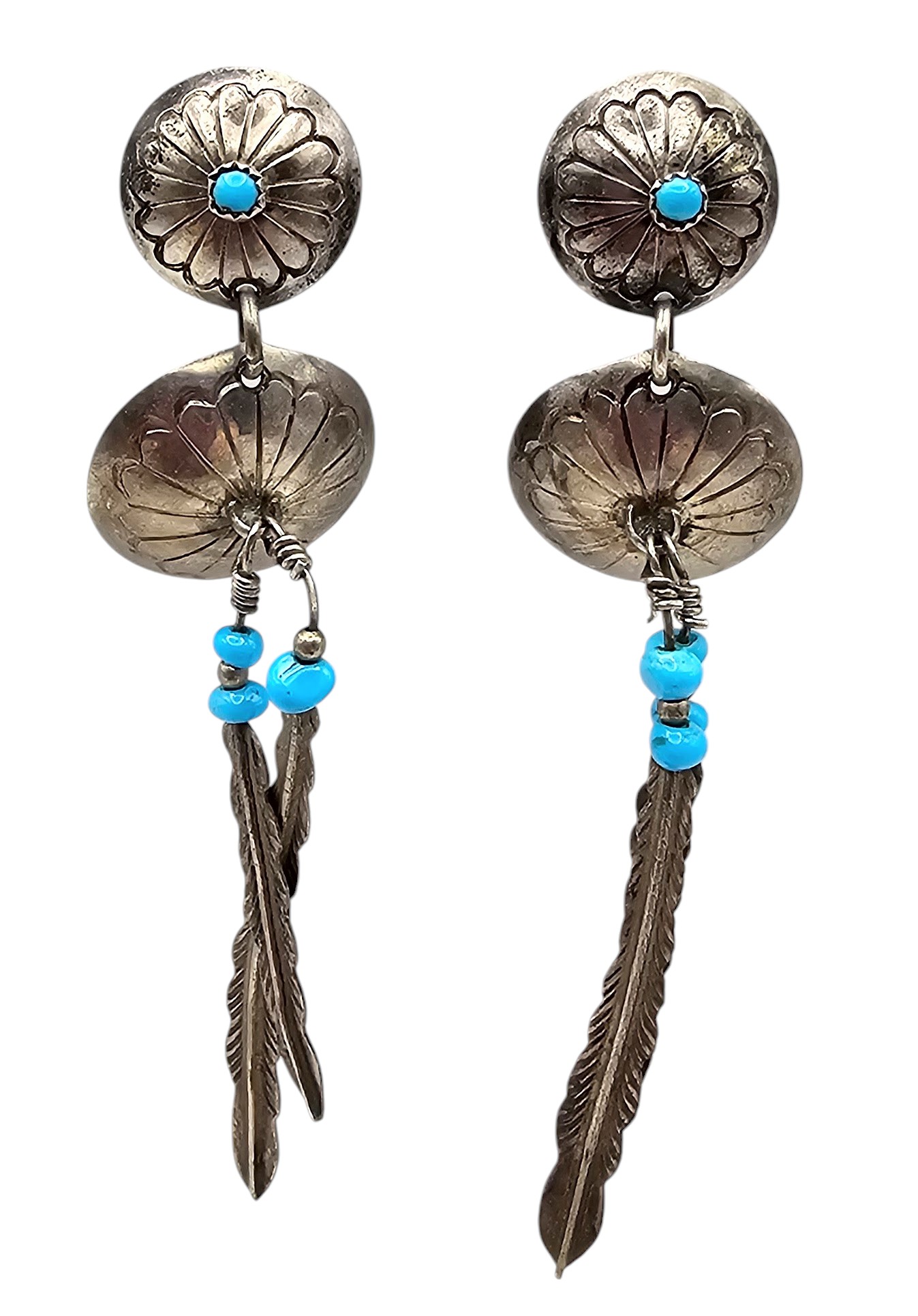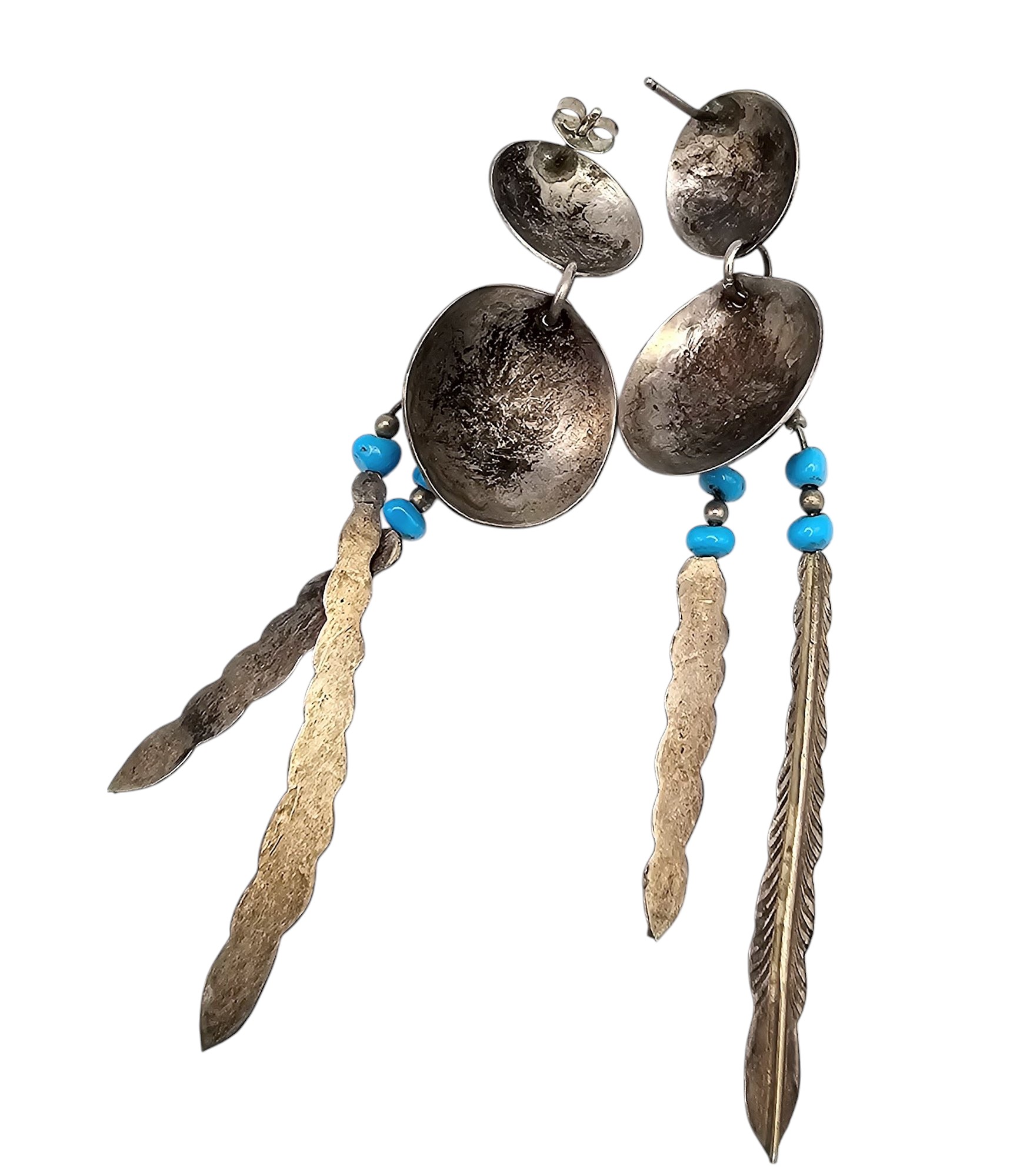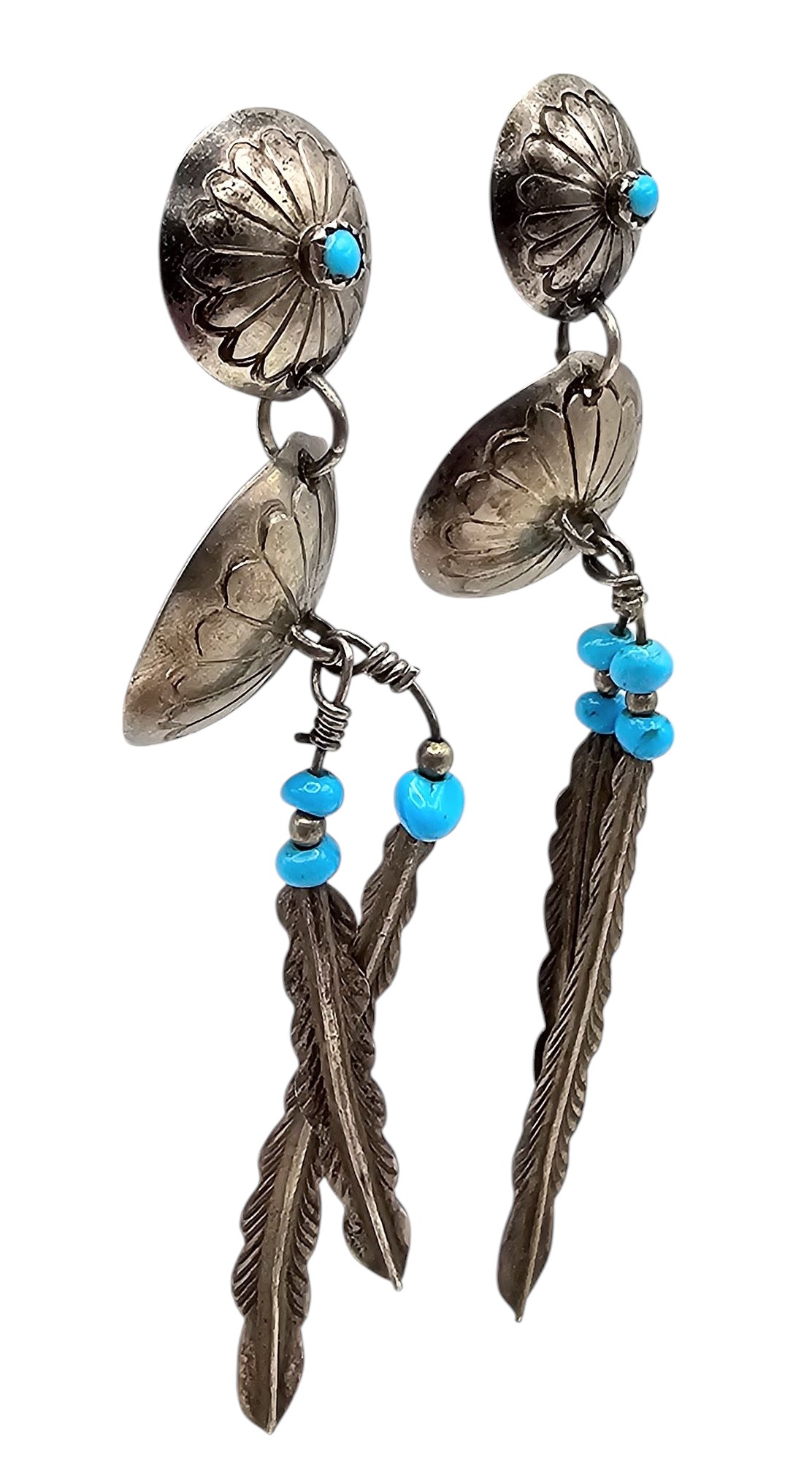 Native Turquoise Sterling Silver Feather Drop Dangle Earrings 7.9 G