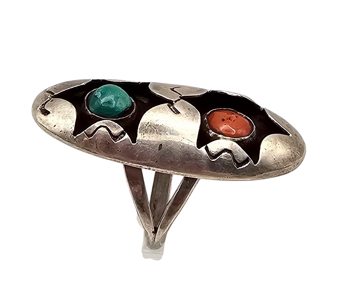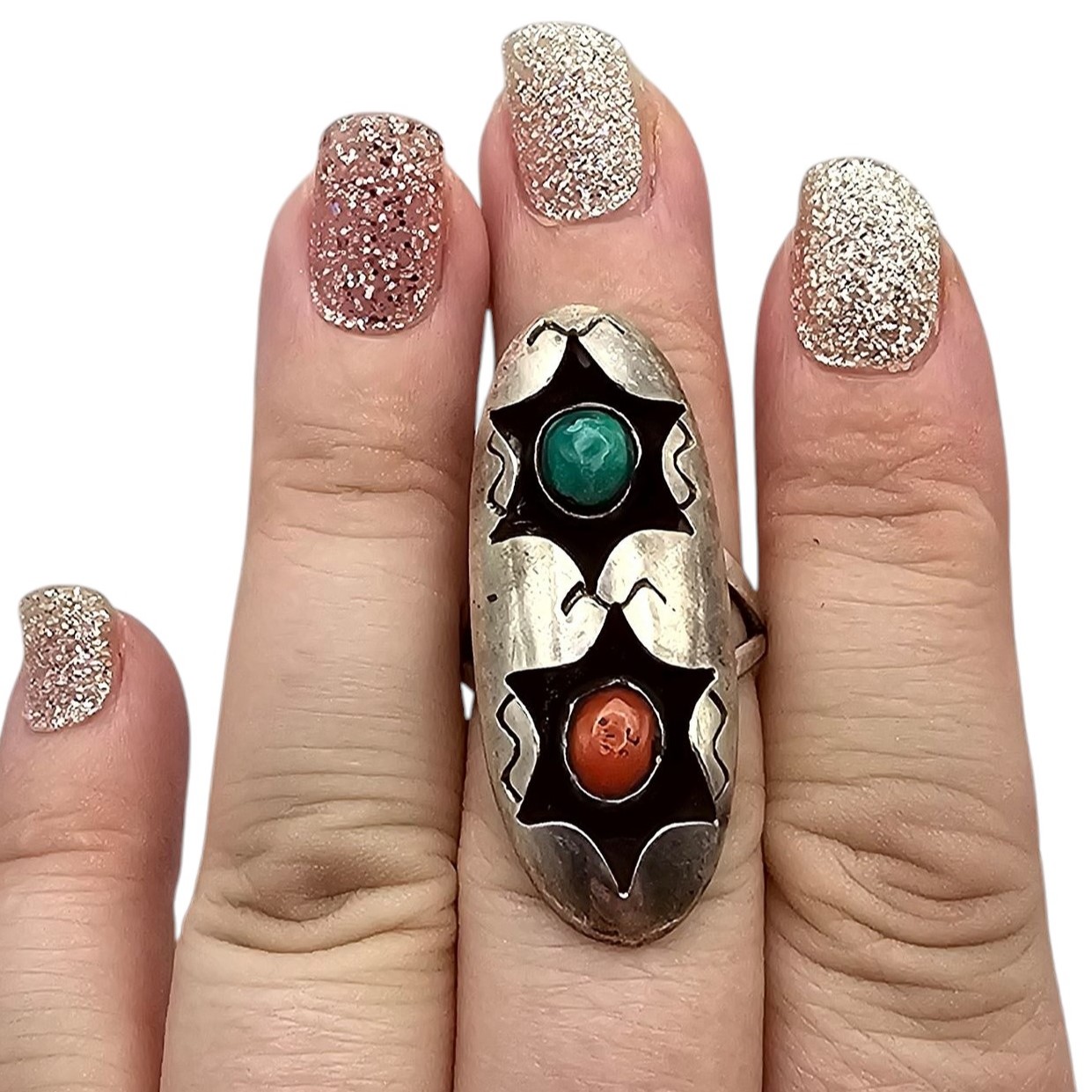 Jesse Thompson Navajo Coral Turquoise Sterling Silver Shadow Box Ring Size 7.75 8.1 G
