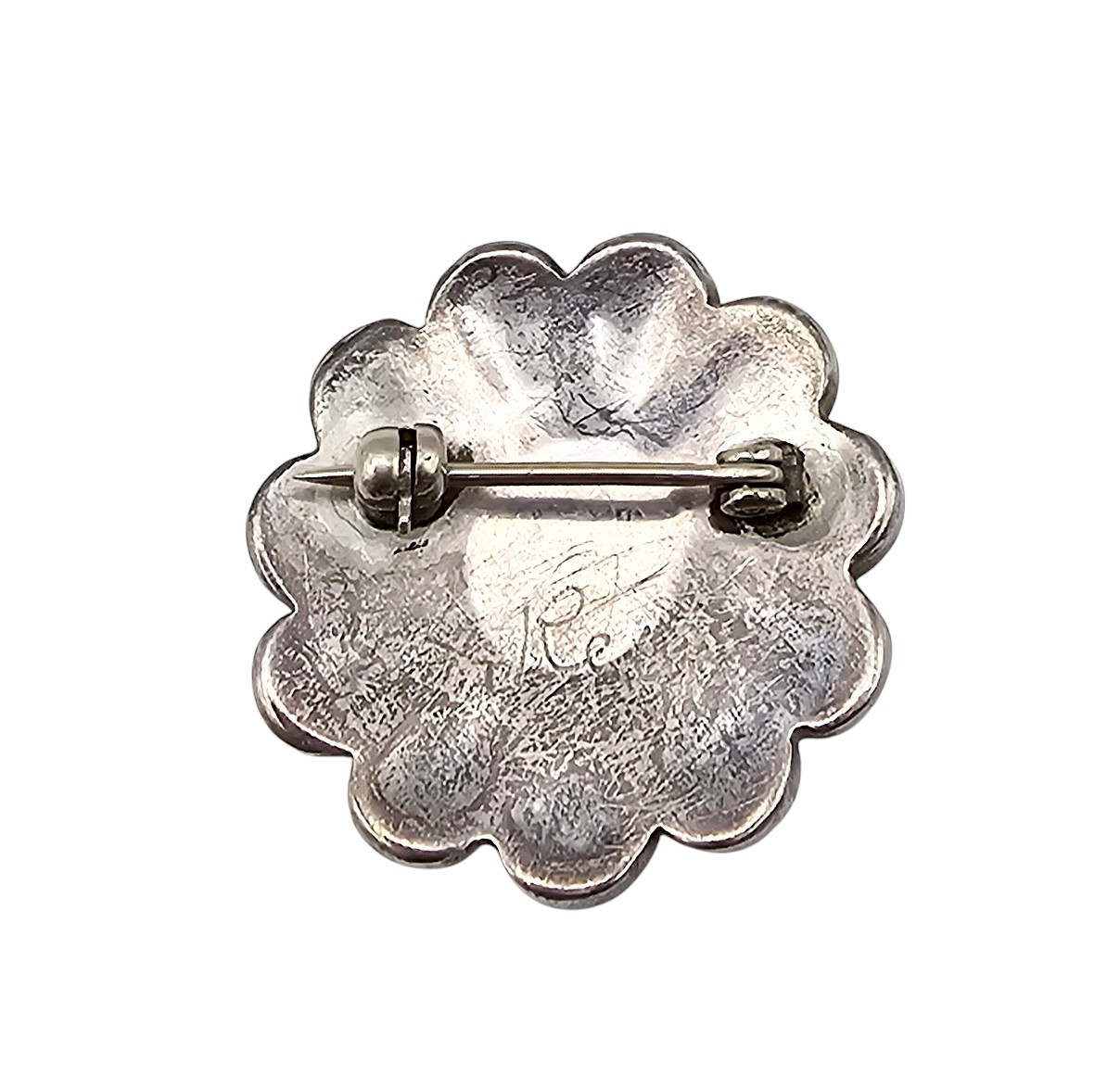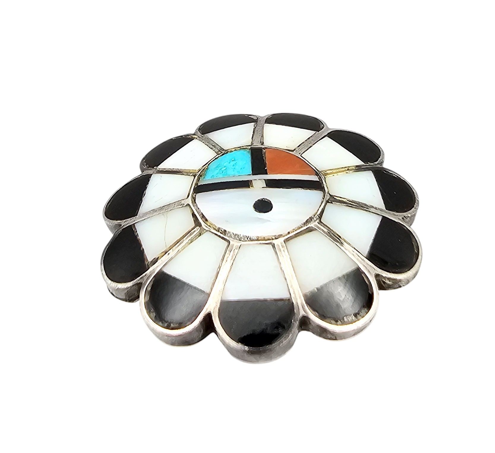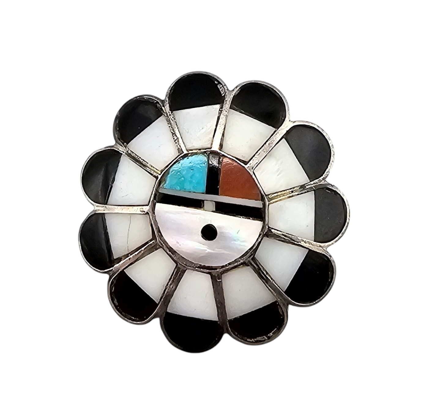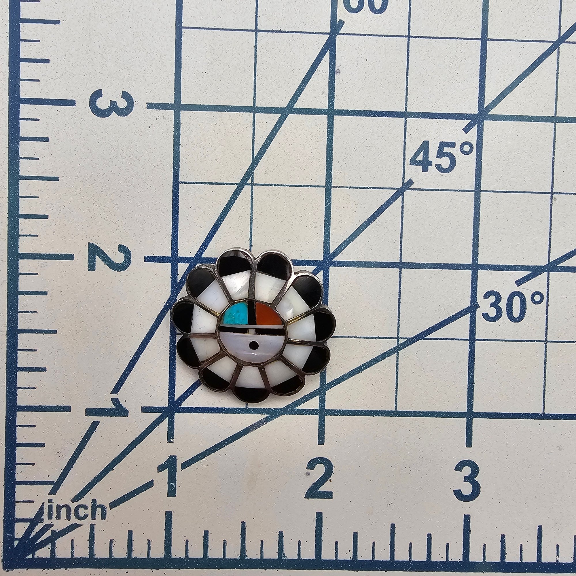 Zuni Mother Of Pearl Onyx Turquoise Coral Sterling Silver Inlay sun face Brooch 5 G