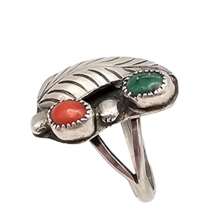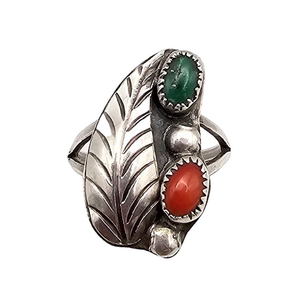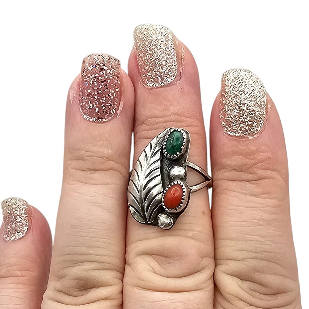Navajo Coral Turquoise Sterling Silver Leaf Design Ring Size 5.75 3.5 G