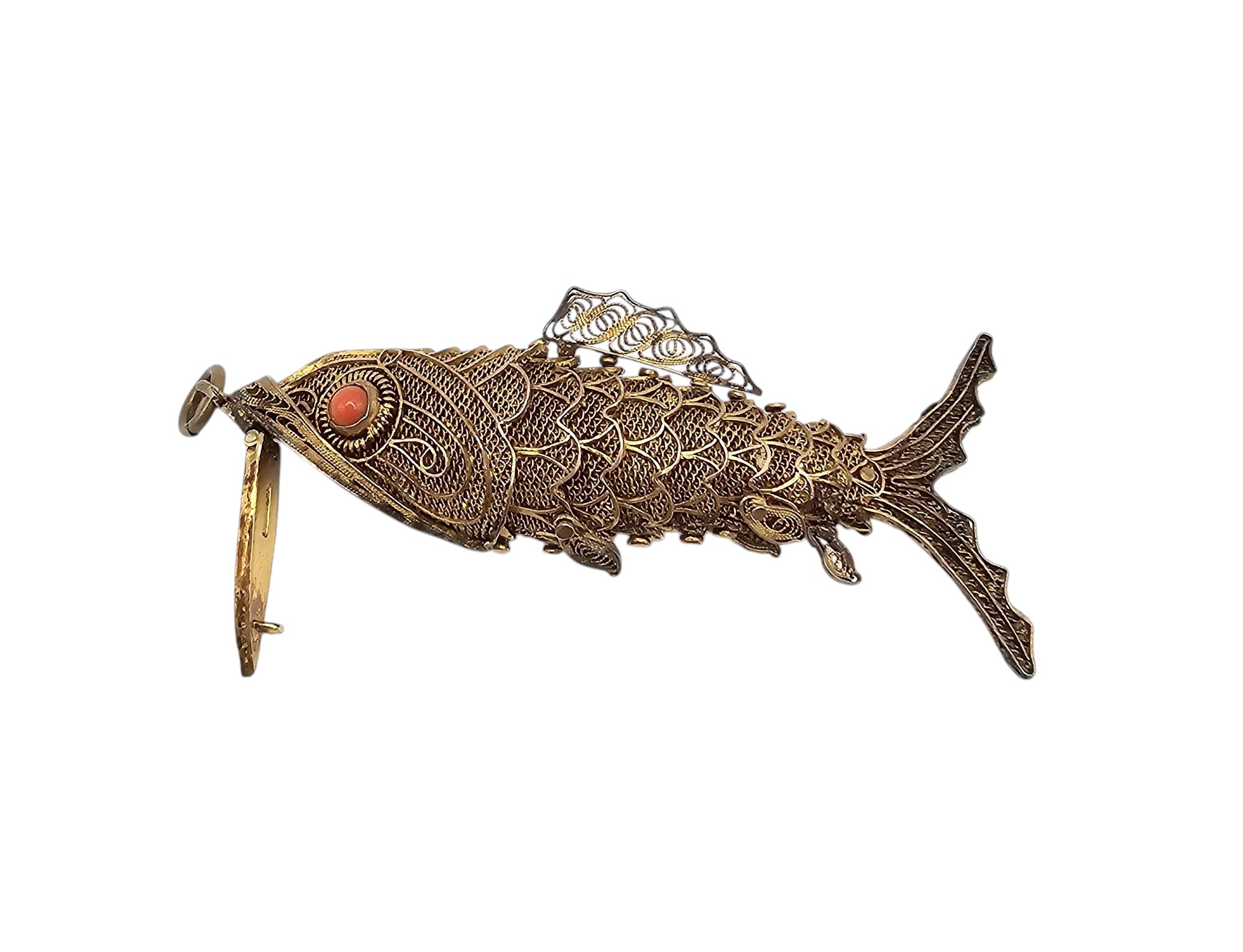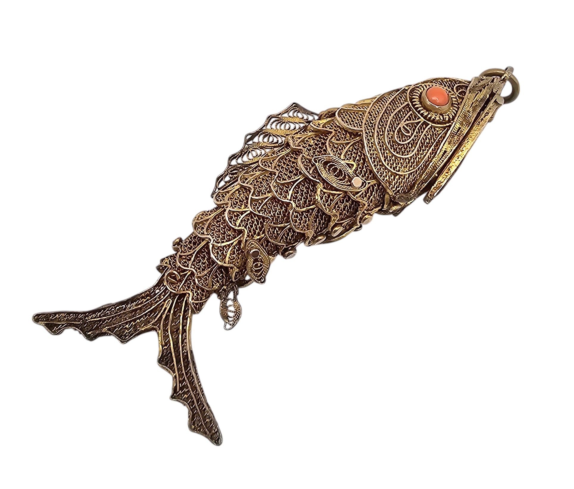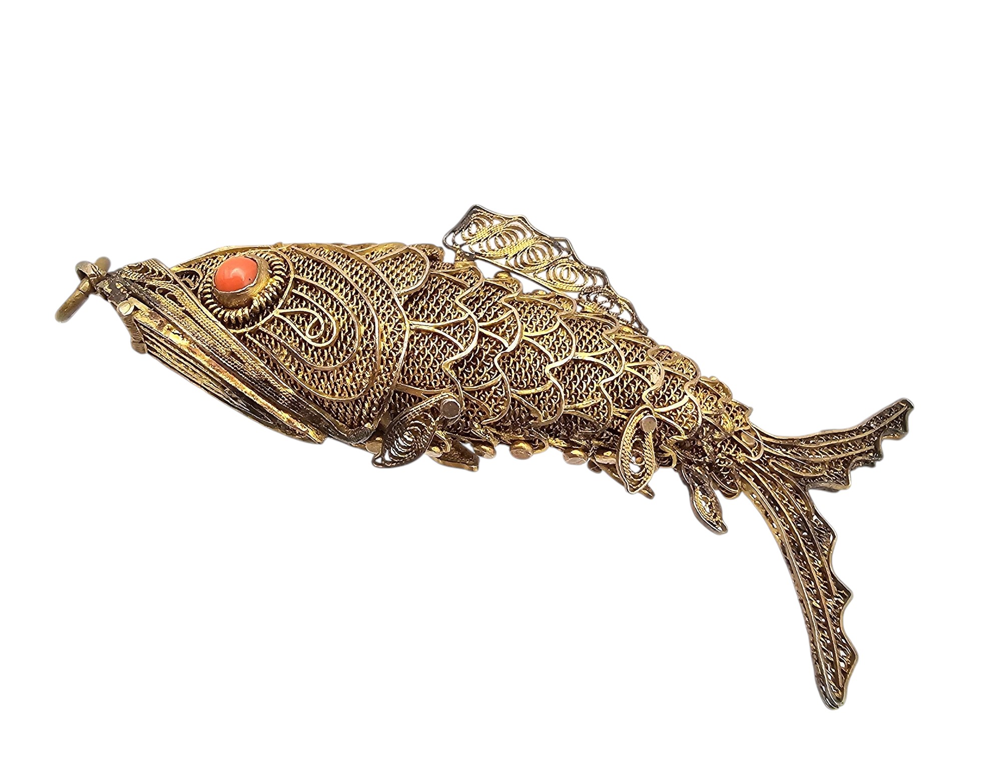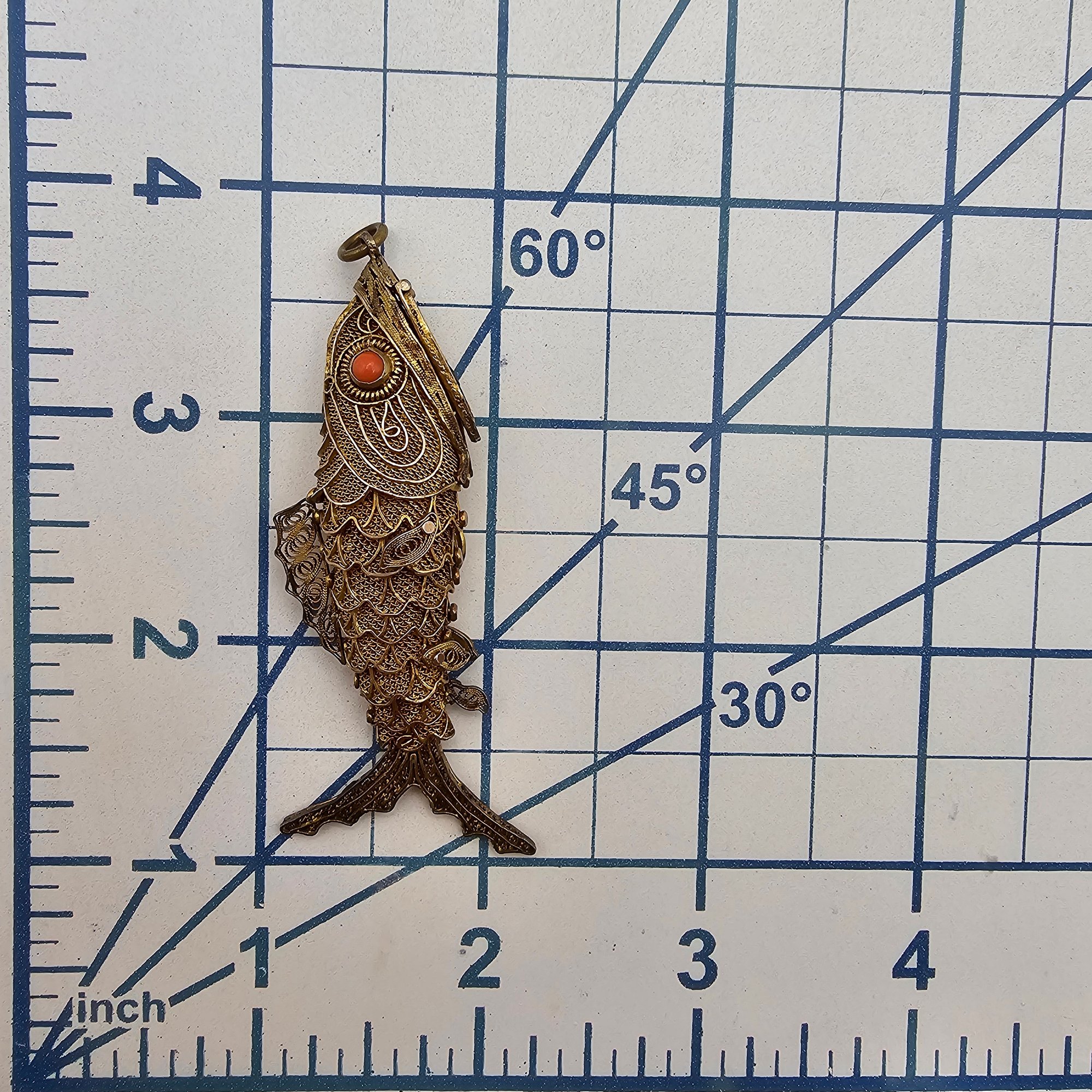 Chinese Coral Gold Over Sterling Silver Filigree Articulated Fish Pendant 12 G