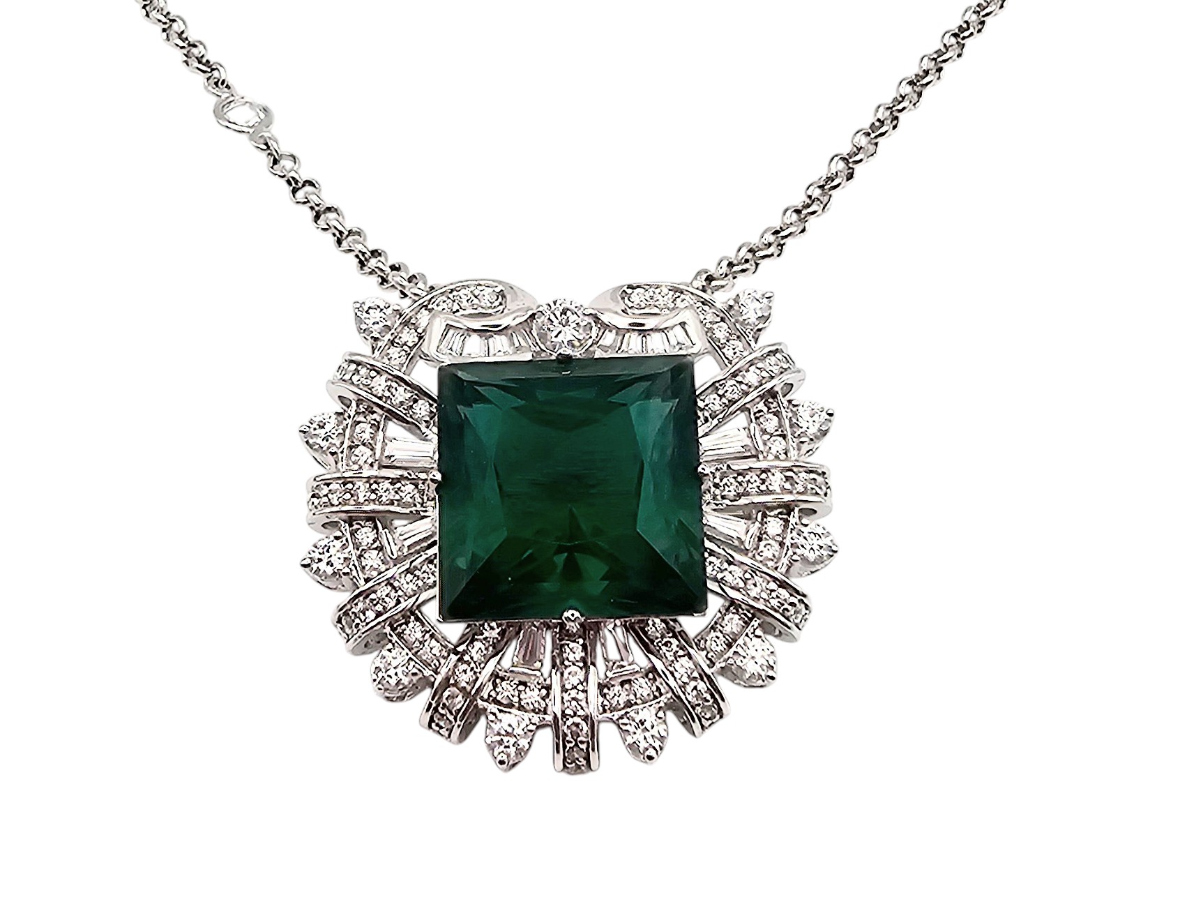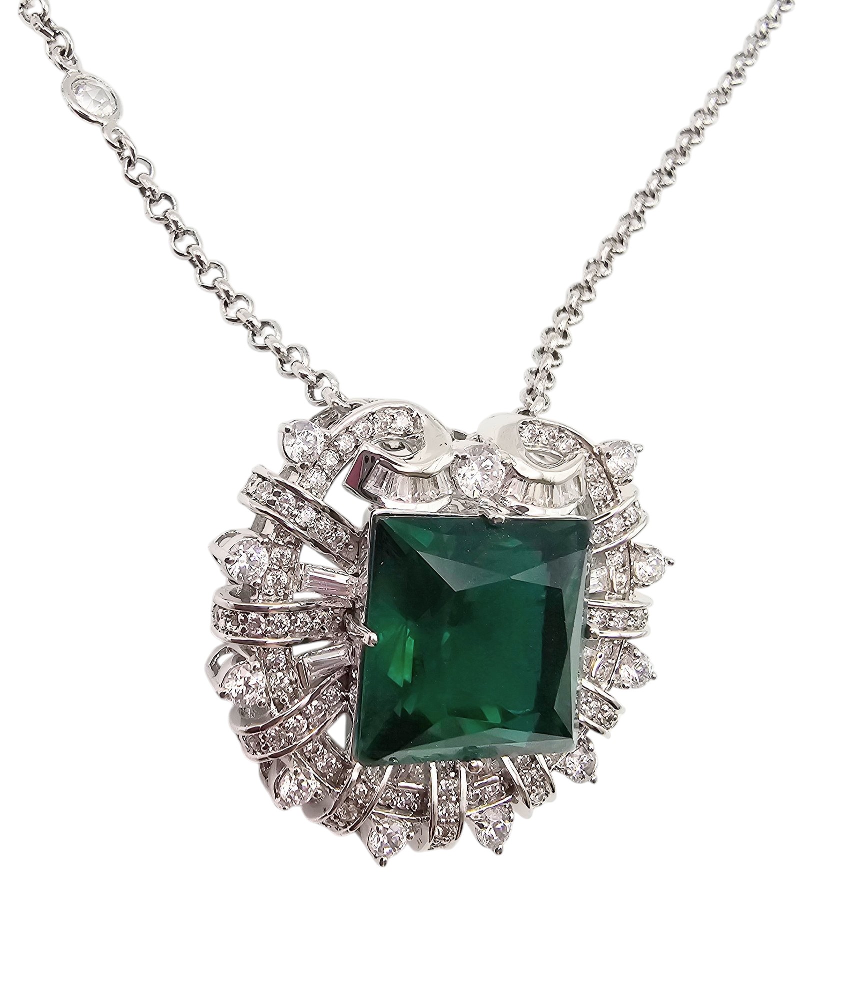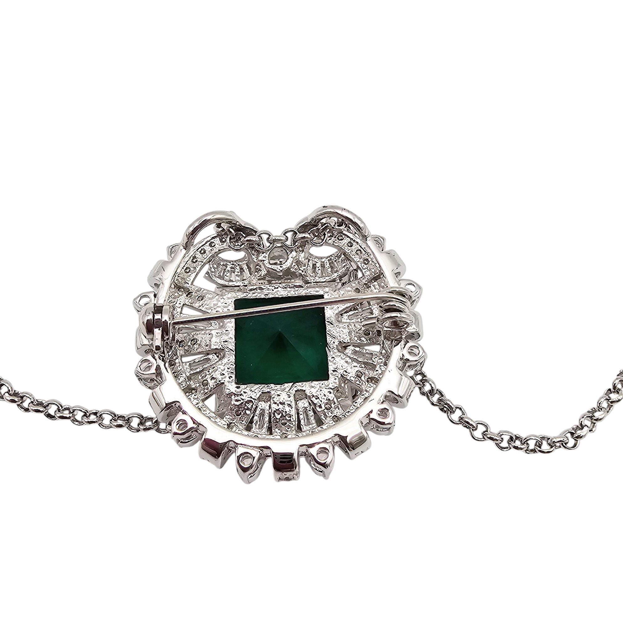 Smithsonian Replica 75 carot Hooker Emerald Silver Tone Rhinestone Necklace Brooch once mounted on an Ottoman Saultons Buckle Tiffany & Co set the emerald in Sterling Silver and made it into a Brooch Pendant. Comes in case case has a dent as shown in photos.