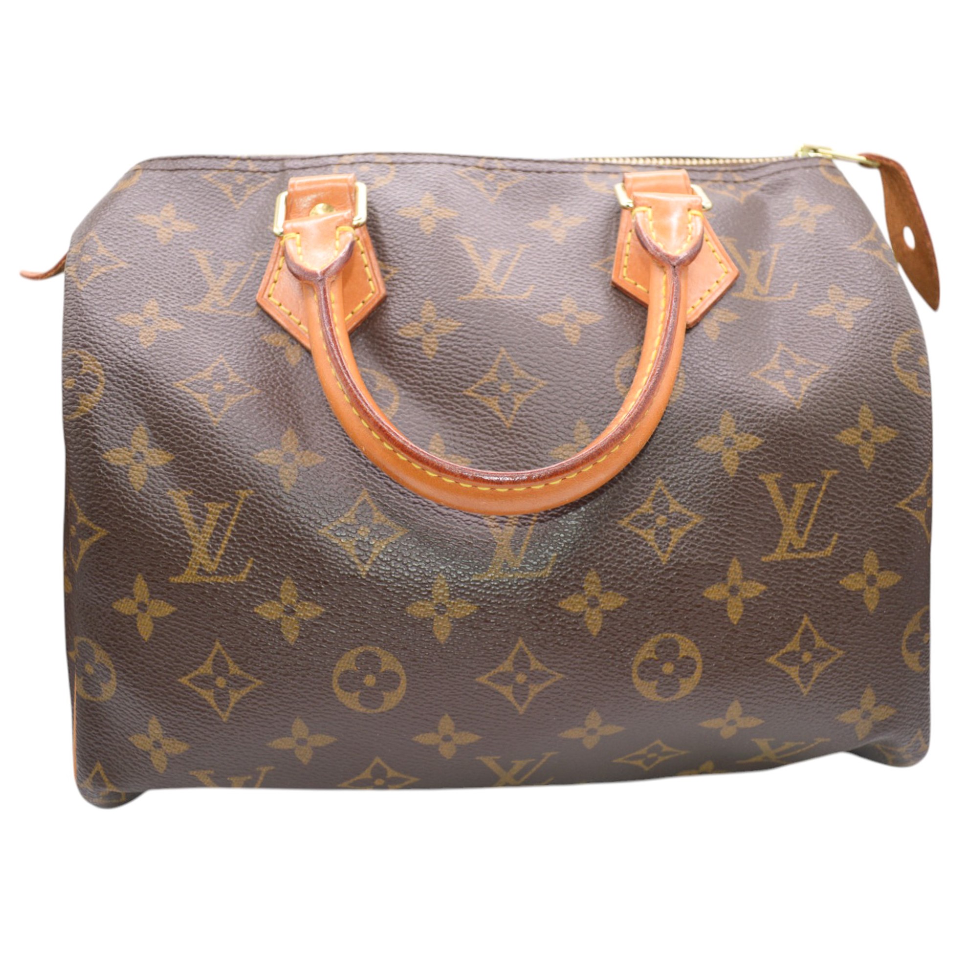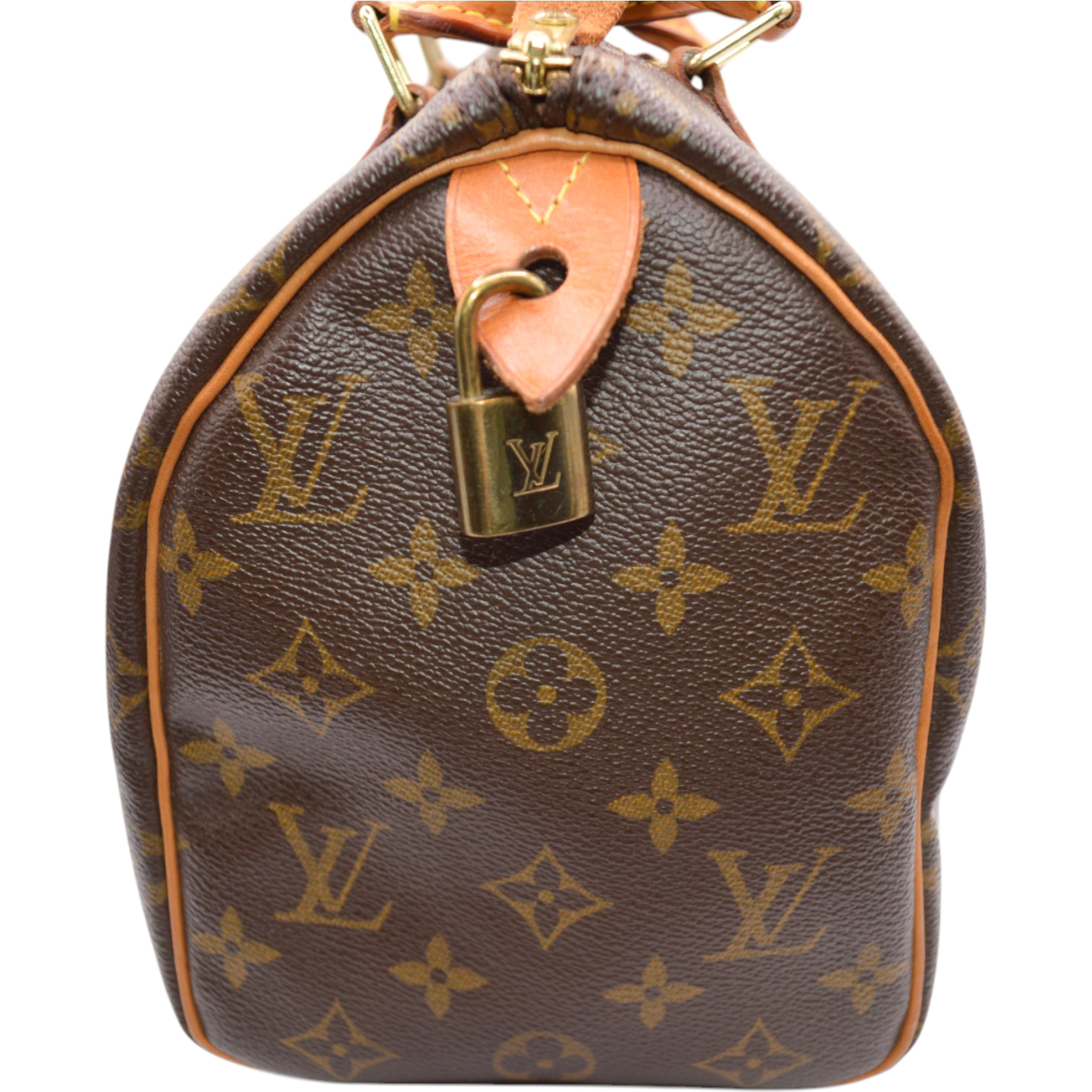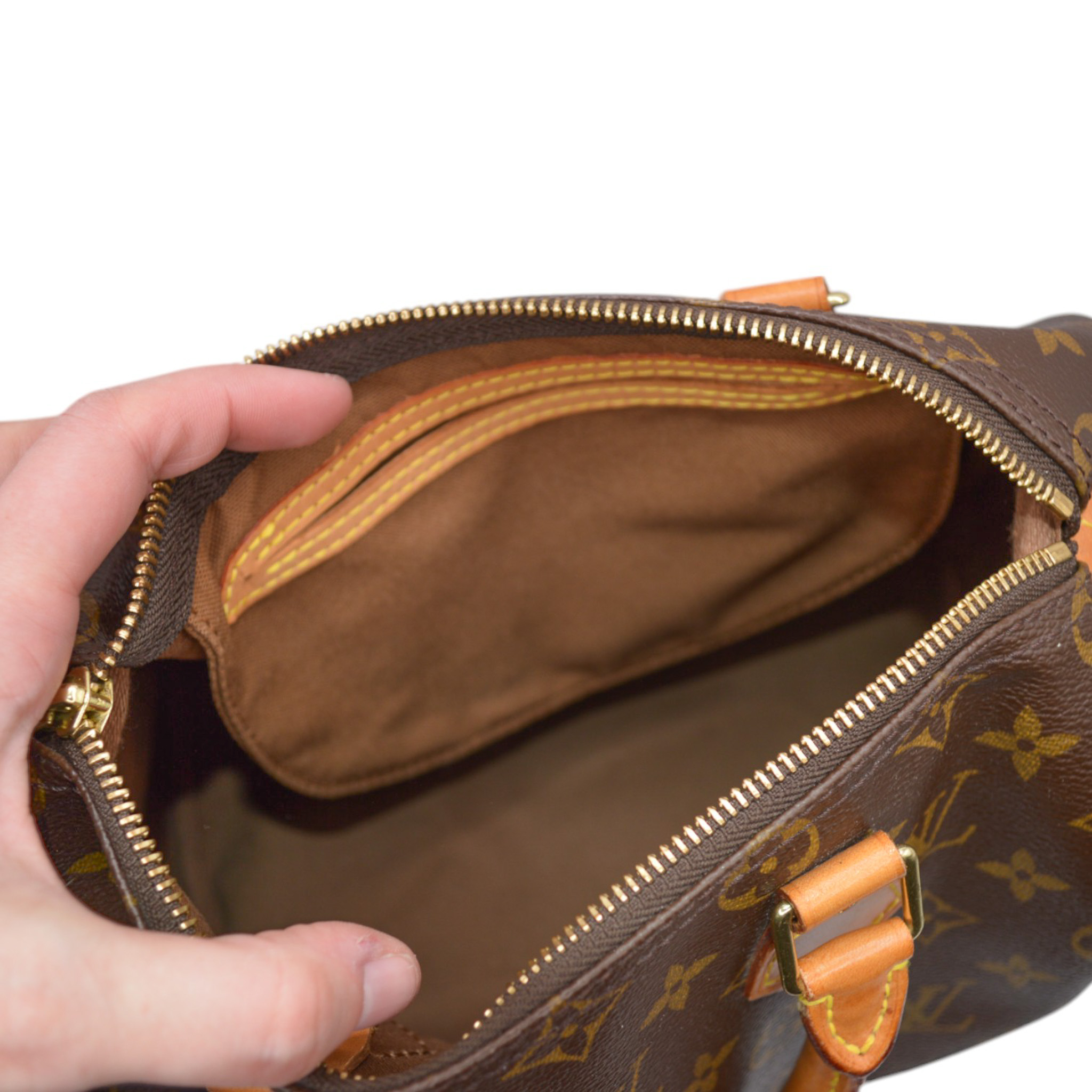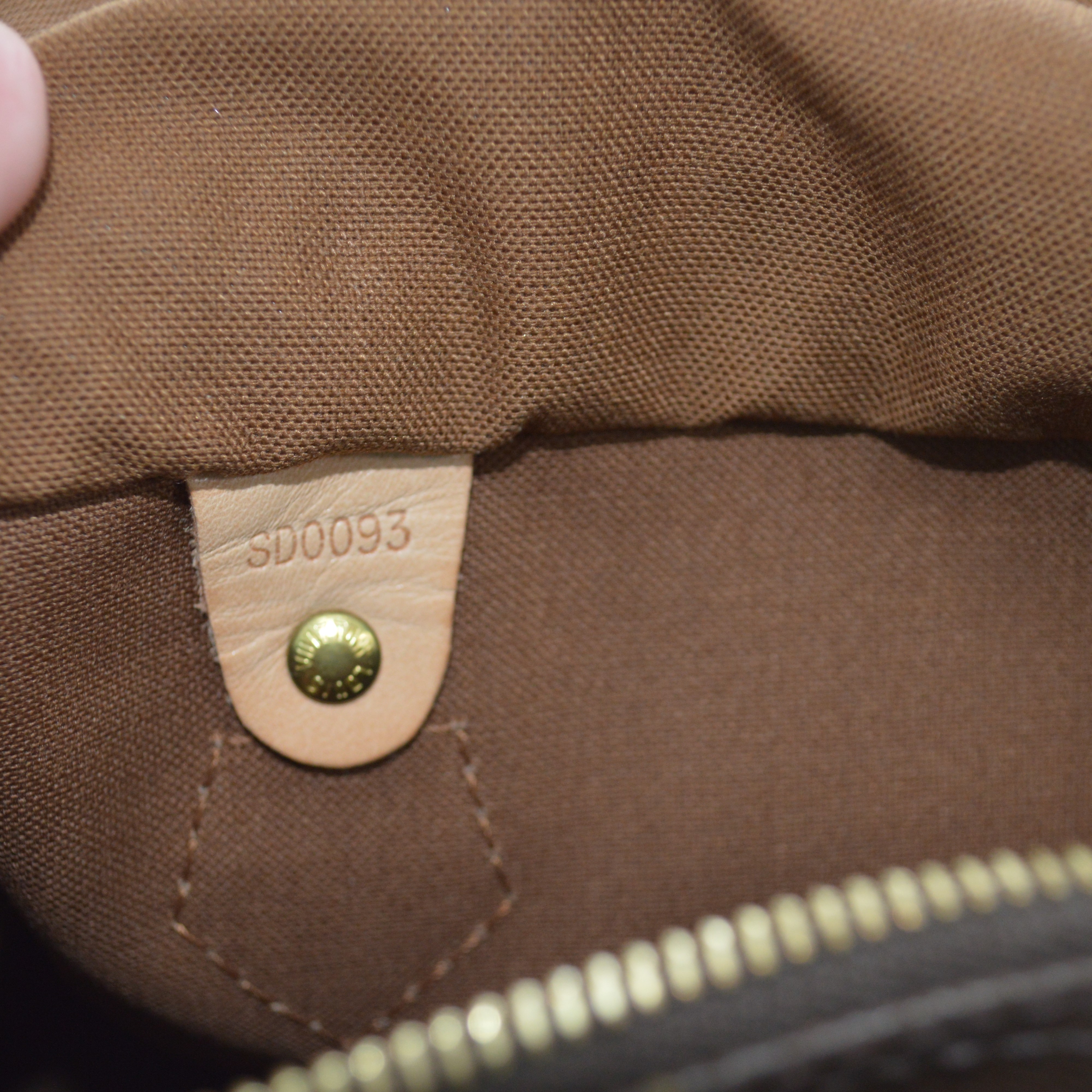 Signature monogram canvas, zipper closure, and an inside slip pocket. Comes with shoulder strap and lock attached to end. Bag is in very good, used condition- please refer to photos for signs of wear. Date code SD0093 (Made in USA Sept 2003). 10″x 8″x 6″. Box included.