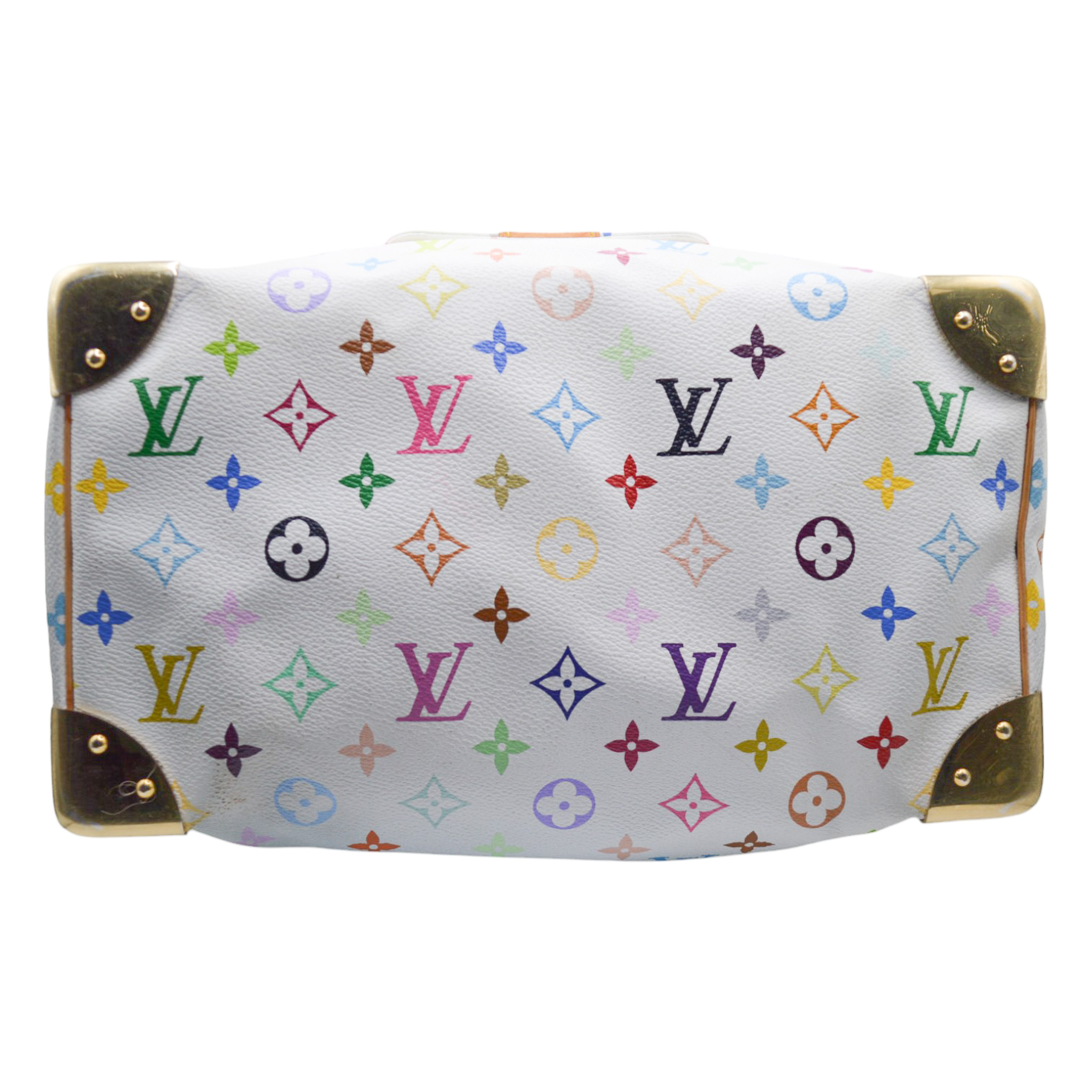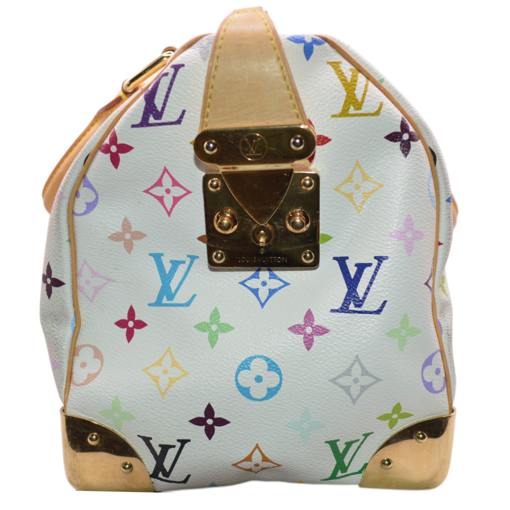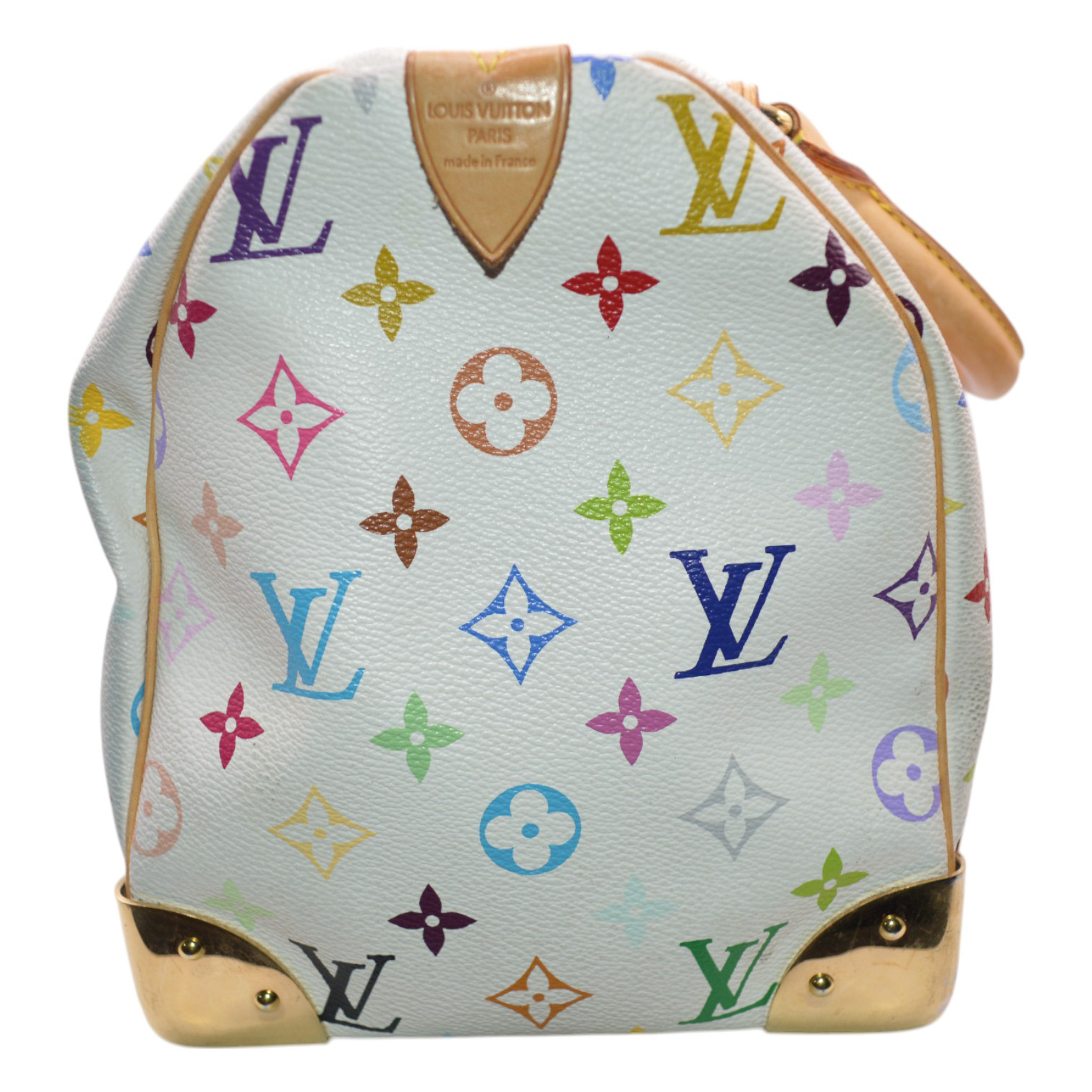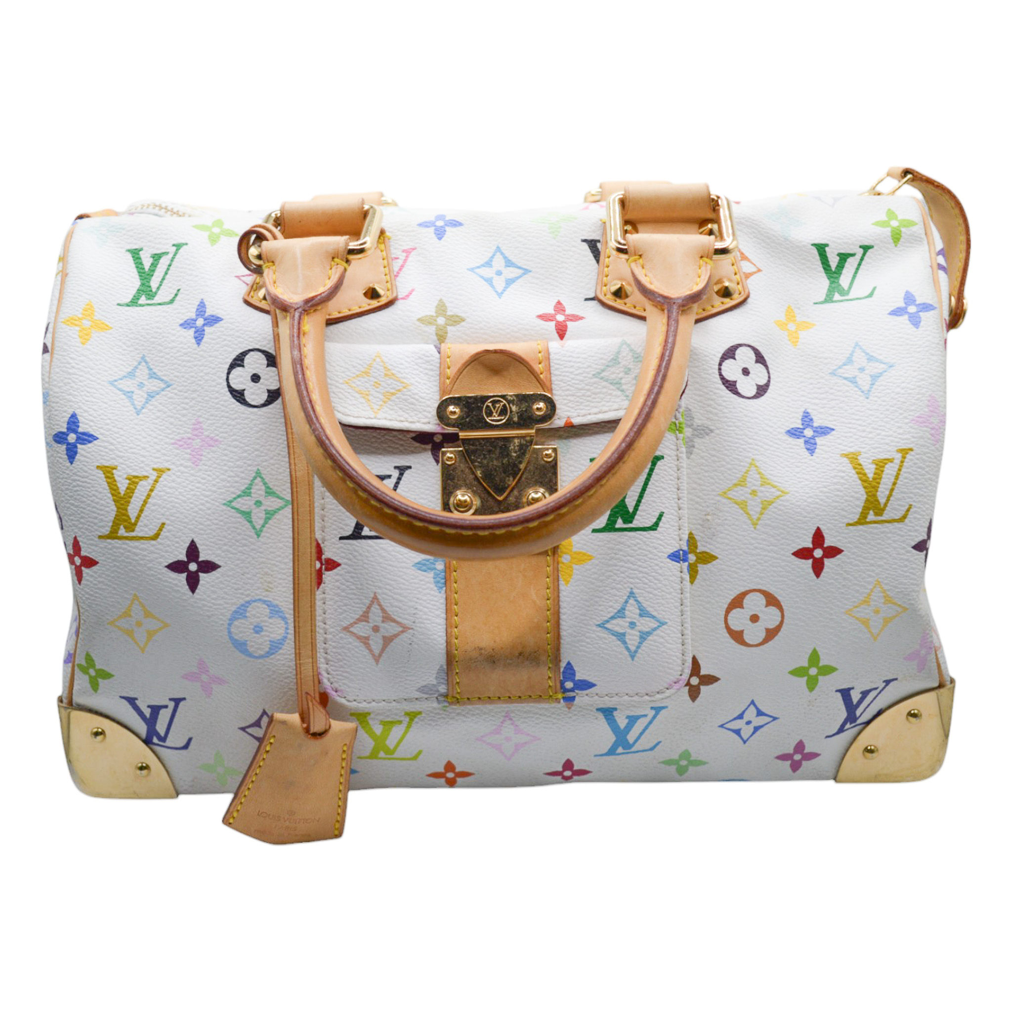 White multicolor canvas with gold hardware, vachetta leather trim, Interior is lined in burgundy alcantara and has one slit pocket on the rear wall. Date code SP0076 (Made in France July 2006). From the Louis Vuitton x Takashi Murakami, Marc Jacobs collection. Bag is in very good, used condition- please refer to photos for signs of wear, including some transfer color on the edge/front, worn edges of metal footers, pen marks in inside pocket, and wearing to front pocket. Dust bag included and shopping bag, if wanted. Shopping bag may need folded to fit in shipping box.