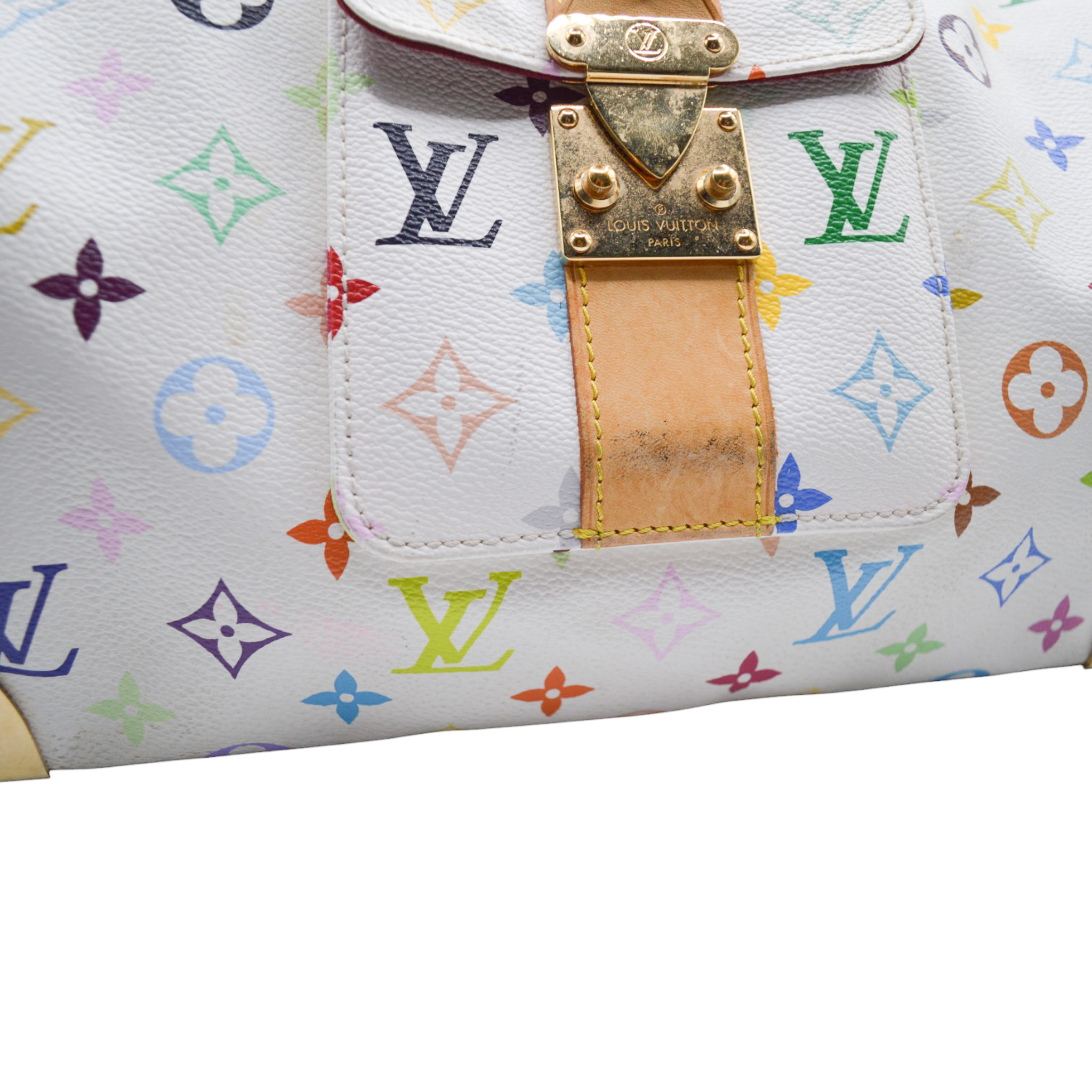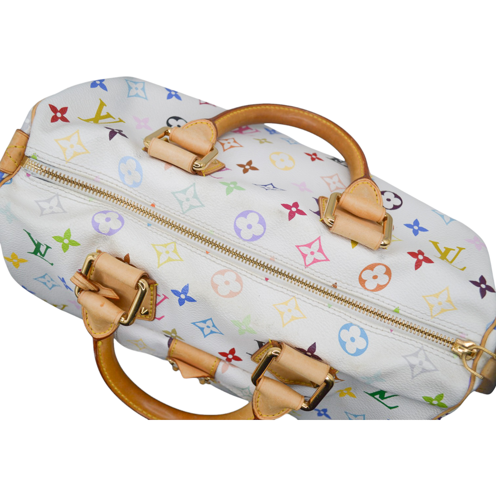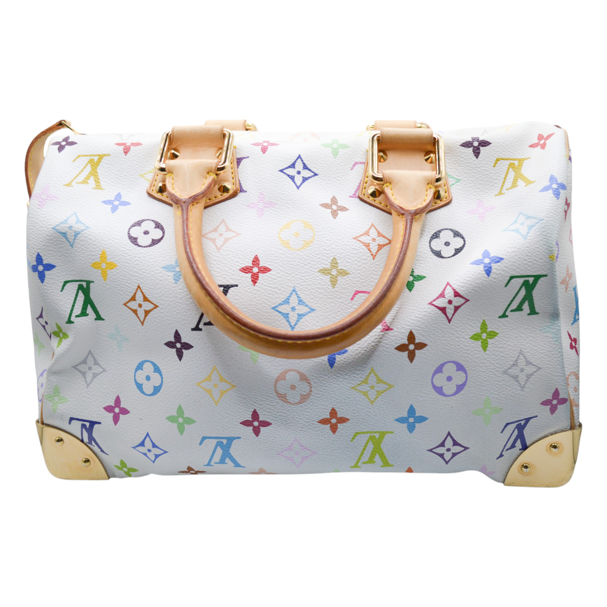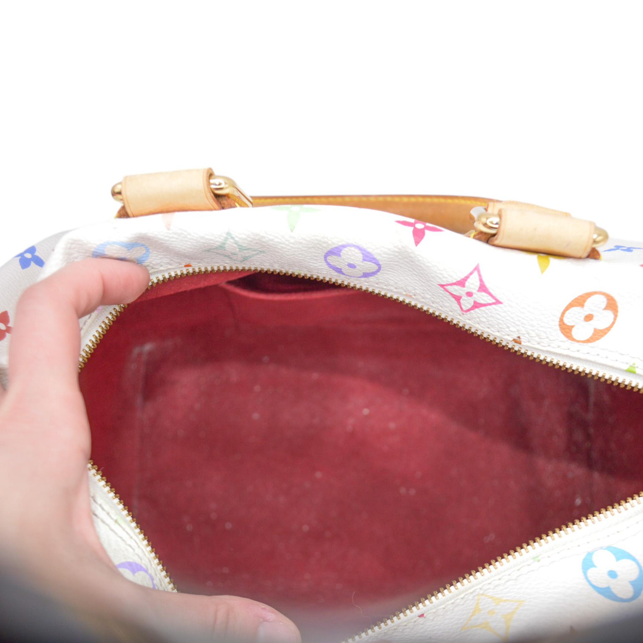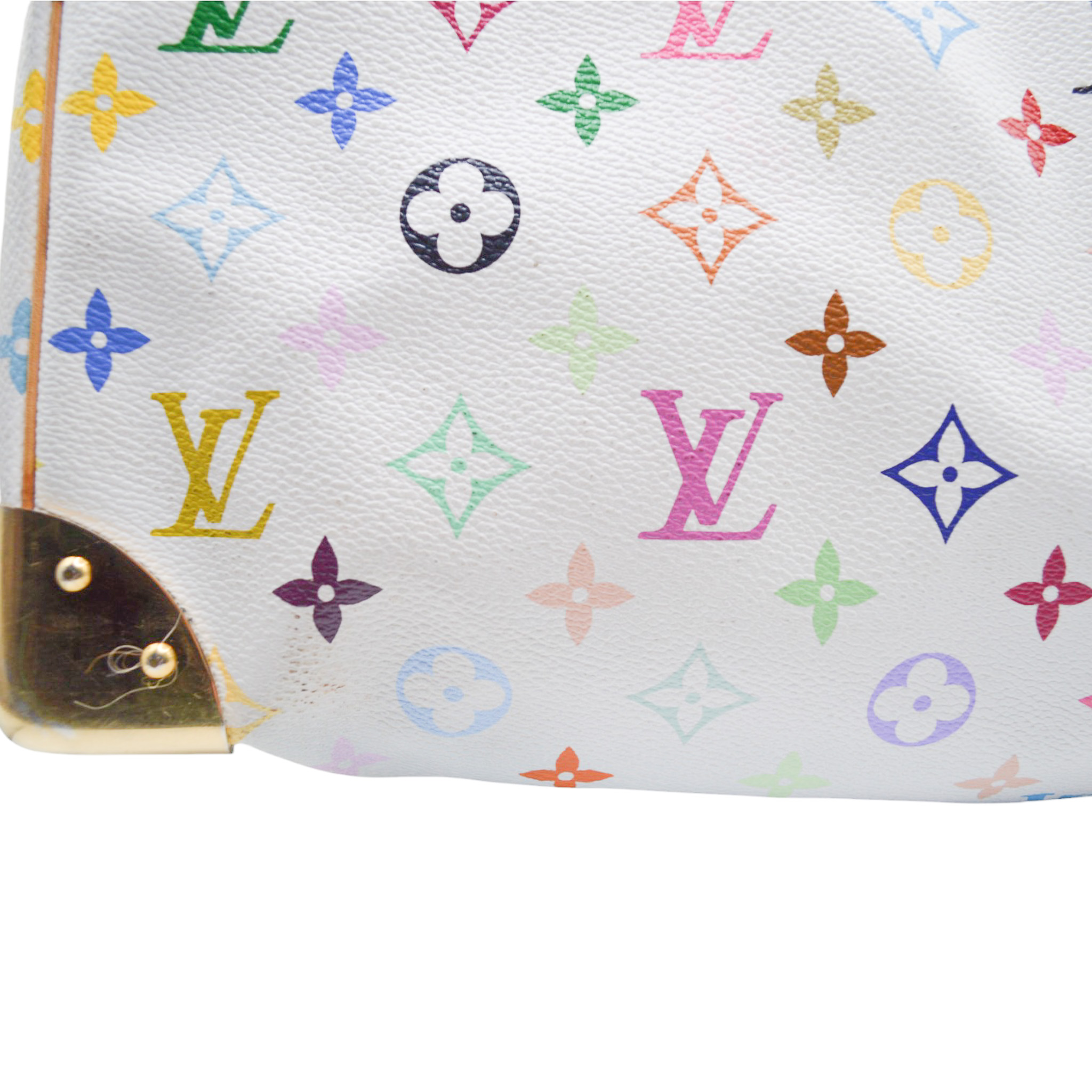 White multicolor canvas with gold hardware, vachetta leather trim, Interior is lined in burgundy alcantara and has one slit pocket on the rear wall. Date code SP0076 (Made in France July 2006). From the Louis Vuitton x Takashi Murakami, Marc Jacobs collection. Bag is in very good, used condition- please refer to photos for signs of wear, including some transfer color on the edge/front, worn edges of metal footers, pen marks in inside pocket, and wearing to front pocket. Dust bag included and shopping bag, if wanted. Shopping bag may need folded to fit in shipping box.