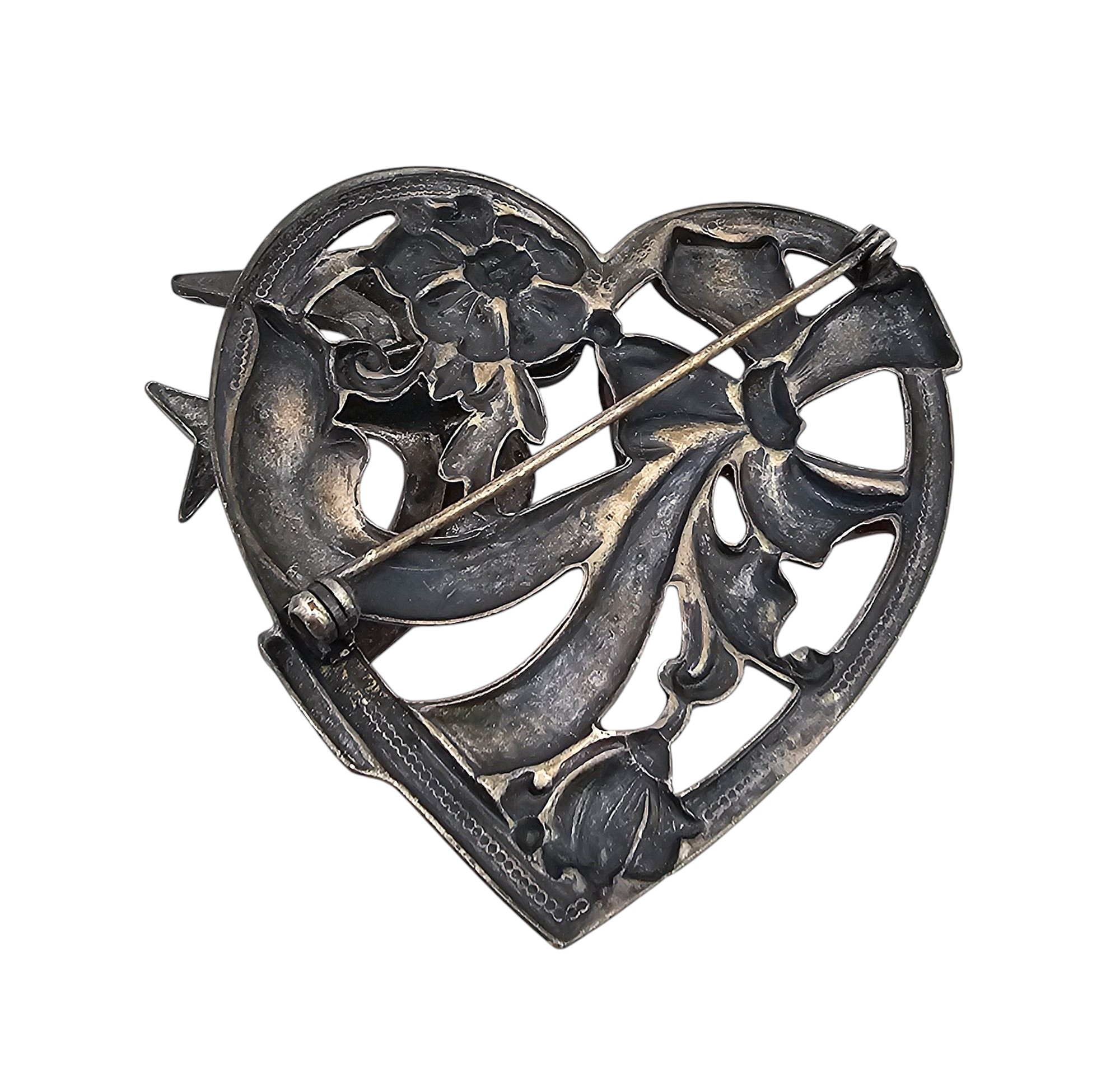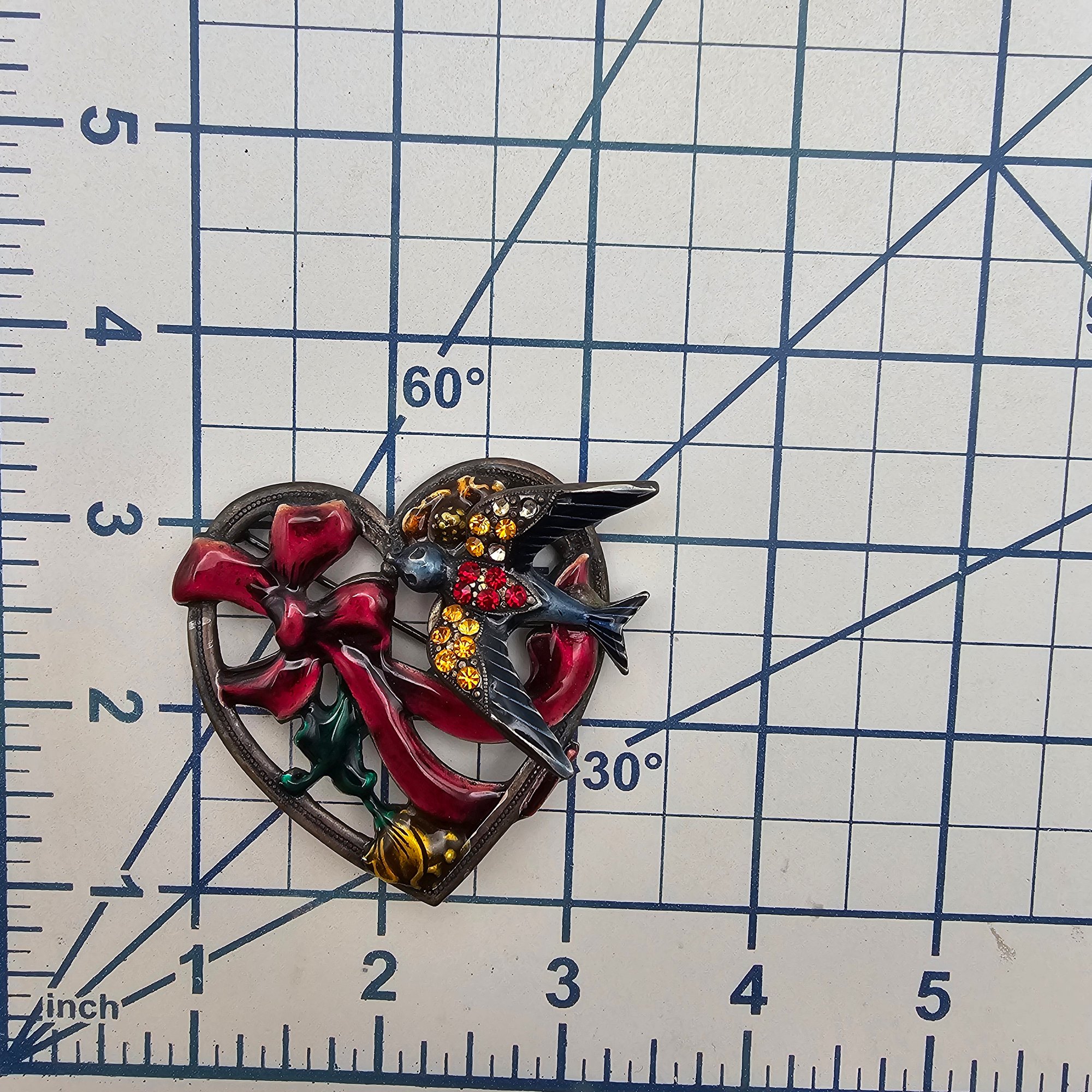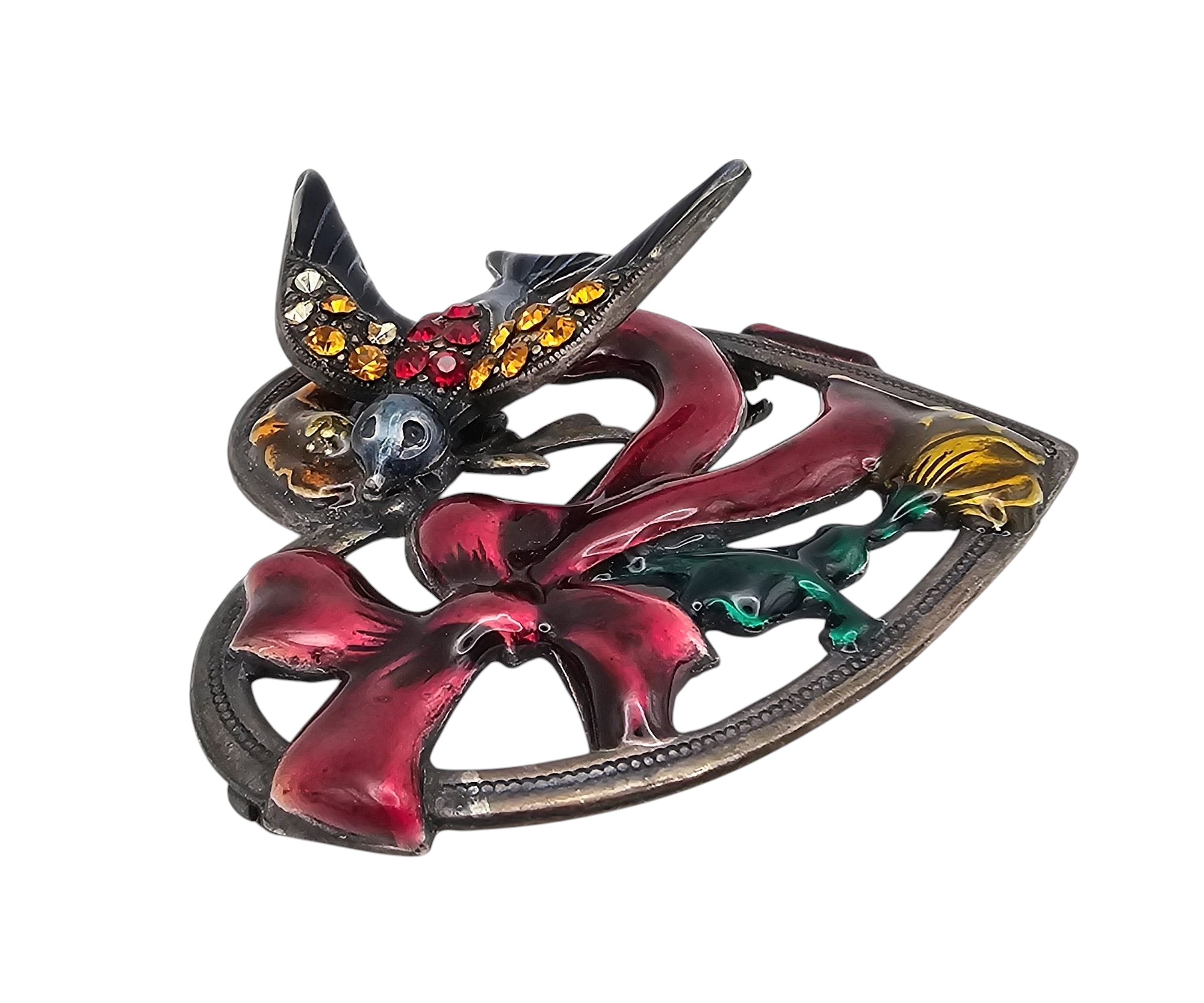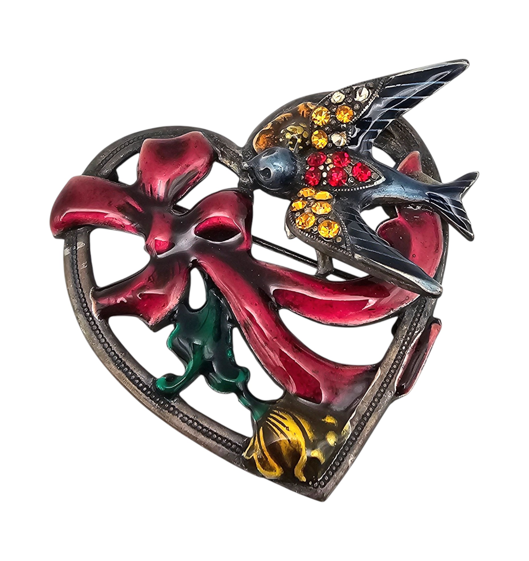 Vintage Enamel Rhinestone Sterling Silver Heart Bird Brooch 21 G