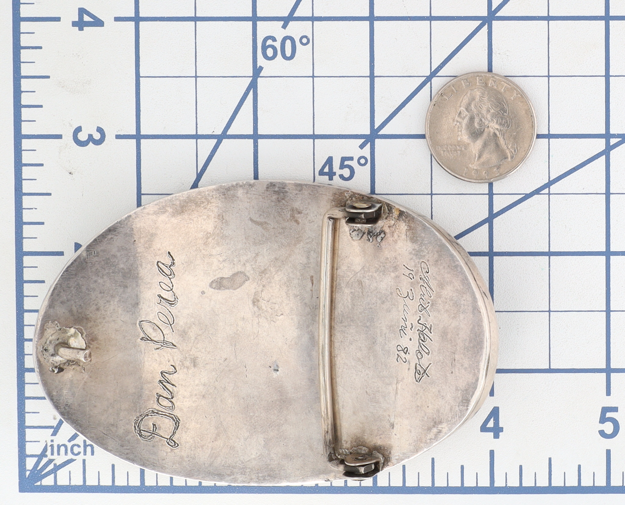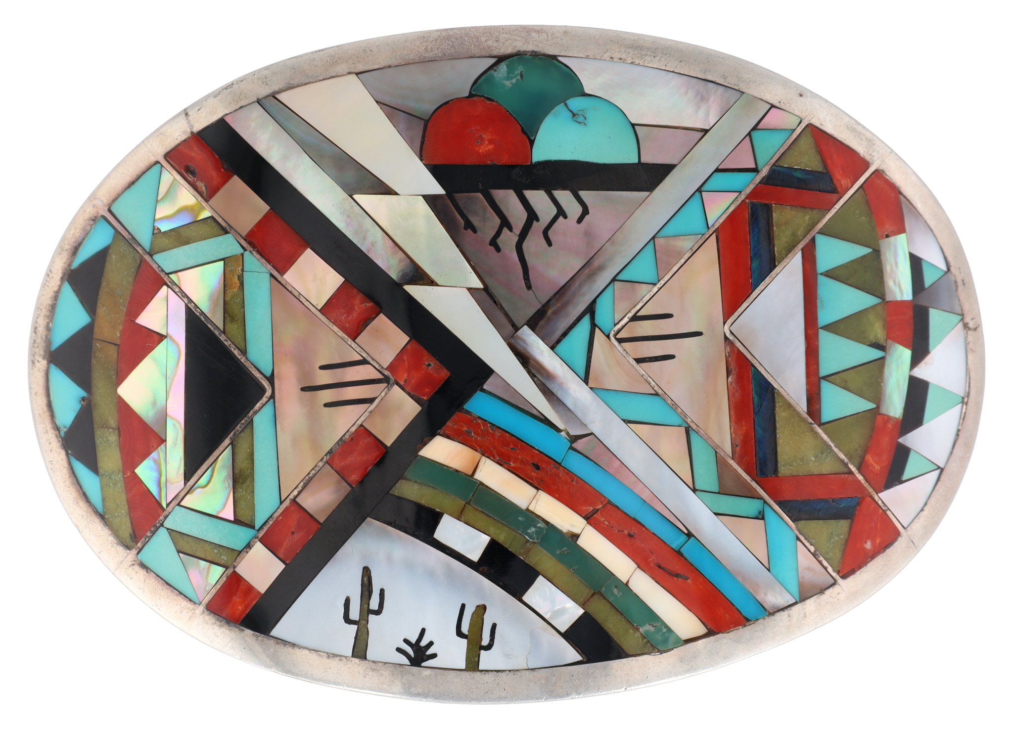 Notes: Signed Alrit Halote Zuni and Dan Perea. The details on this piece are remarkable! The longer you look at it, the more intricate elements you see. For example, at the top center, there appears to be a lightning bolt set in mother of pearl, accompanied by storm clouds and rain. The artist appeared to use abalone or shell to represent a dark and stormy sky. Check out the cacti at the bottom. Amazing piece!