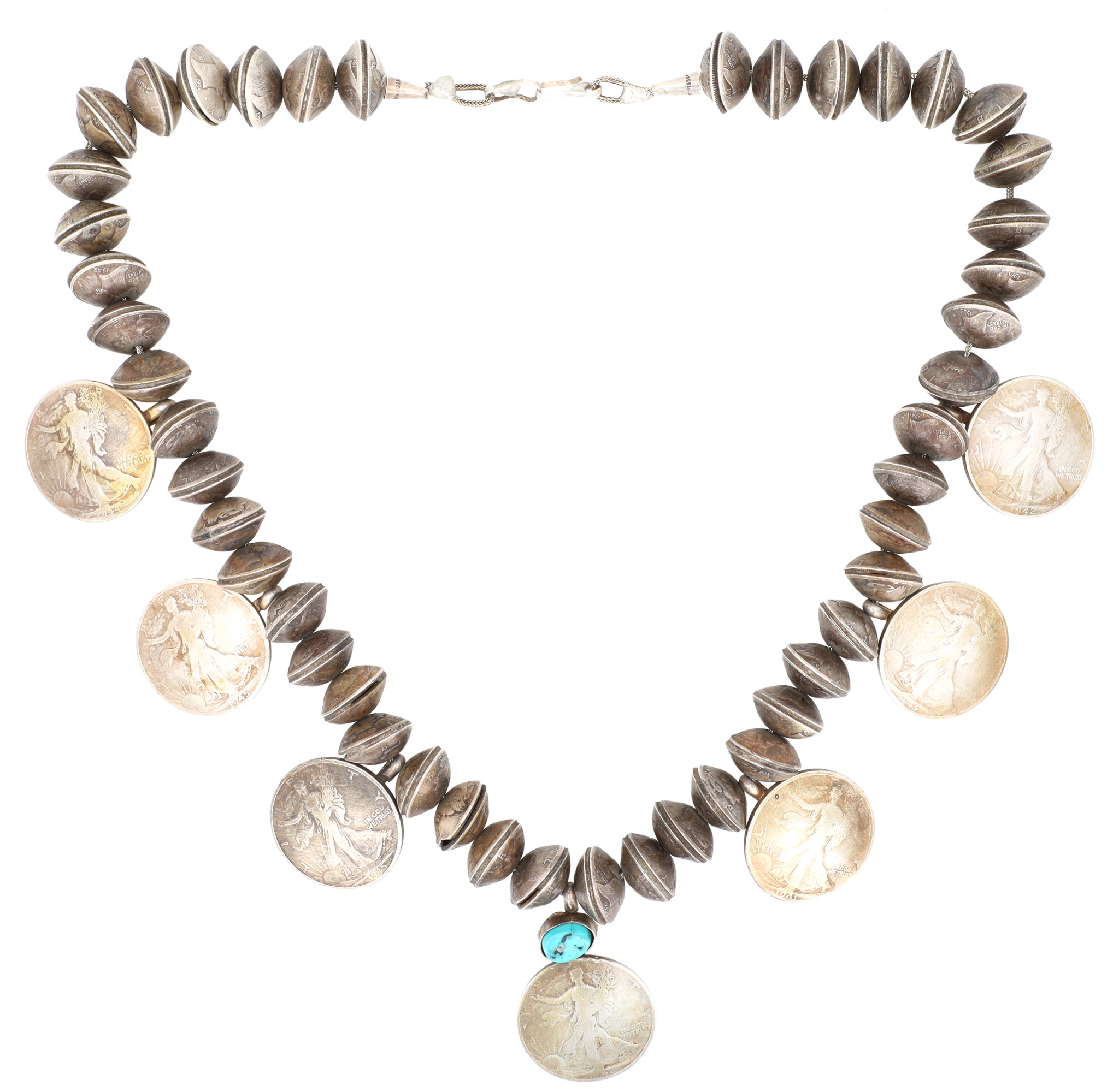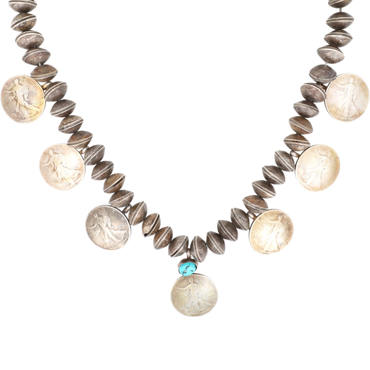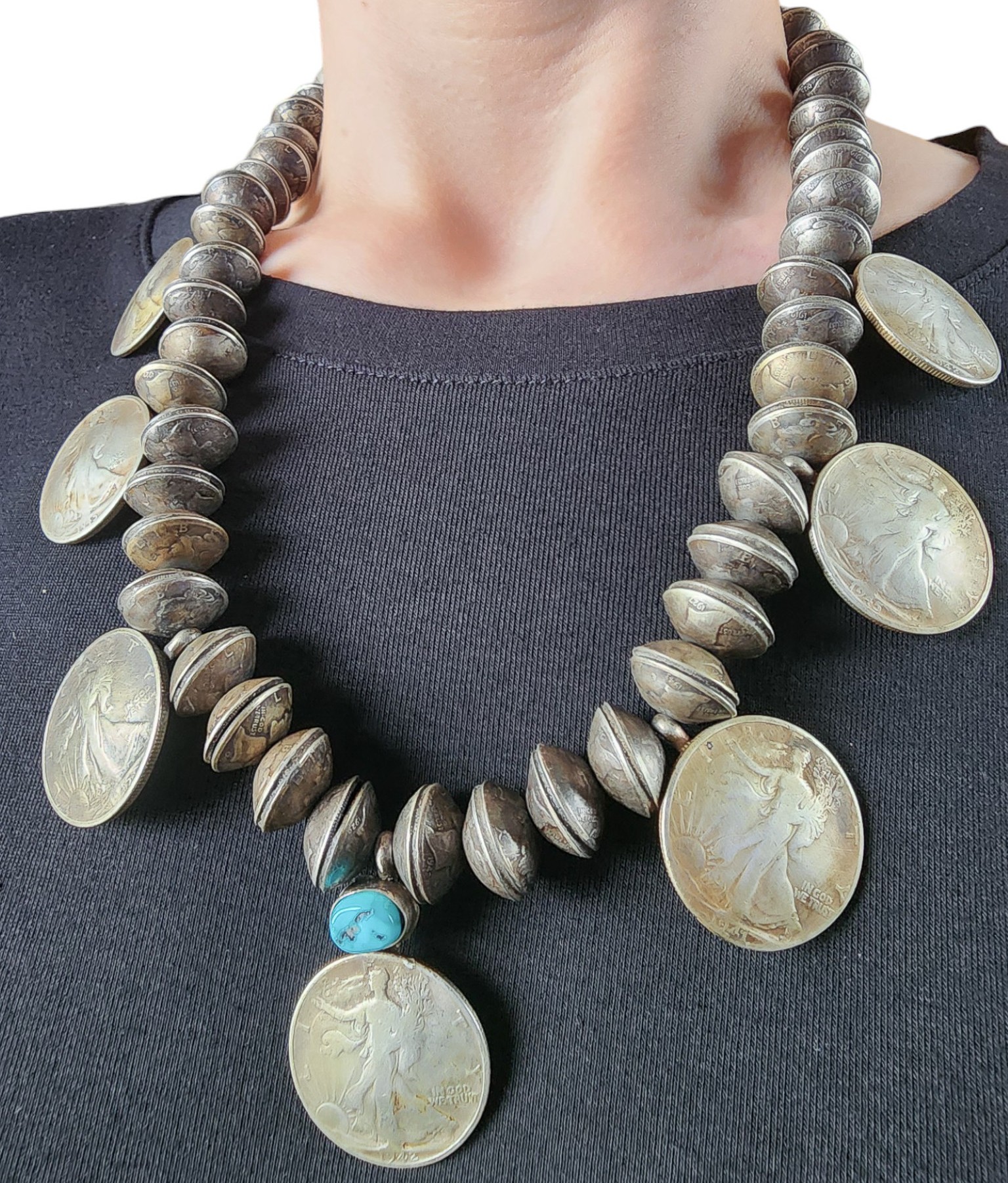 One of a kind! Vintage Navajo Turquoise Sterling Handmade 1940’s Mercury Dime and Walking Liberty Half Dollar Coin Bead Necklace