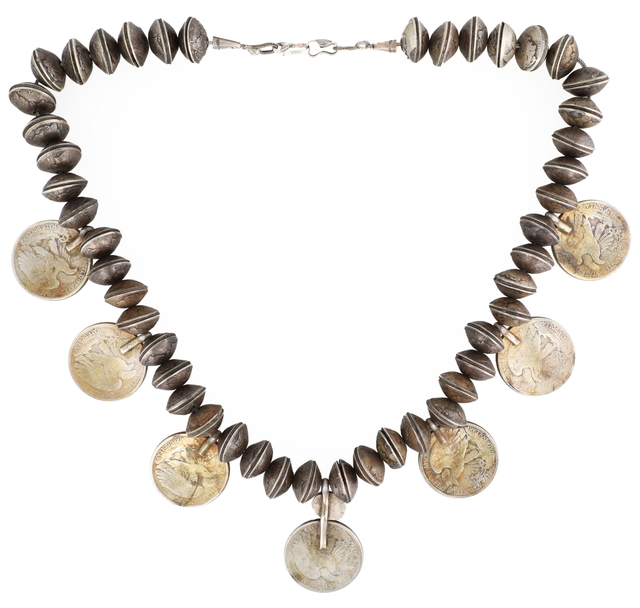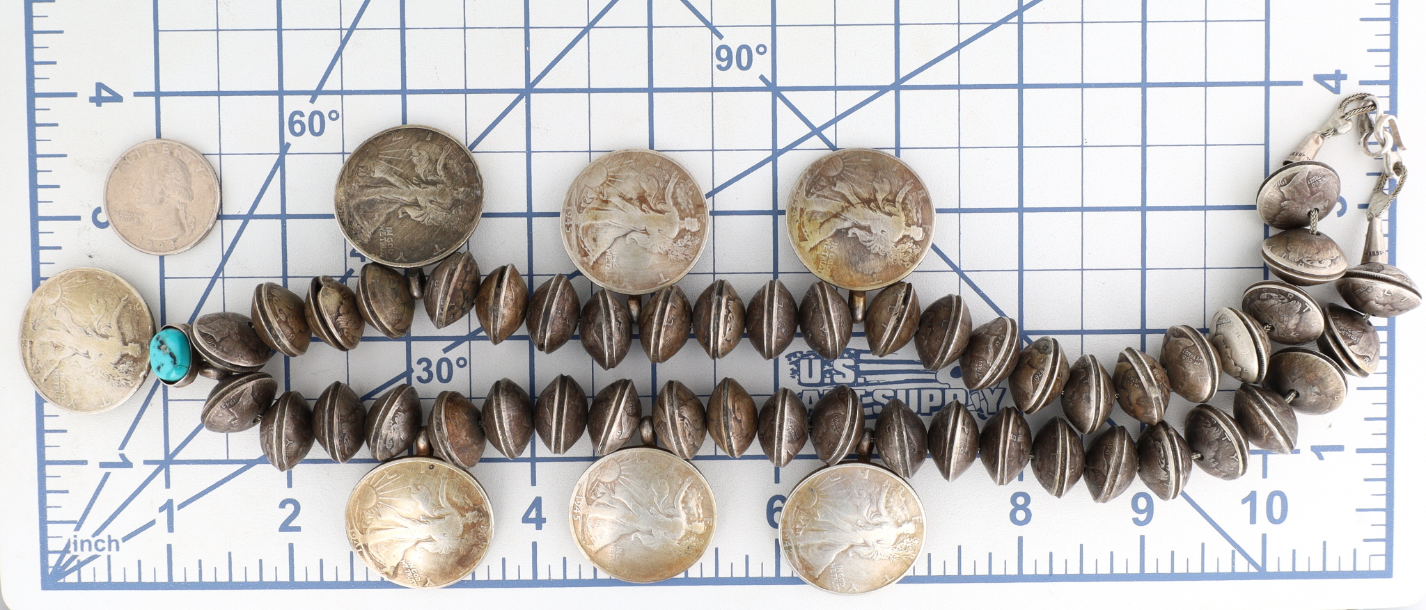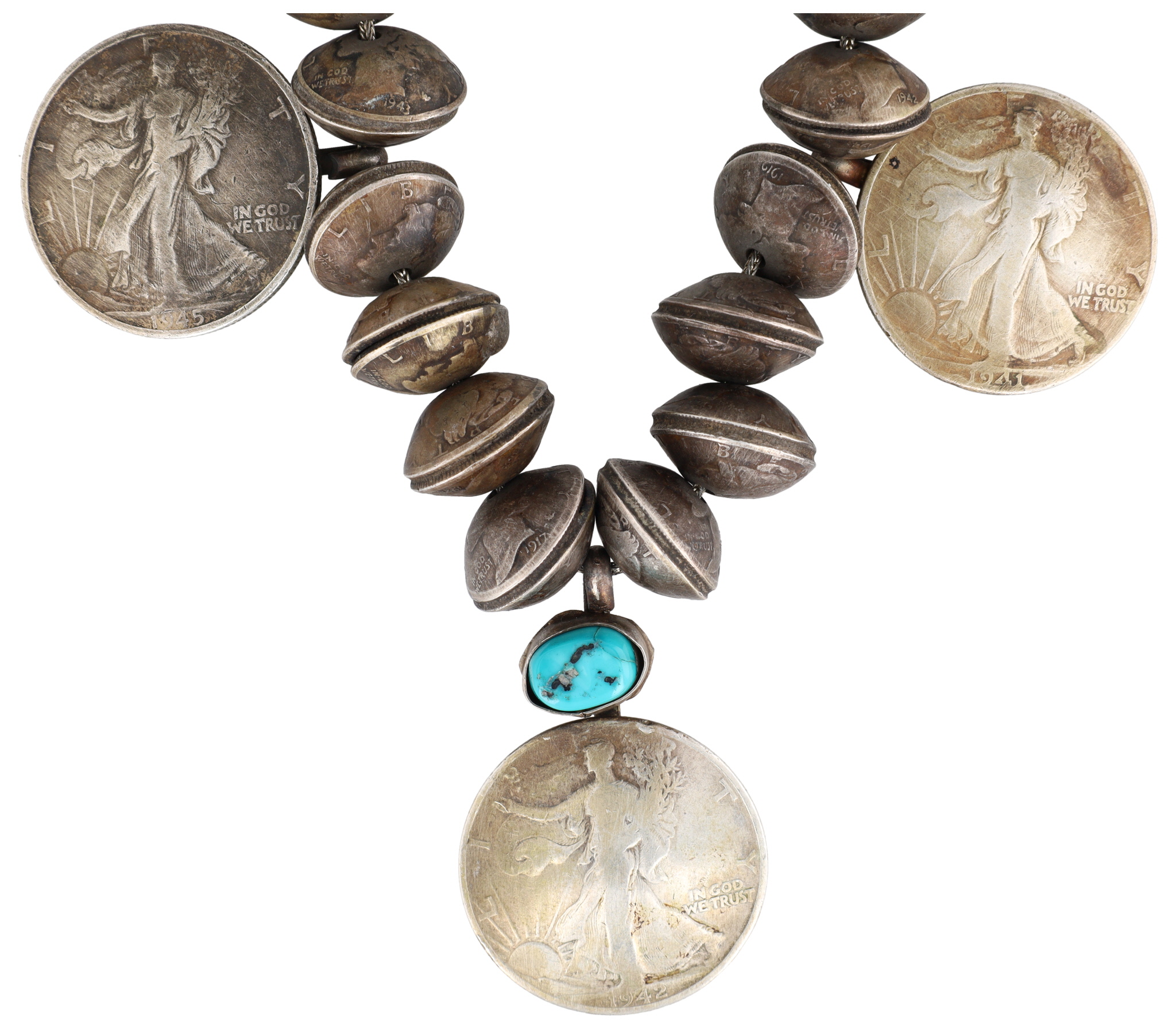 One of a kind! Vintage Navajo Turquoise Sterling Handmade 1940’s Mercury Dime and Walking Liberty Half Dollar Coin Bead Necklace