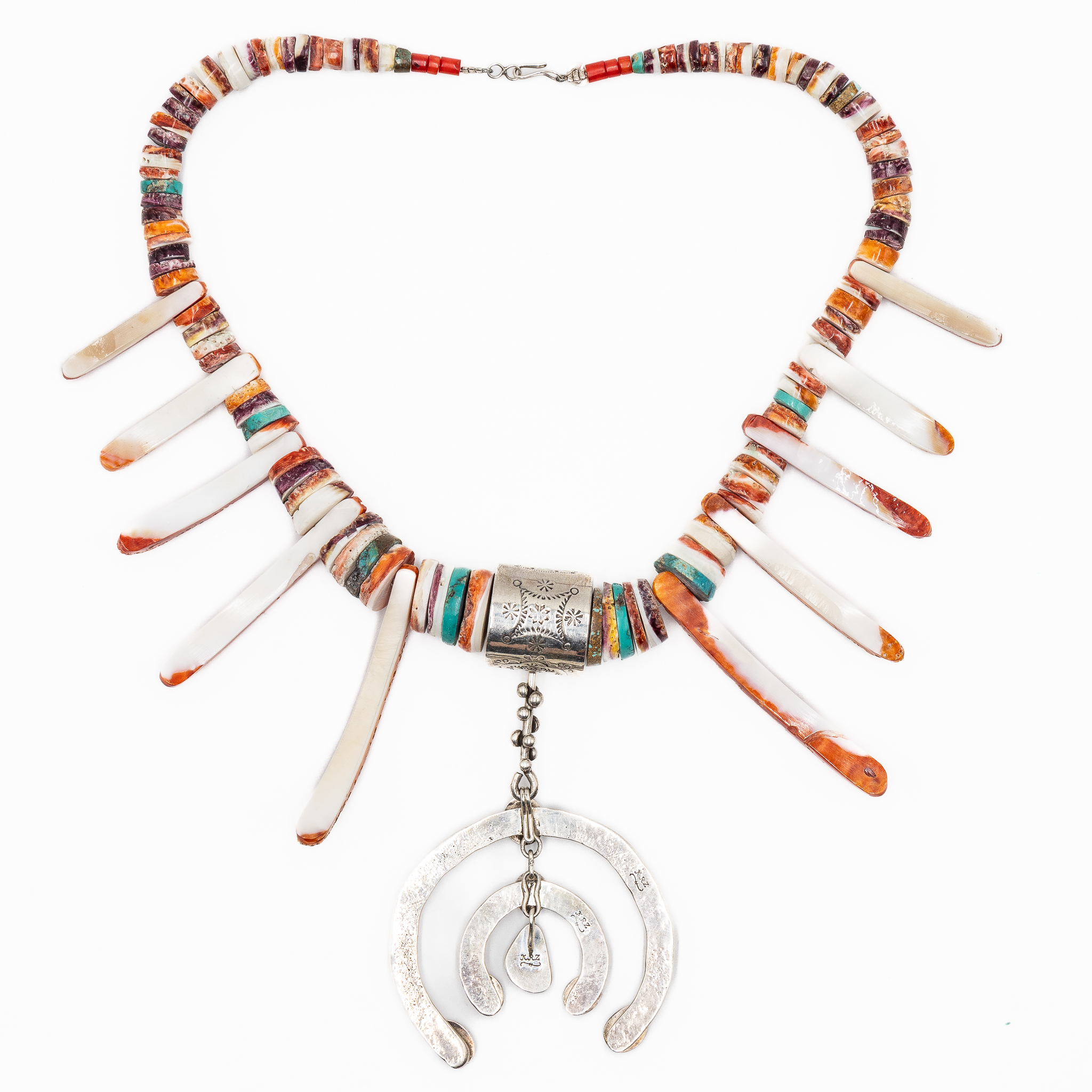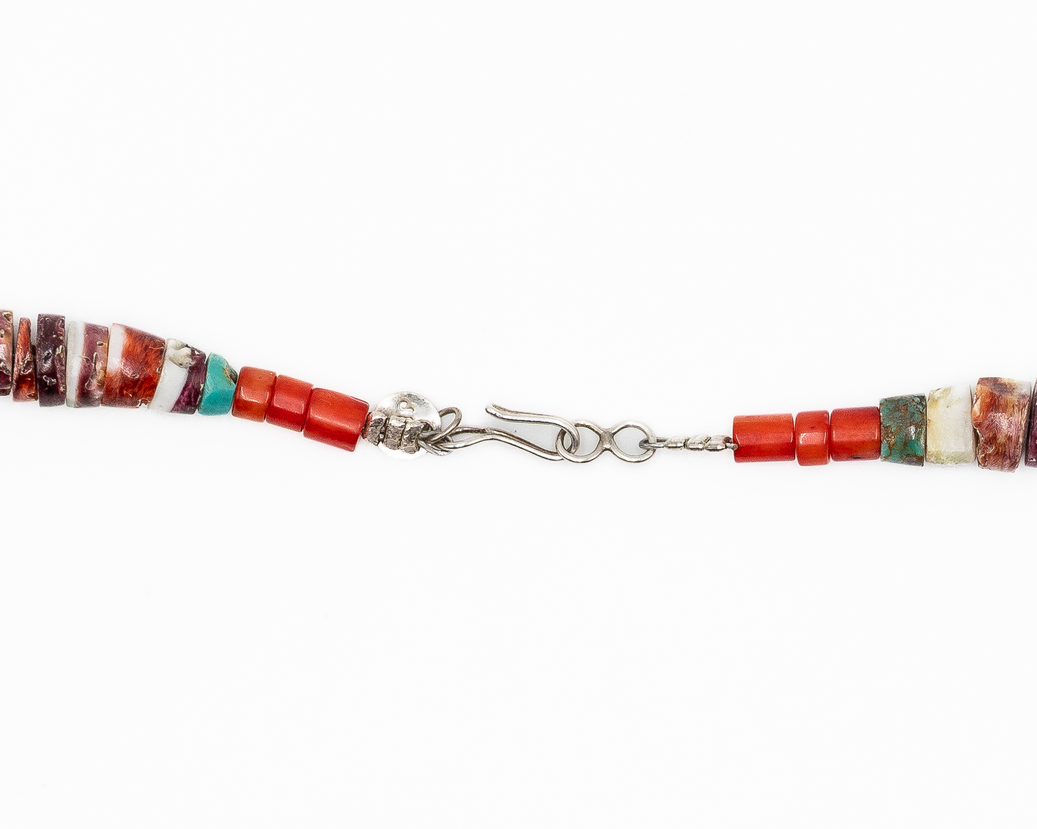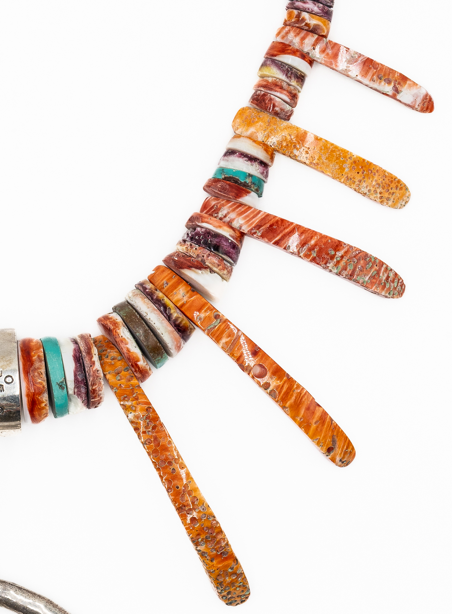 Jolene Bird and Kevin Rey Coriz Santo Domingo Spiny Oyster Heishi Tab Sterling Naja Necklace