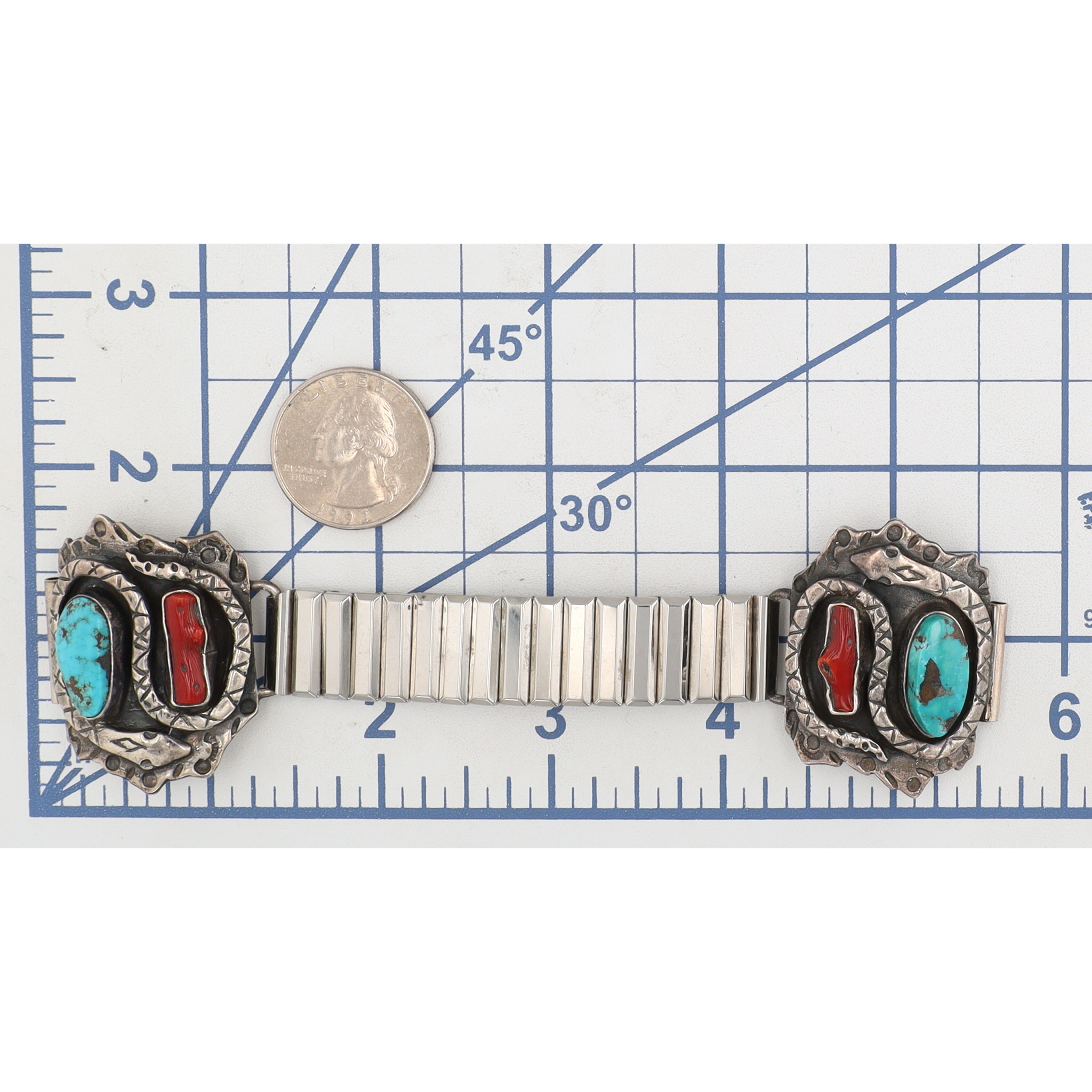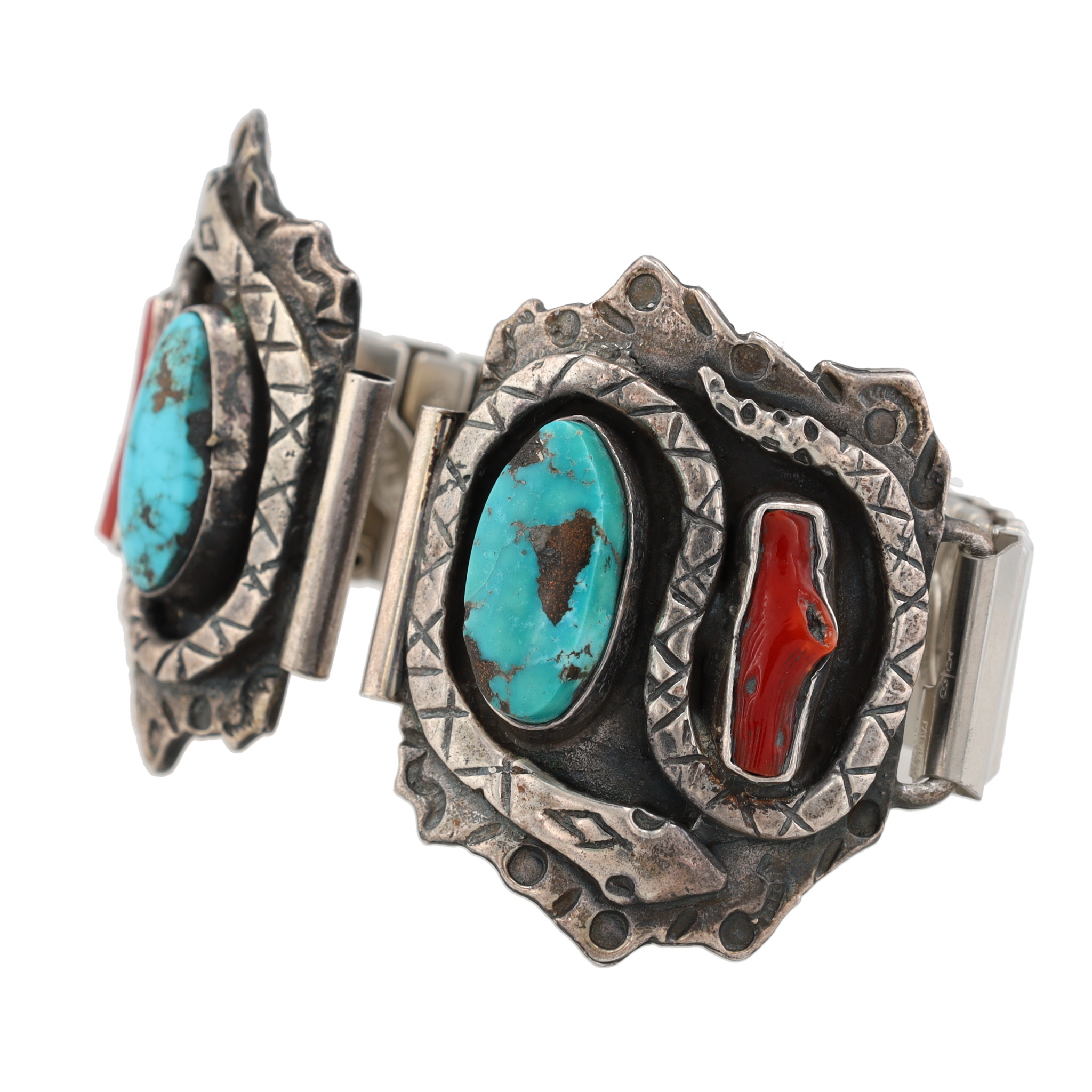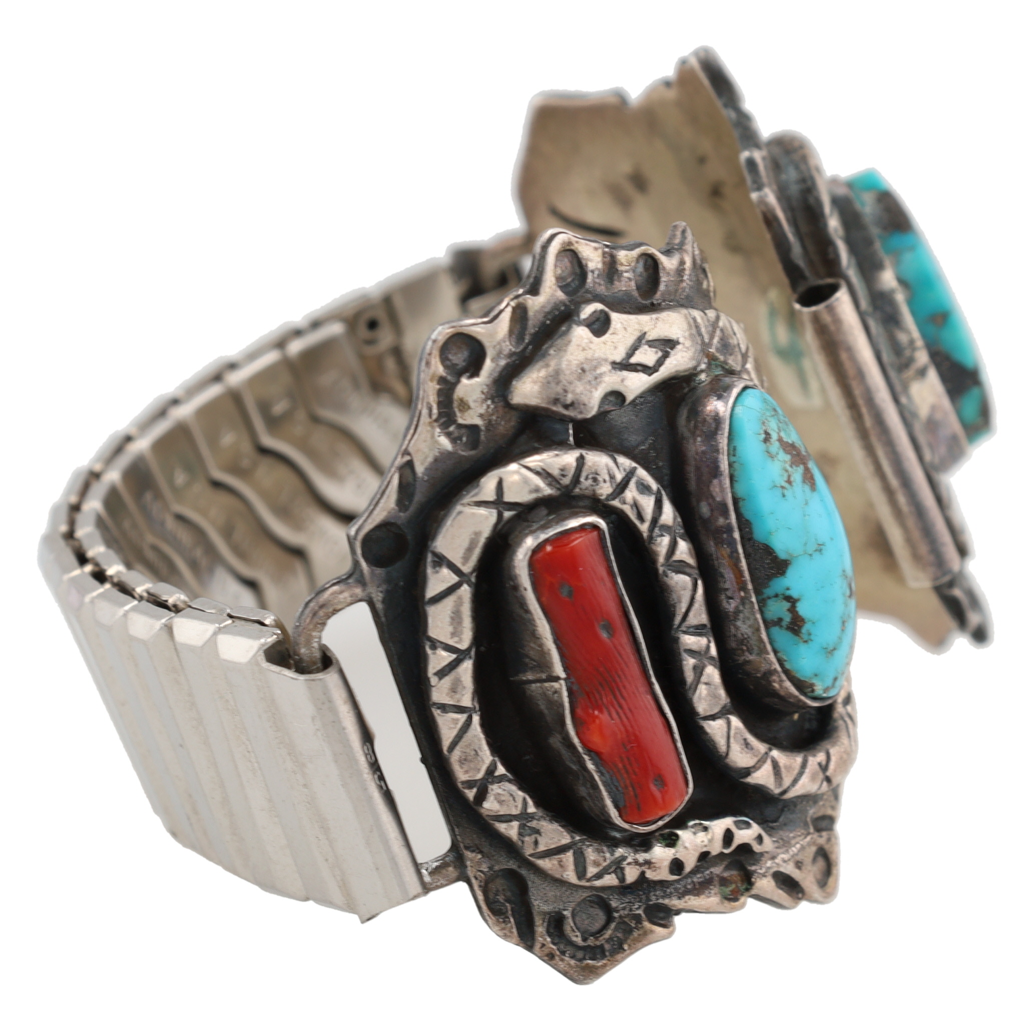 Vintage Navajo Sterling Turquoise Coral Snake Watch Tips