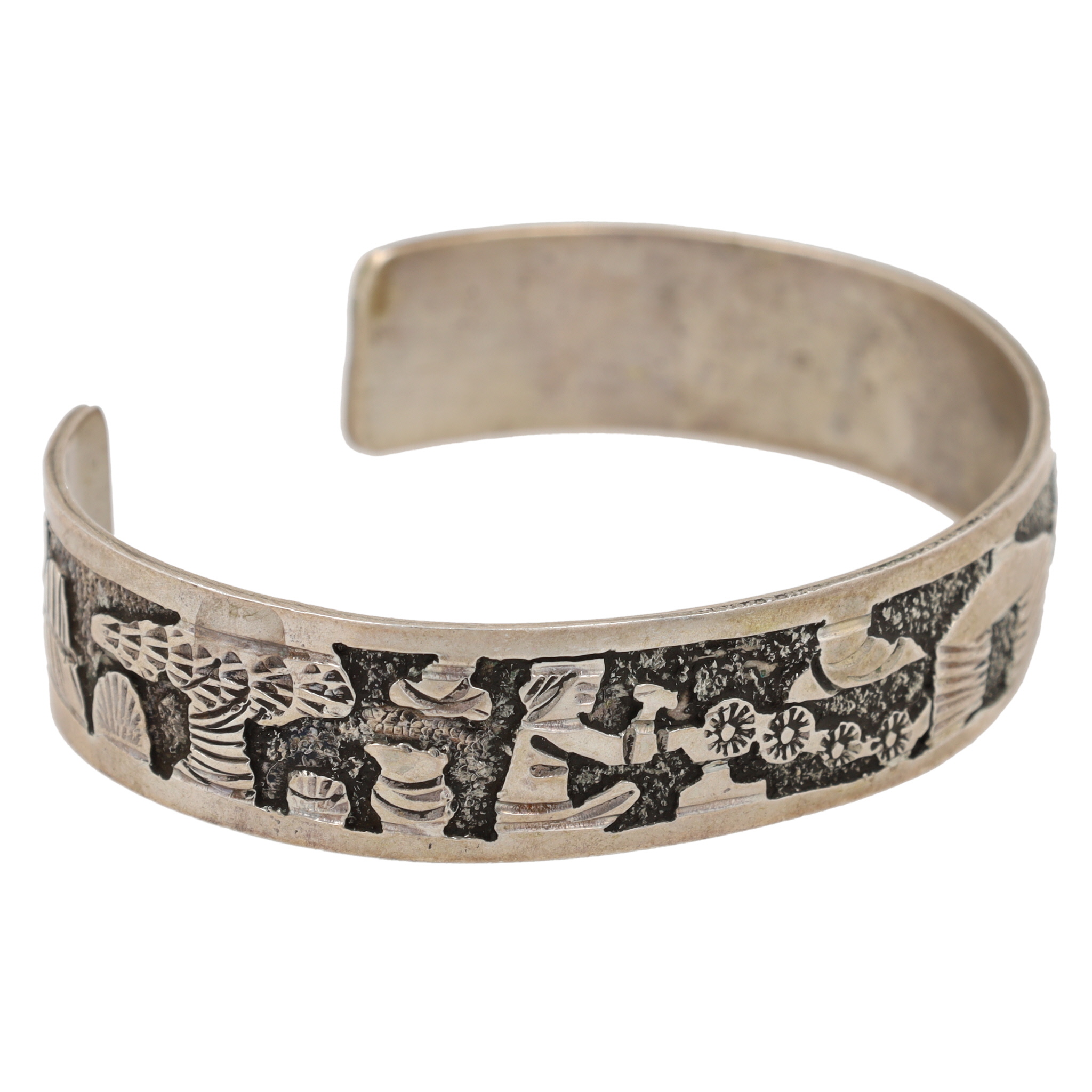 The cuff depicts traditional Navajo themes, including a hogan, a silversmith that appears to be making a piece of jewelry, clouds, mountains, a woman and horse, trees, etc.