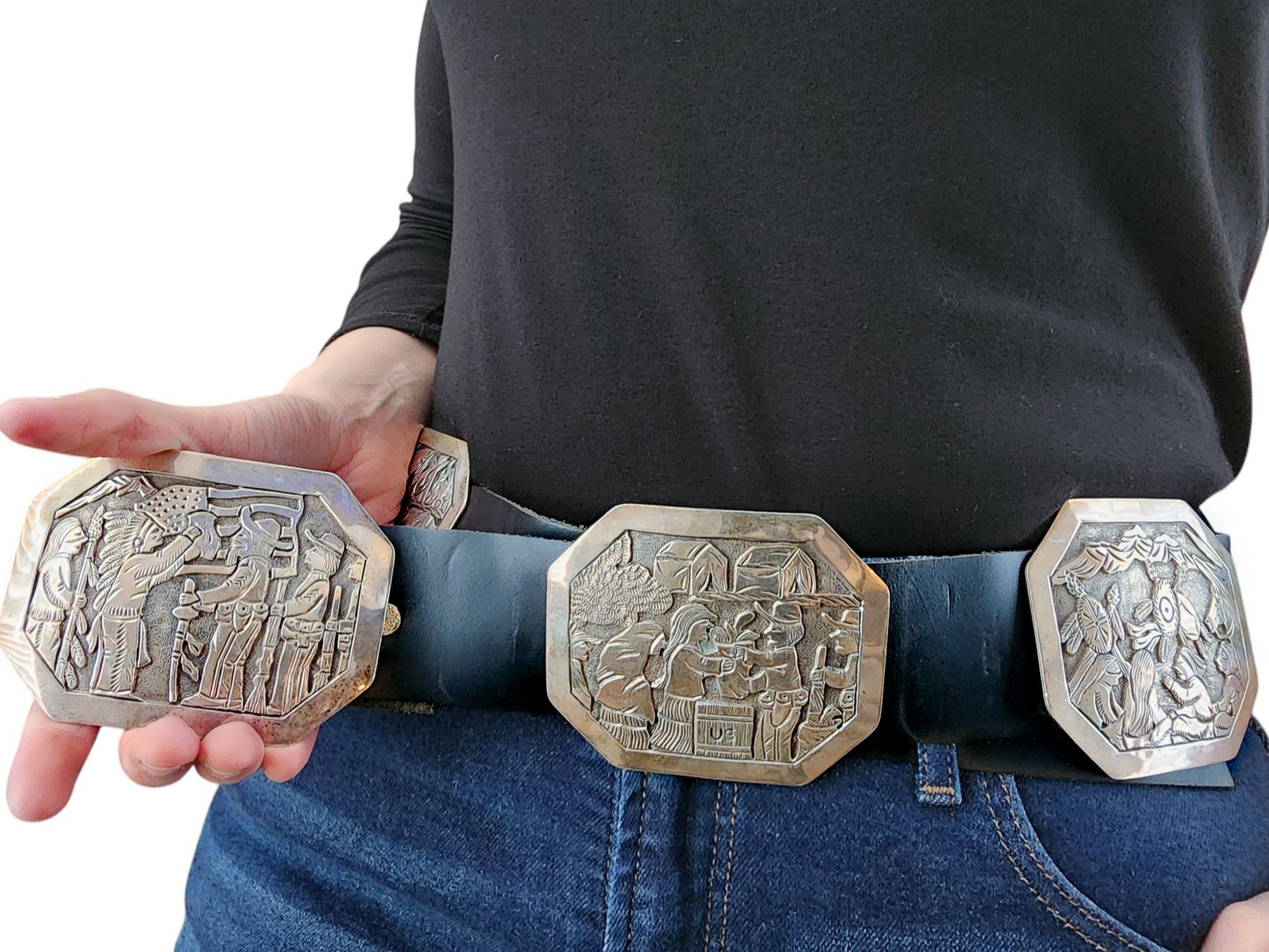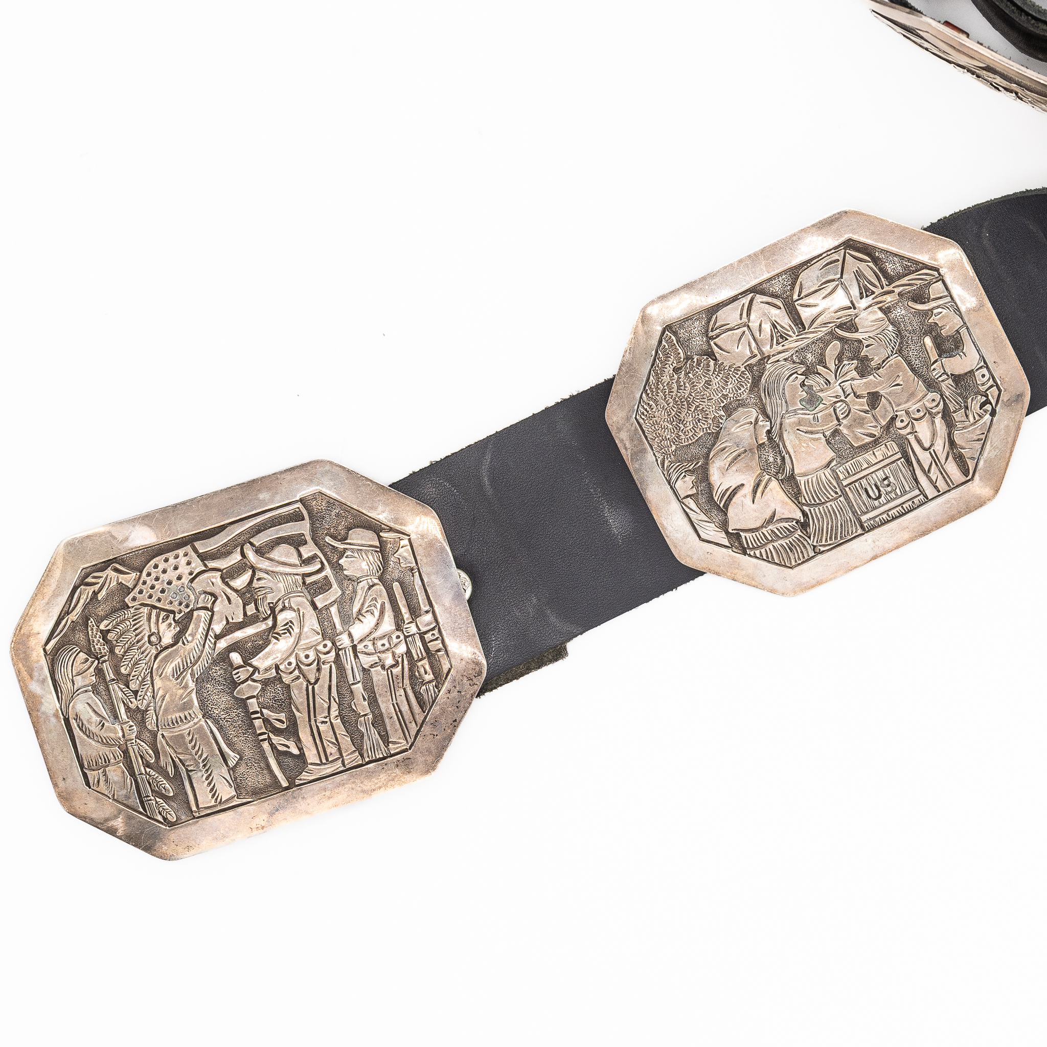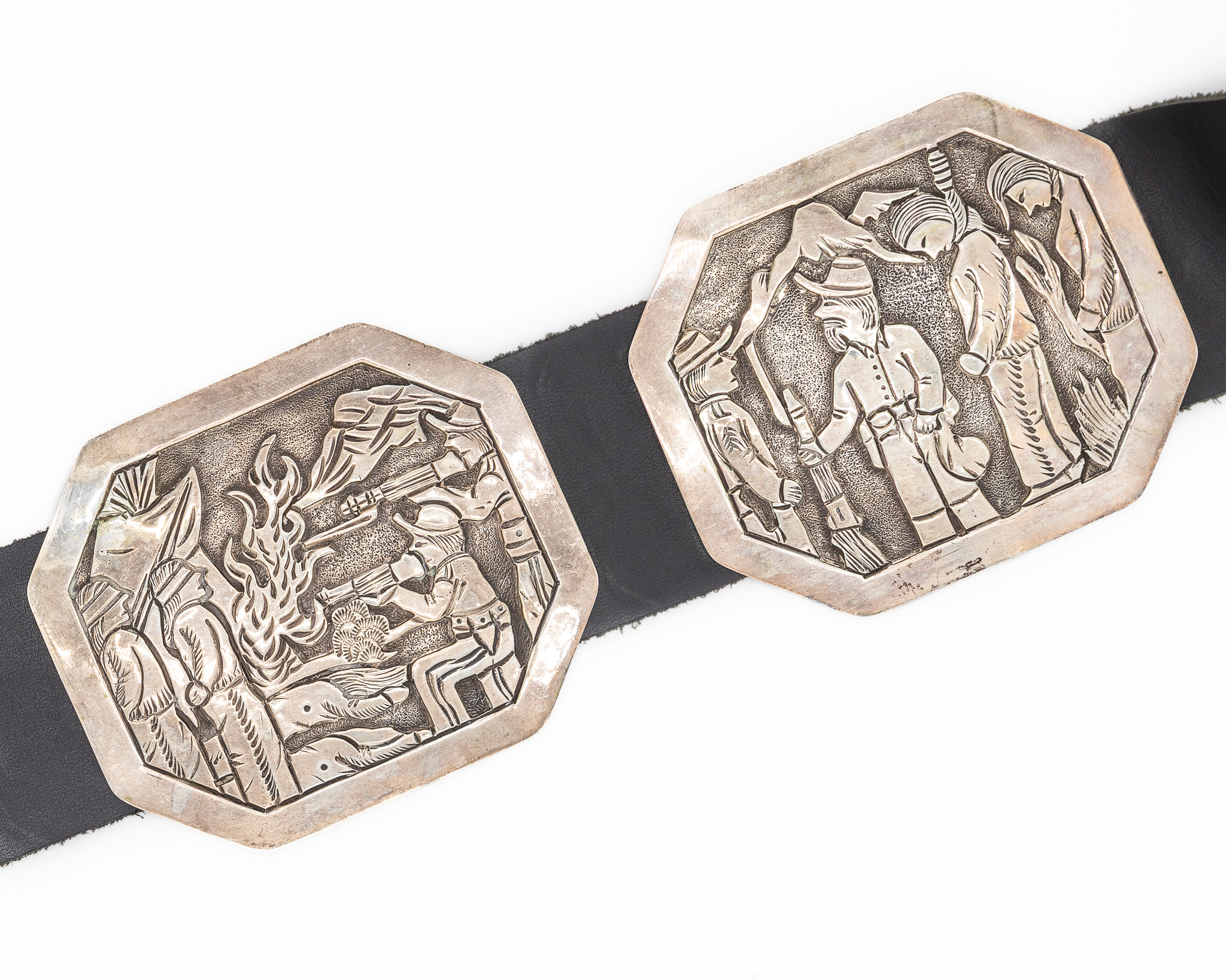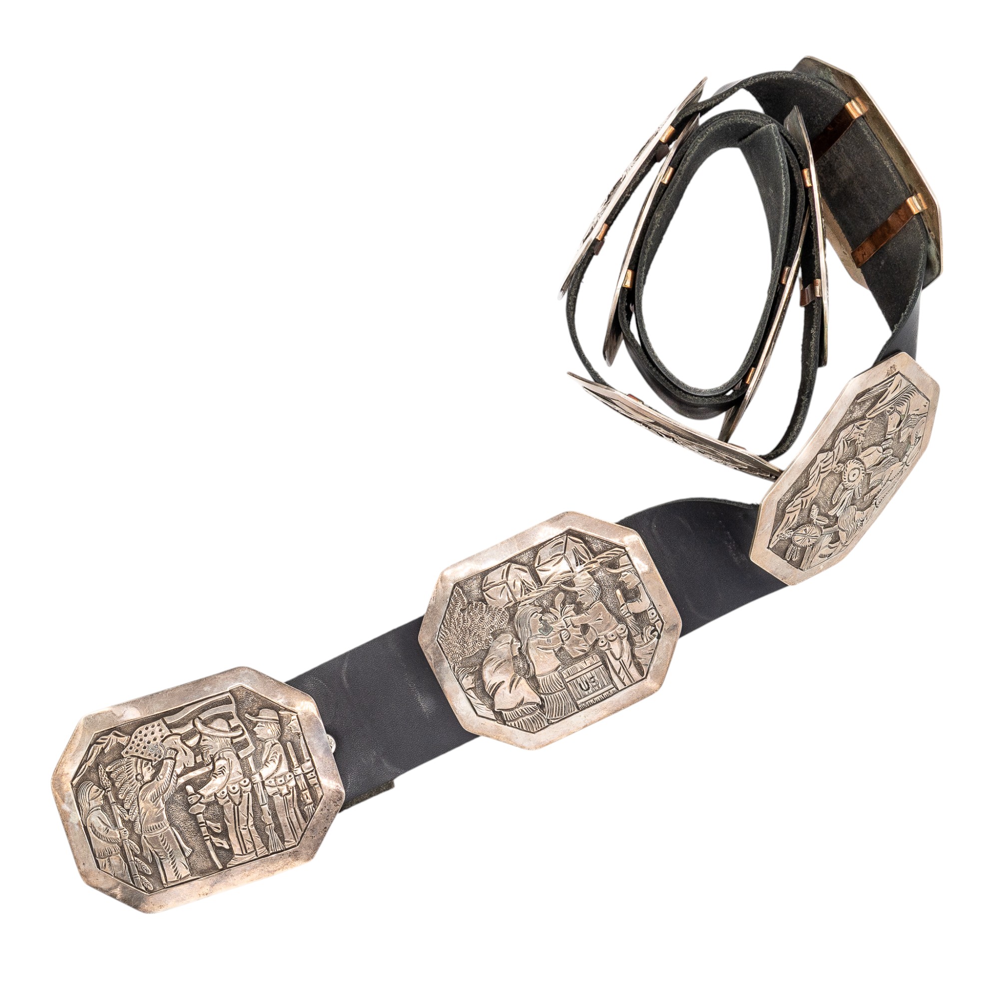 Notes: Hand signed ‘Wounded Knee’ and ‘BCT’. This is a one-of-a-kind, museum-worthy belt depicting the Wounded Knee Massacre, a major event in Native American history.
