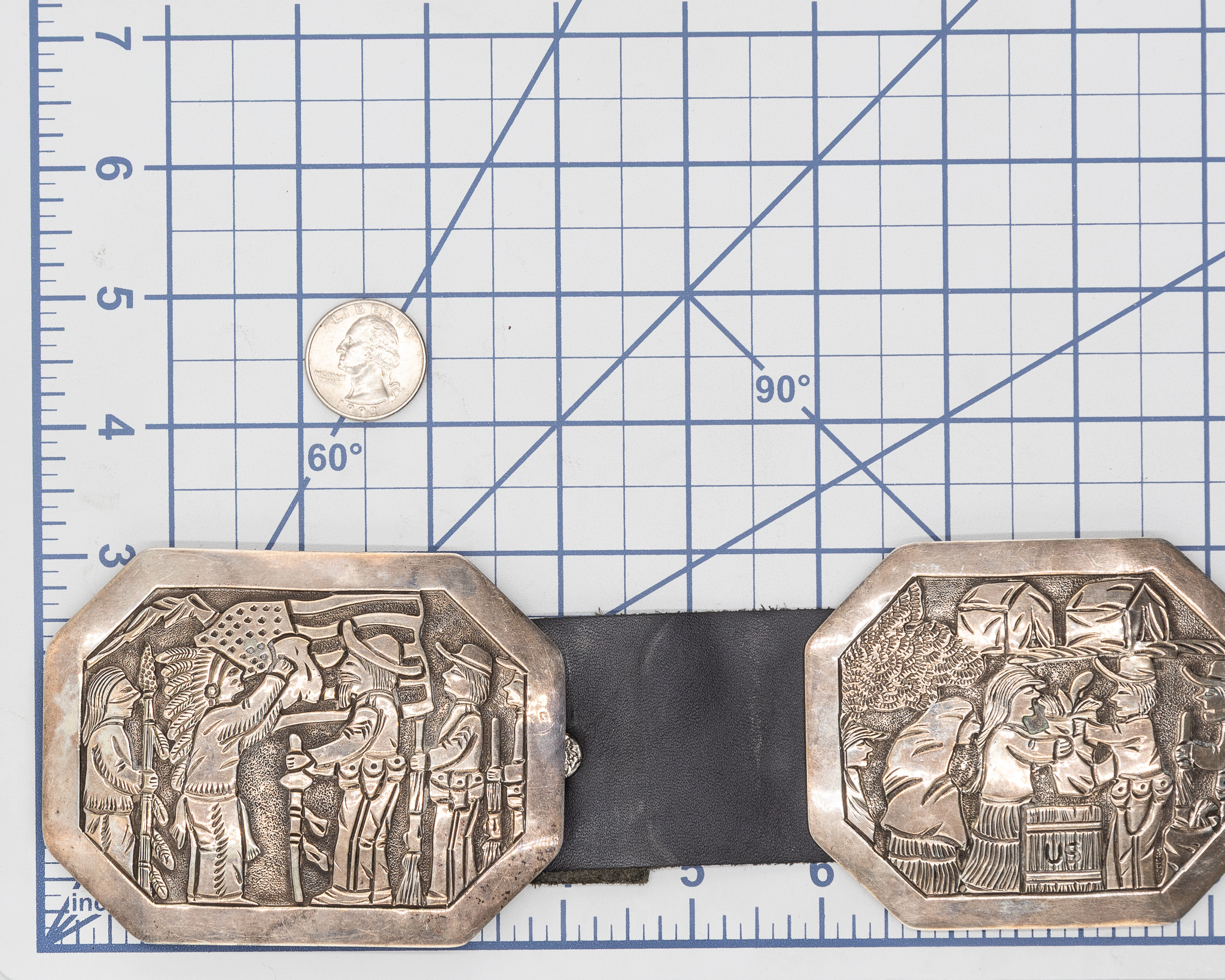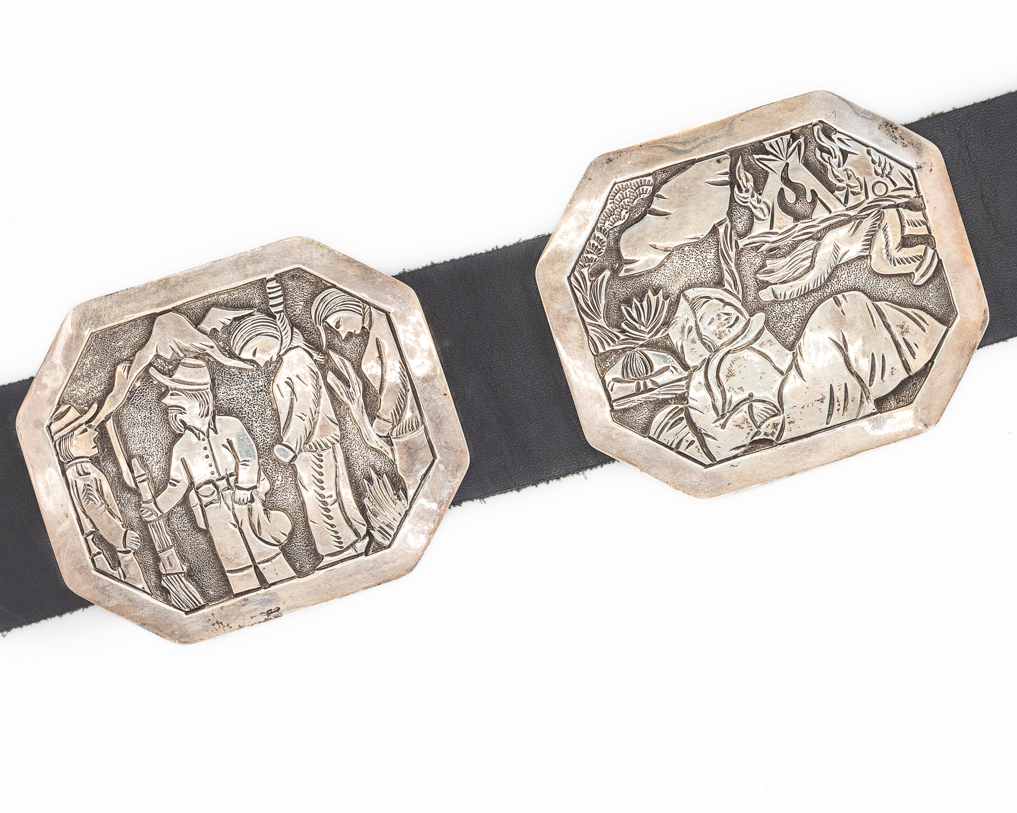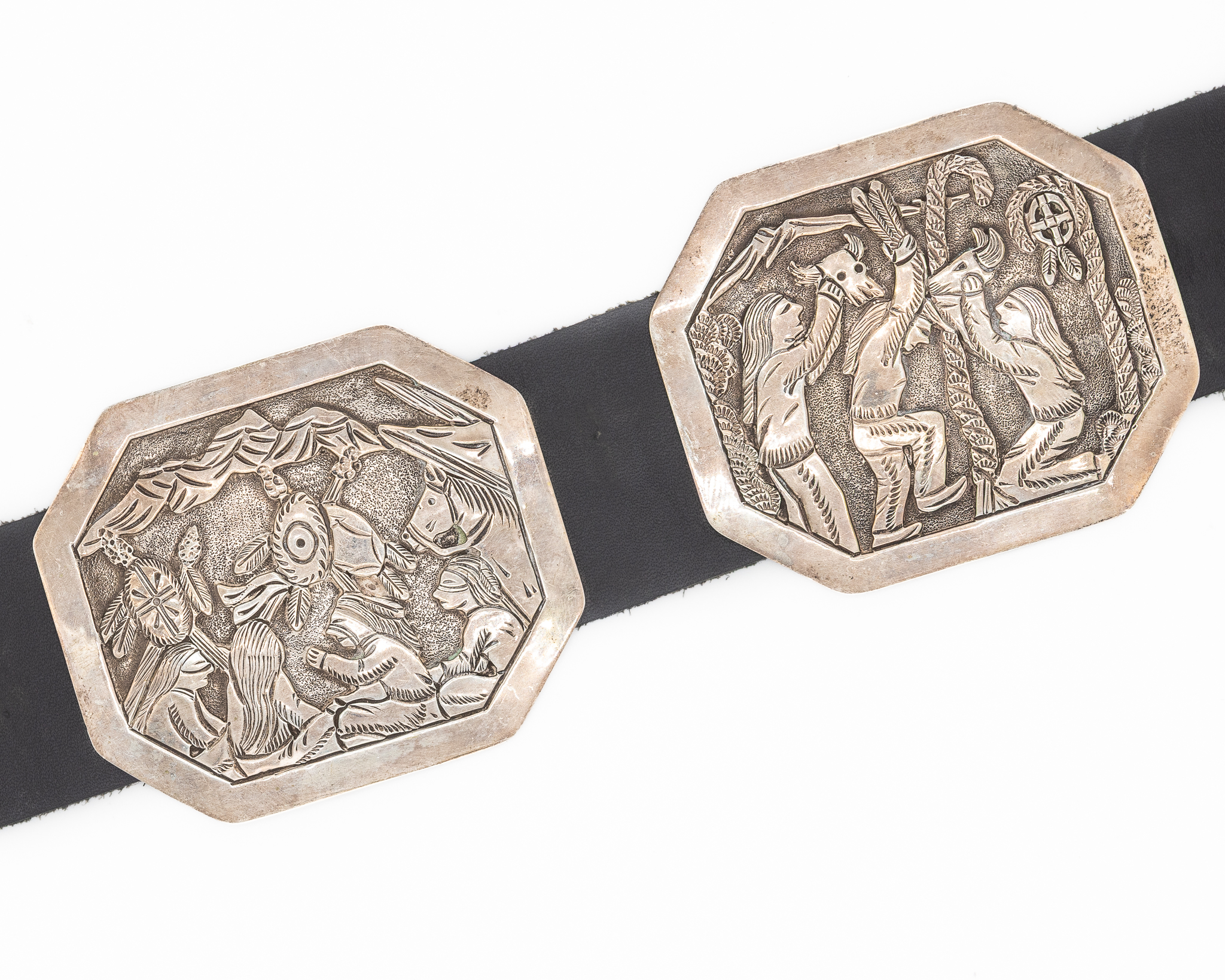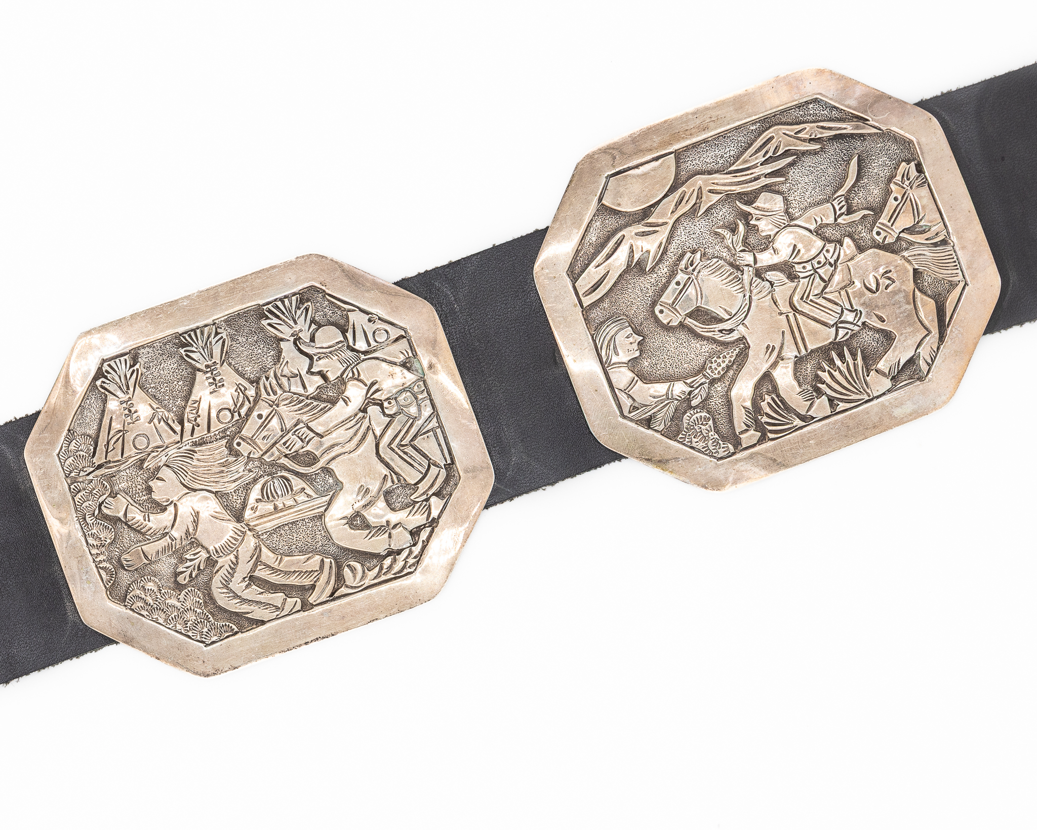 Notes: Hand signed ‘Wounded Knee’ and ‘BCT’. This is a one-of-a-kind, museum-worthy belt depicting the Wounded Knee Massacre, a major event in Native American history.