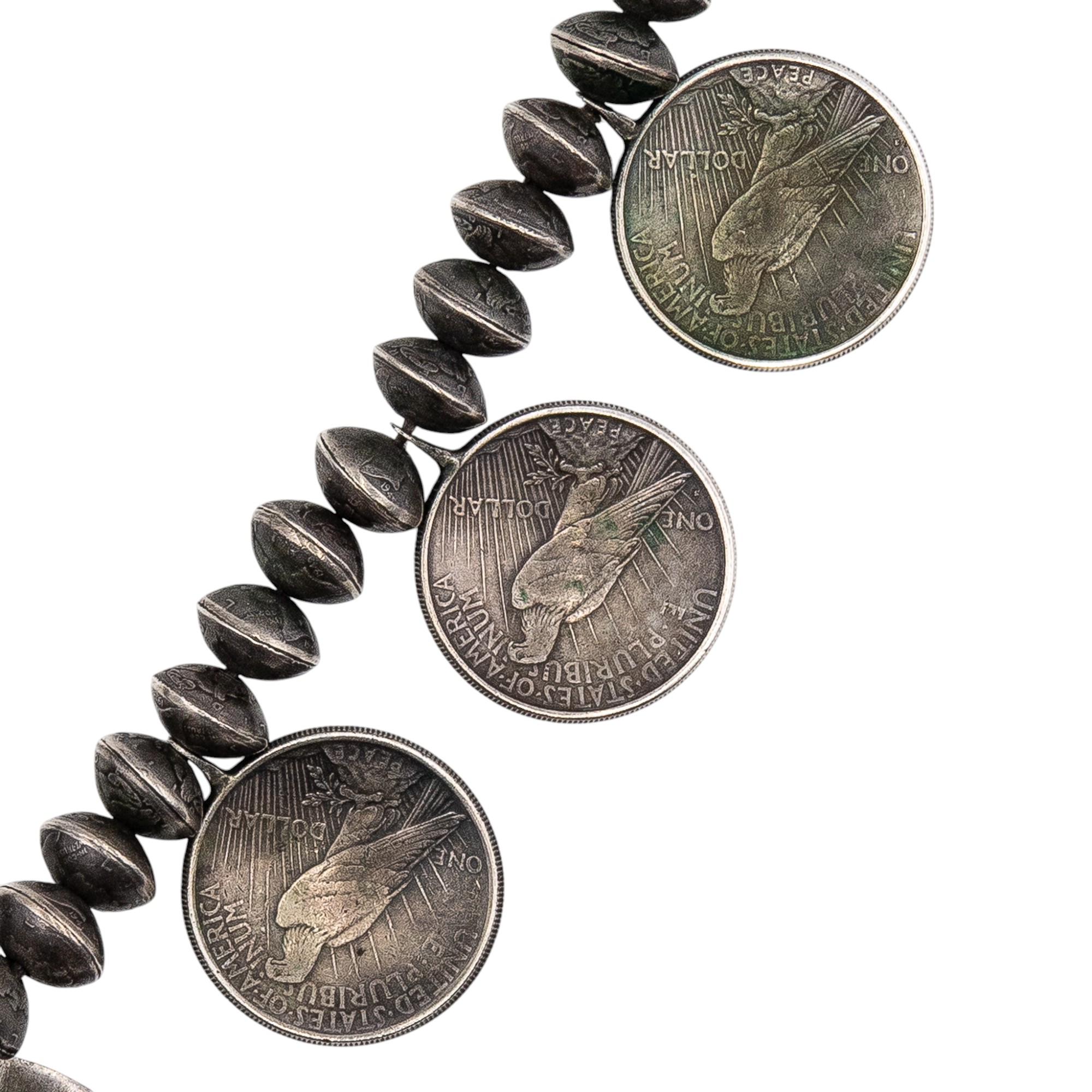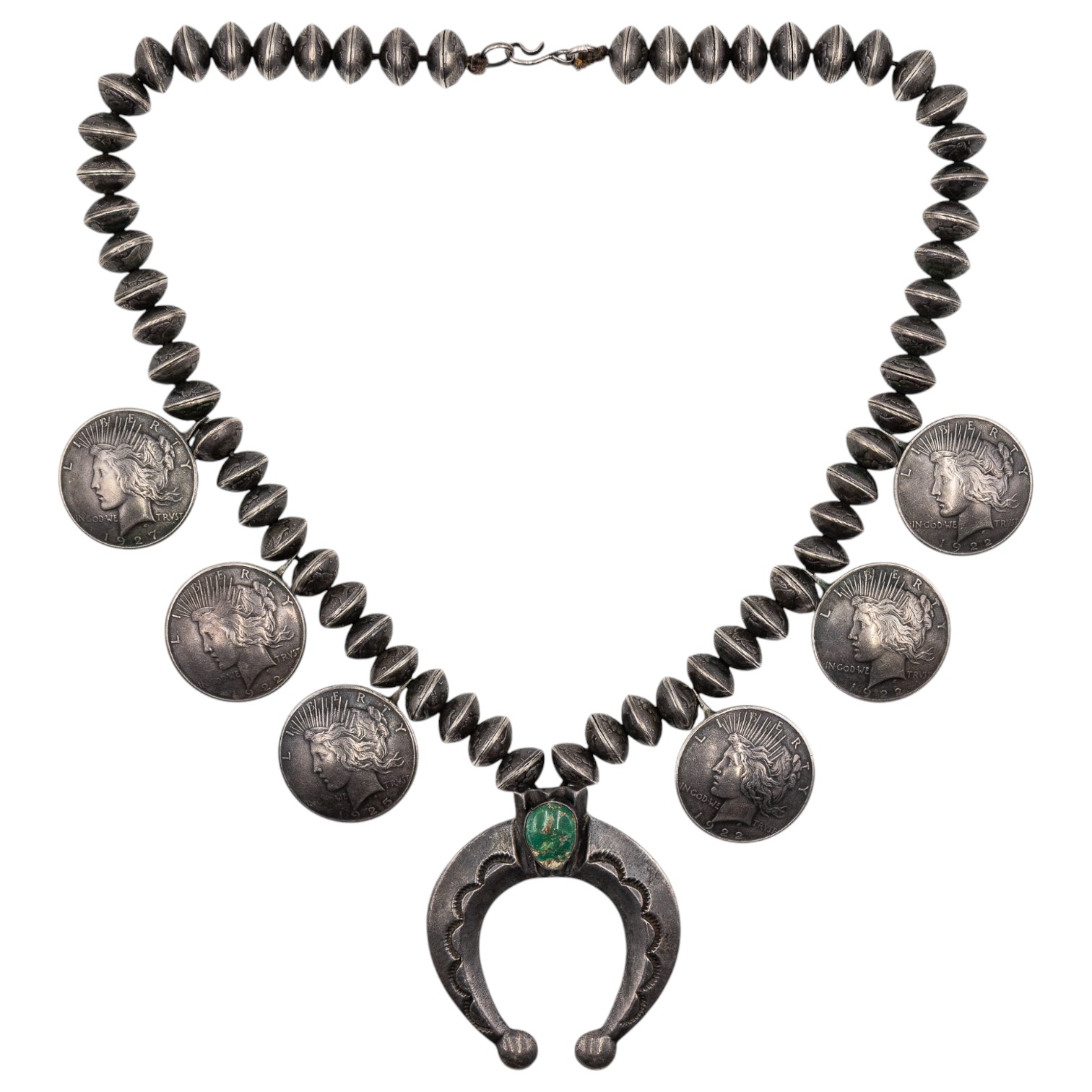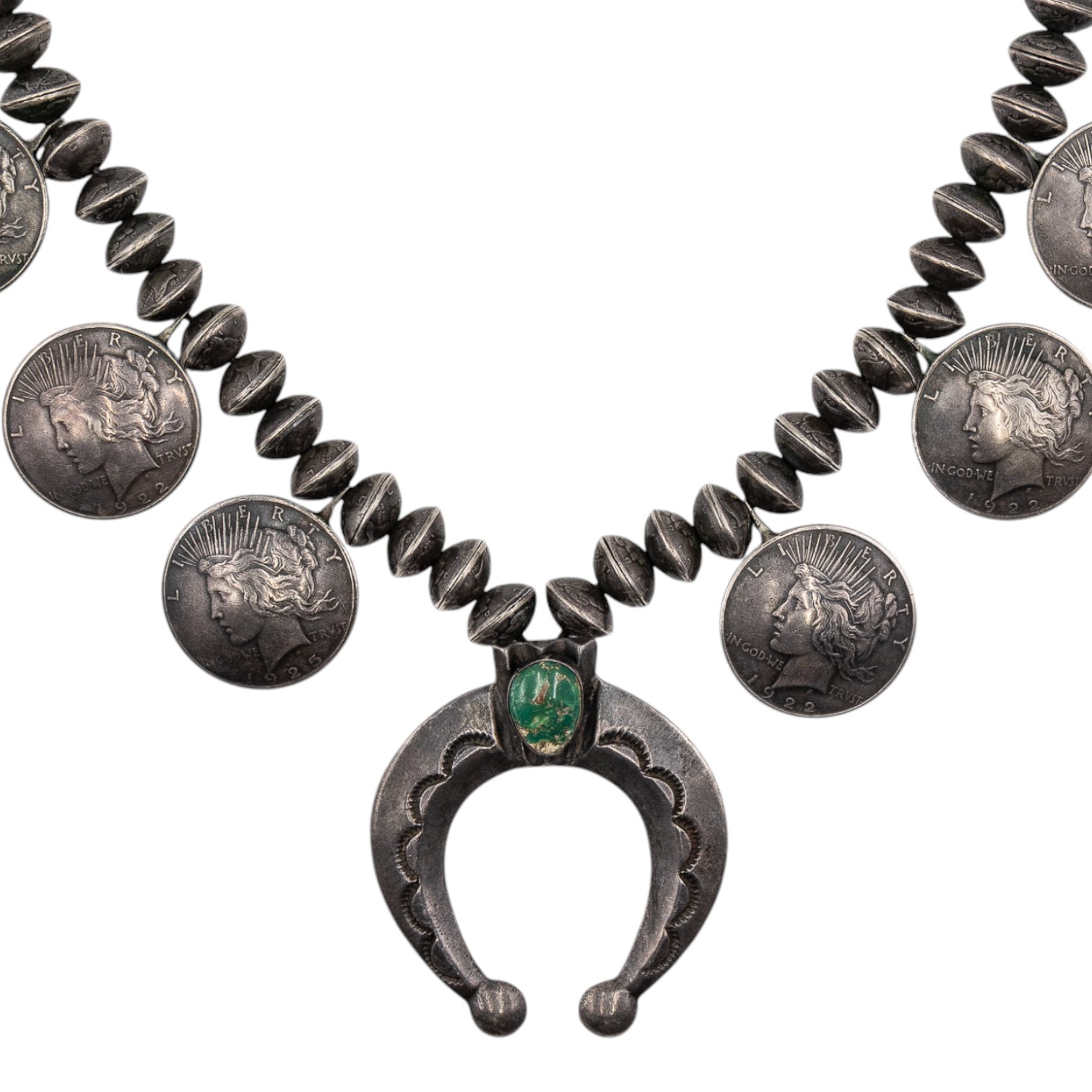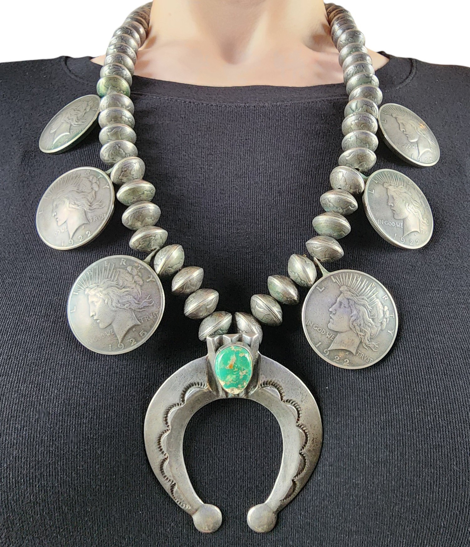 Amazing – Vintage Navajo Mercury Dime and 1920’s Walking Liberty Dollar Coin Sterling Turquoise Squash Blossom Necklace