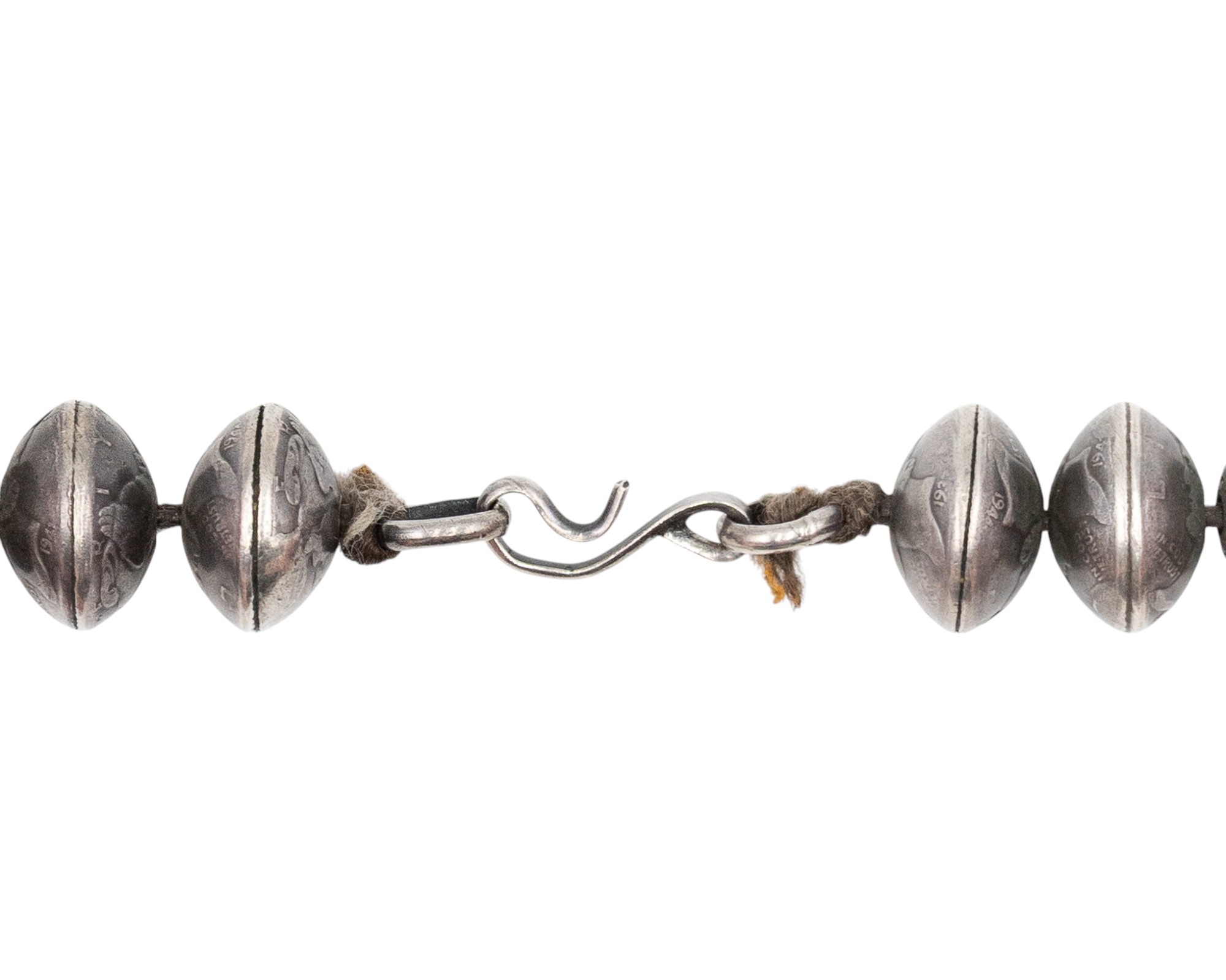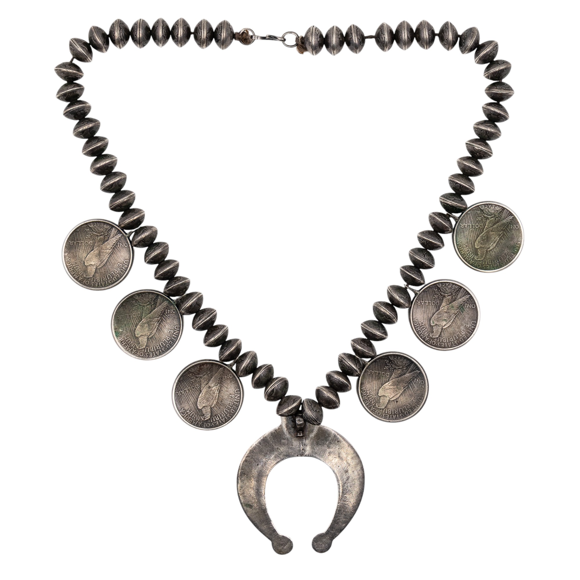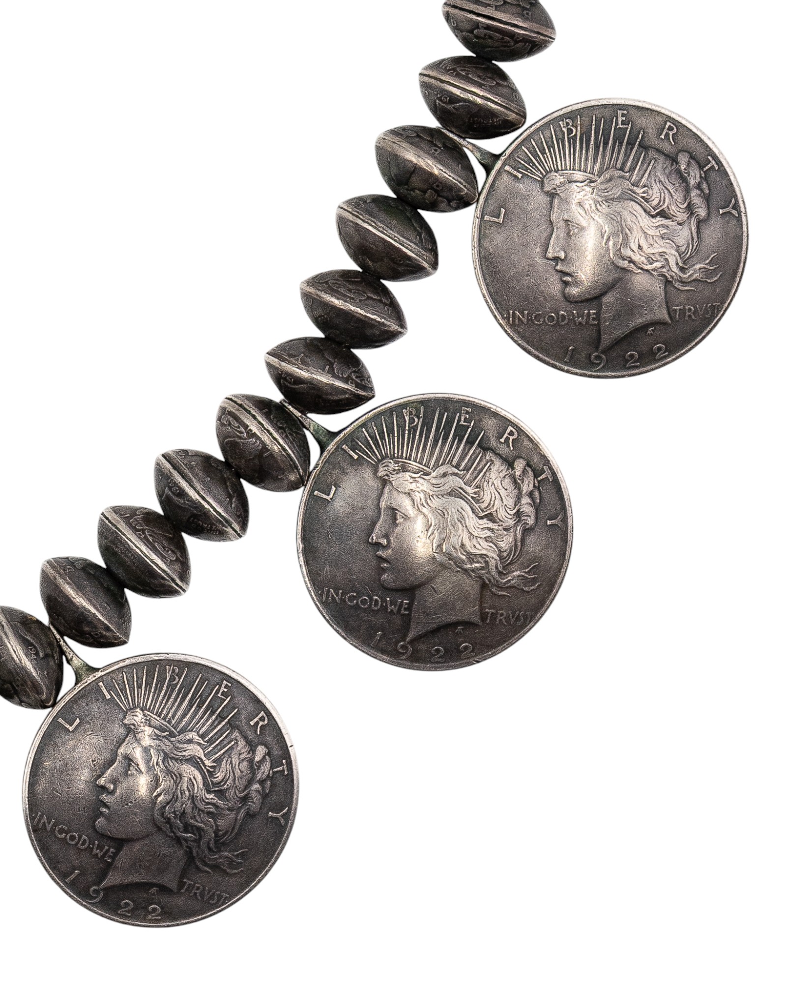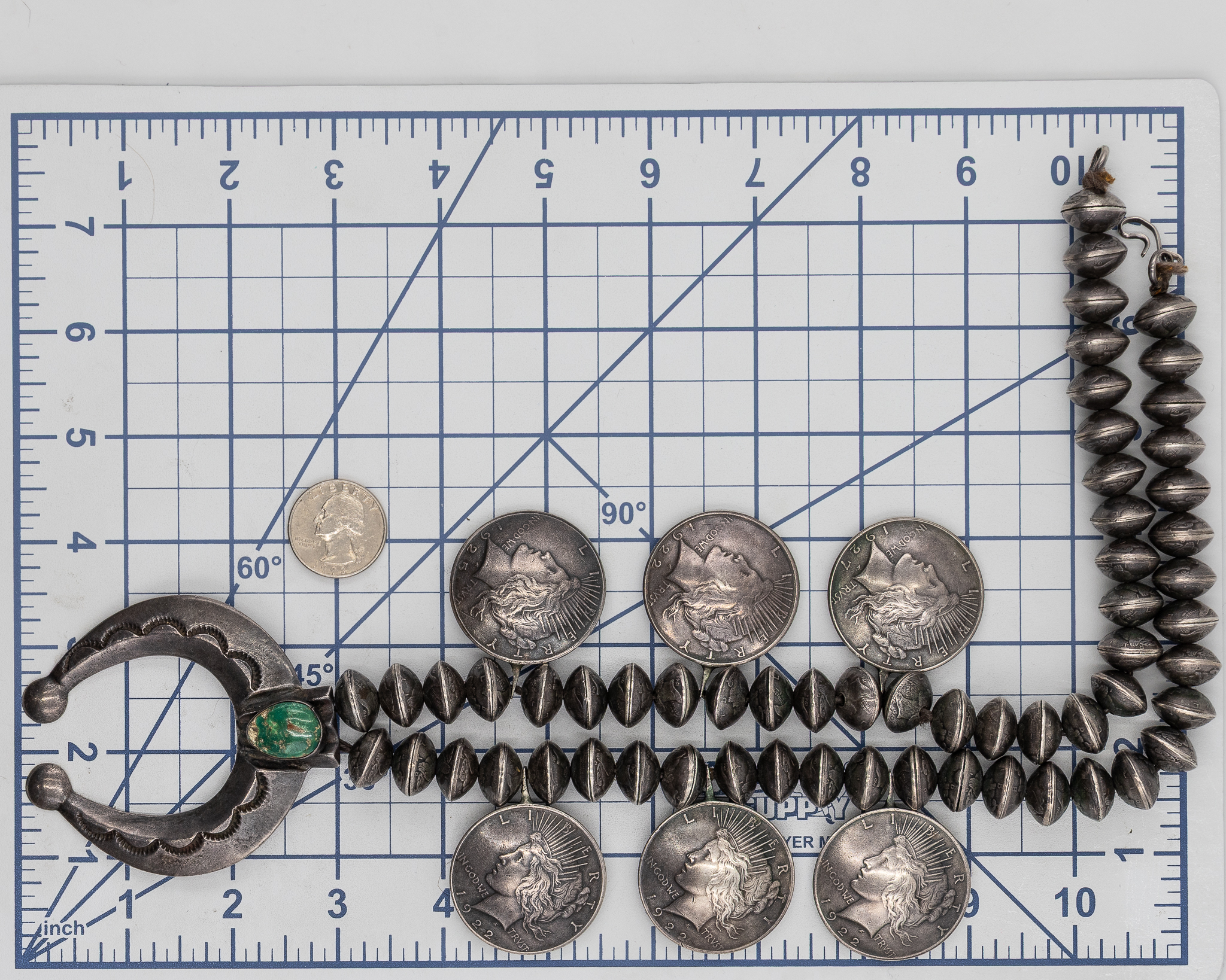 Amazing – Vintage Navajo Mercury Dime and 1920’s Walking Liberty Dollar Coin Sterling Turquoise Squash Blossom Necklace