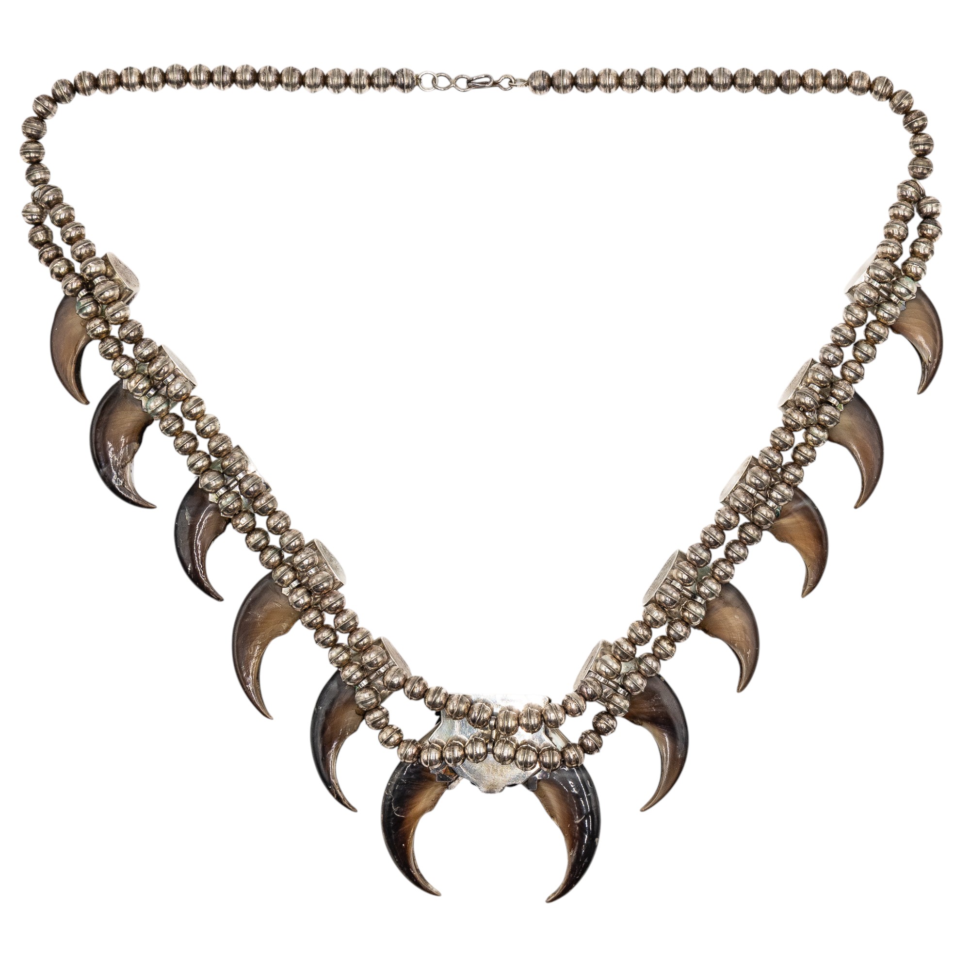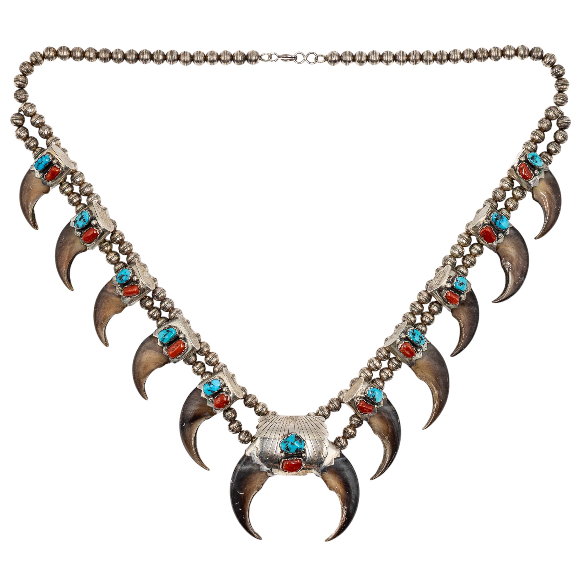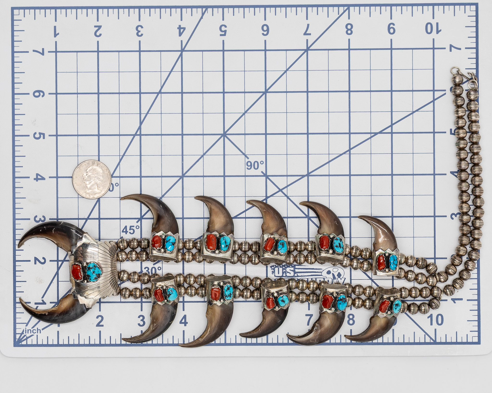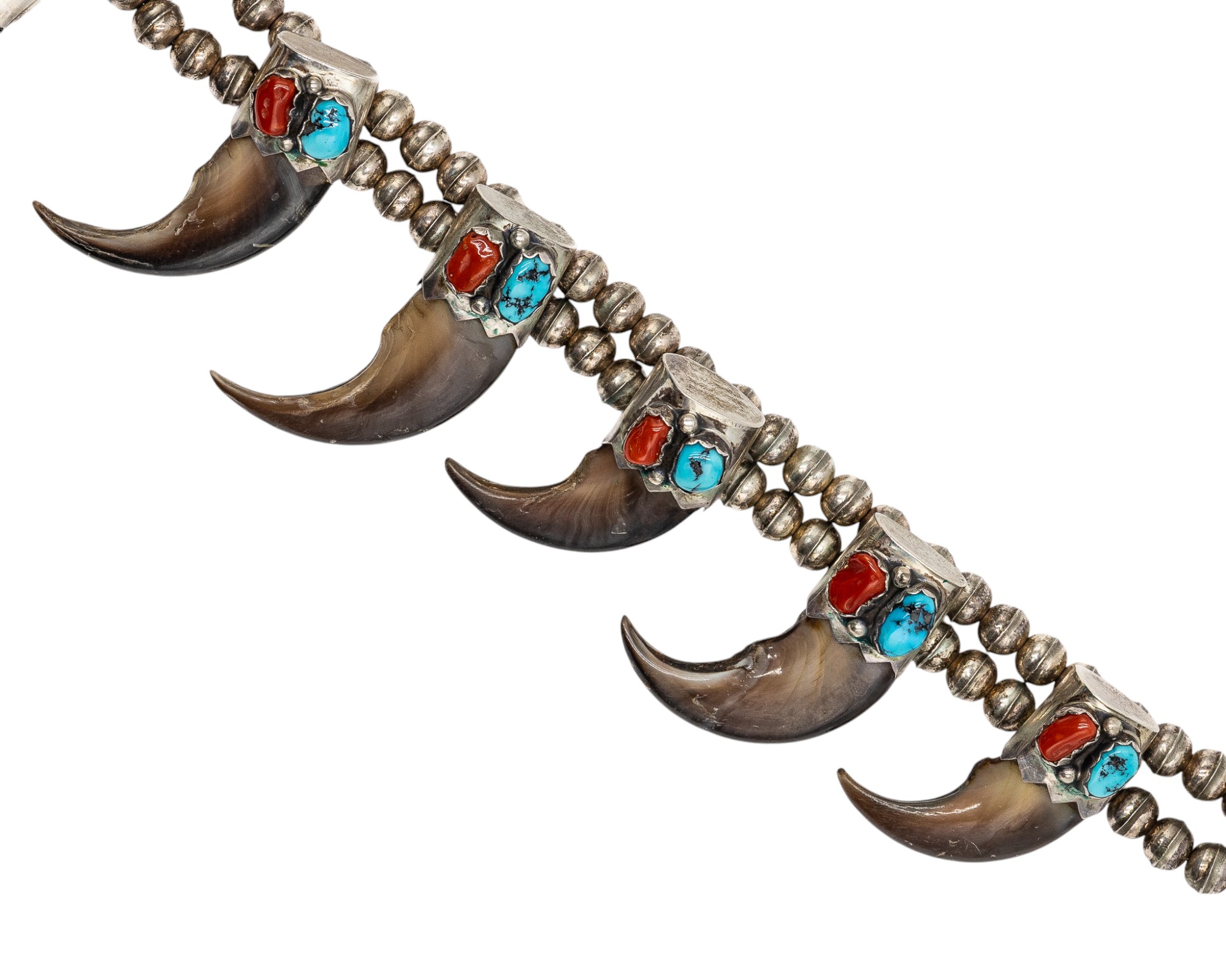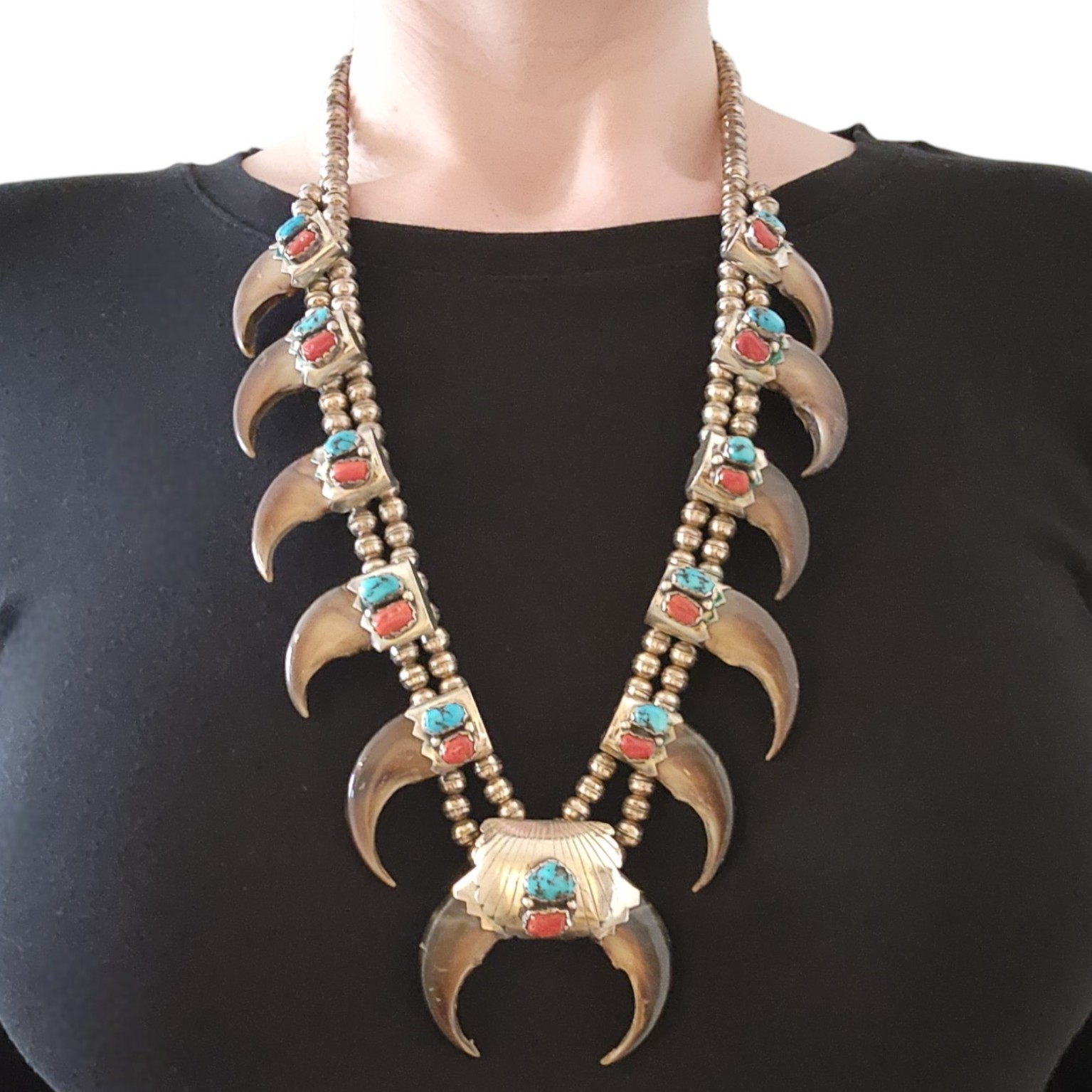 Vintage Navajo Sterling Turquoise Coral Bear Claw Squash Blossom Style Necklace
