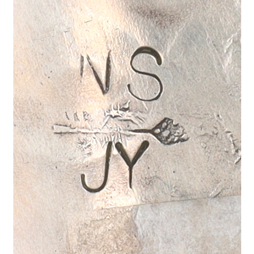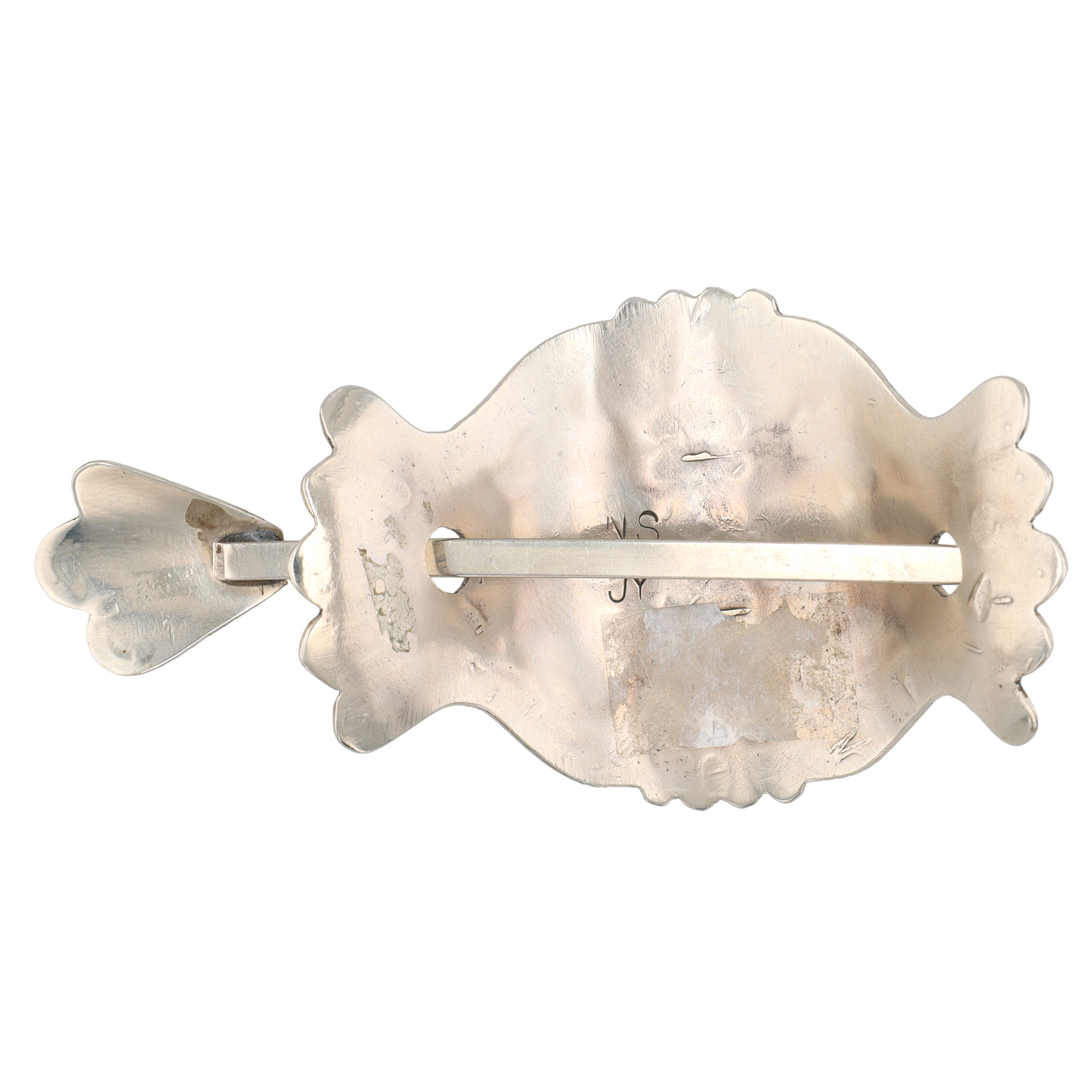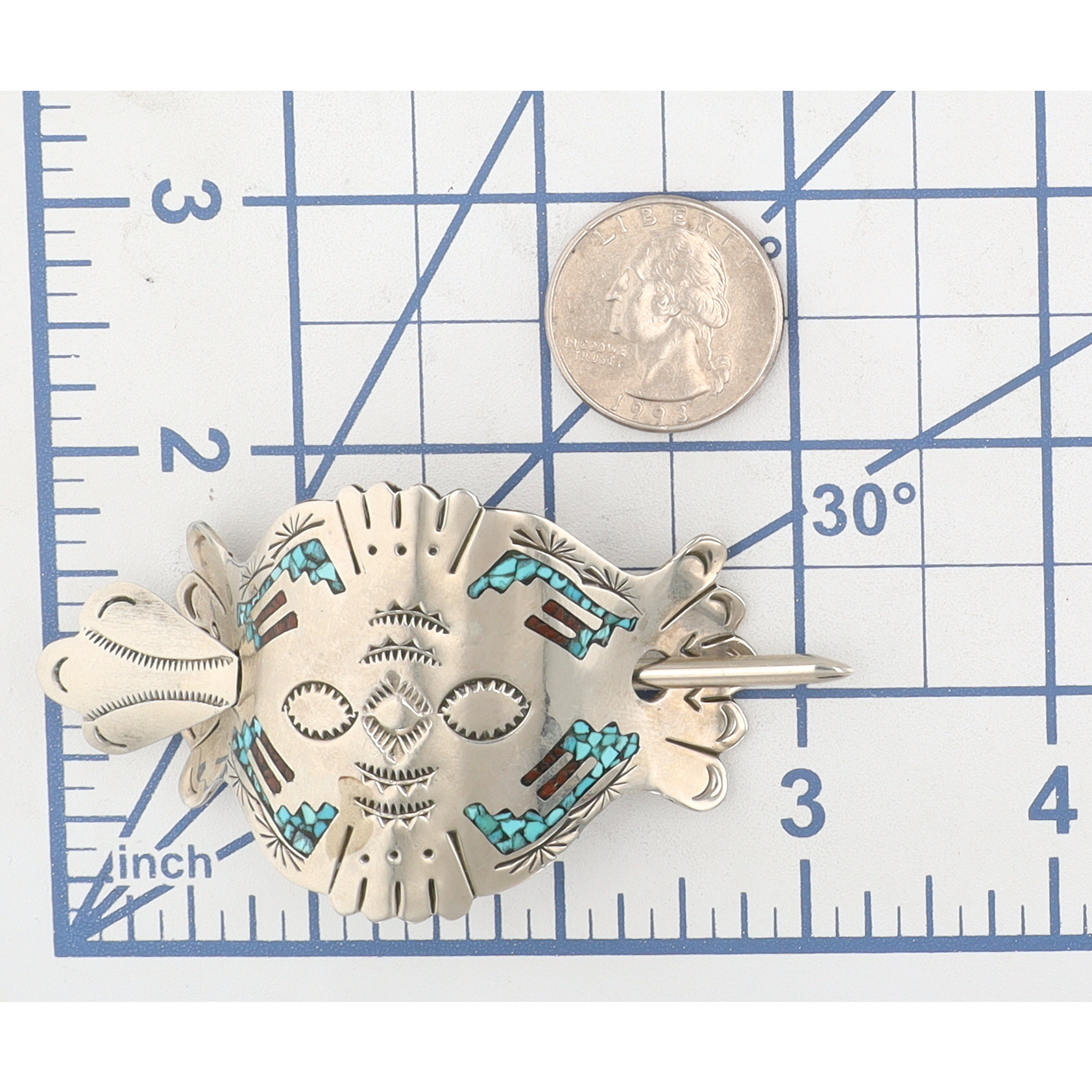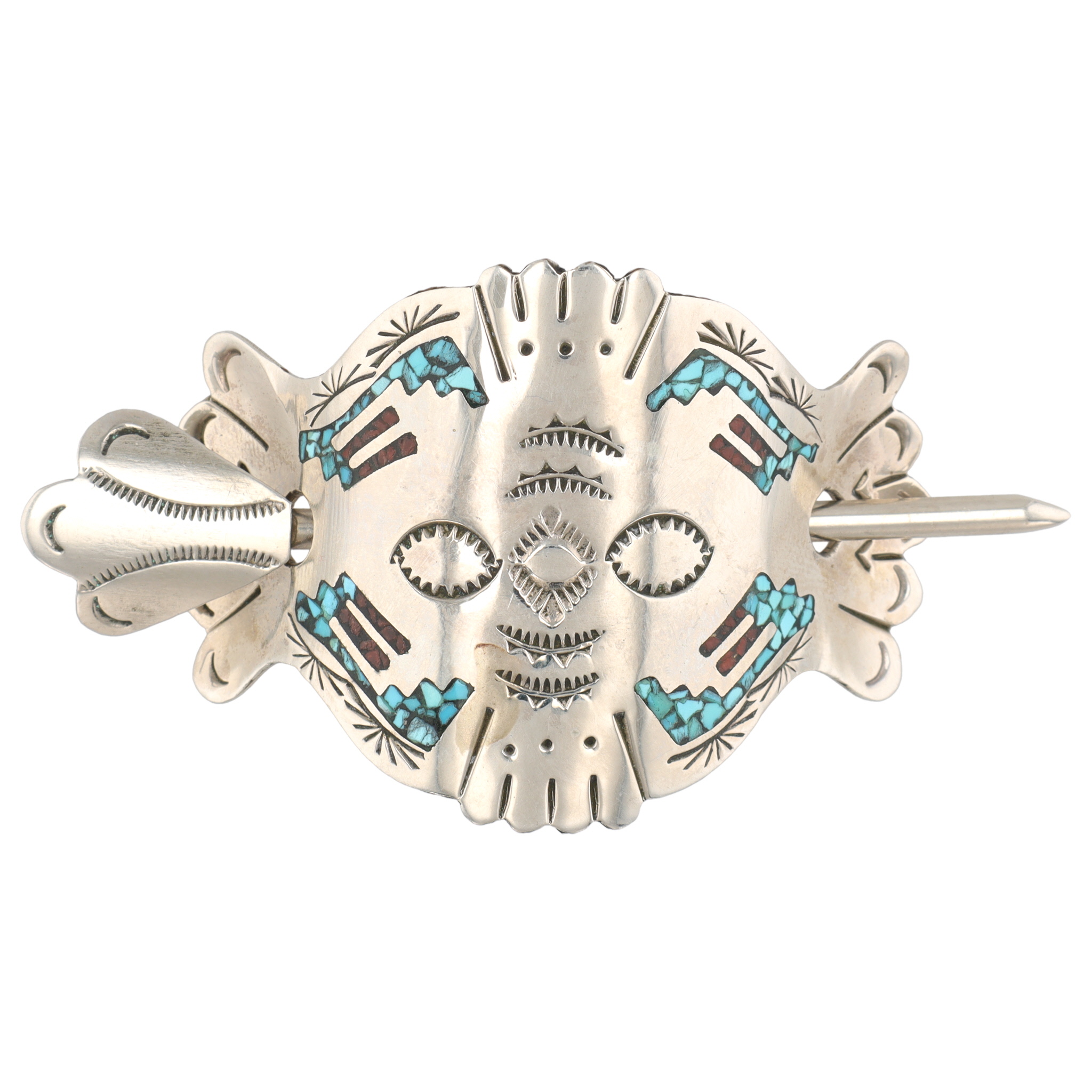 Signed NS and JY (possibly Jimmy Yazzie) with a pictomark – Navajo Sterling Crushed Turquoise and Coral Stamped Hair Pin/Barrette