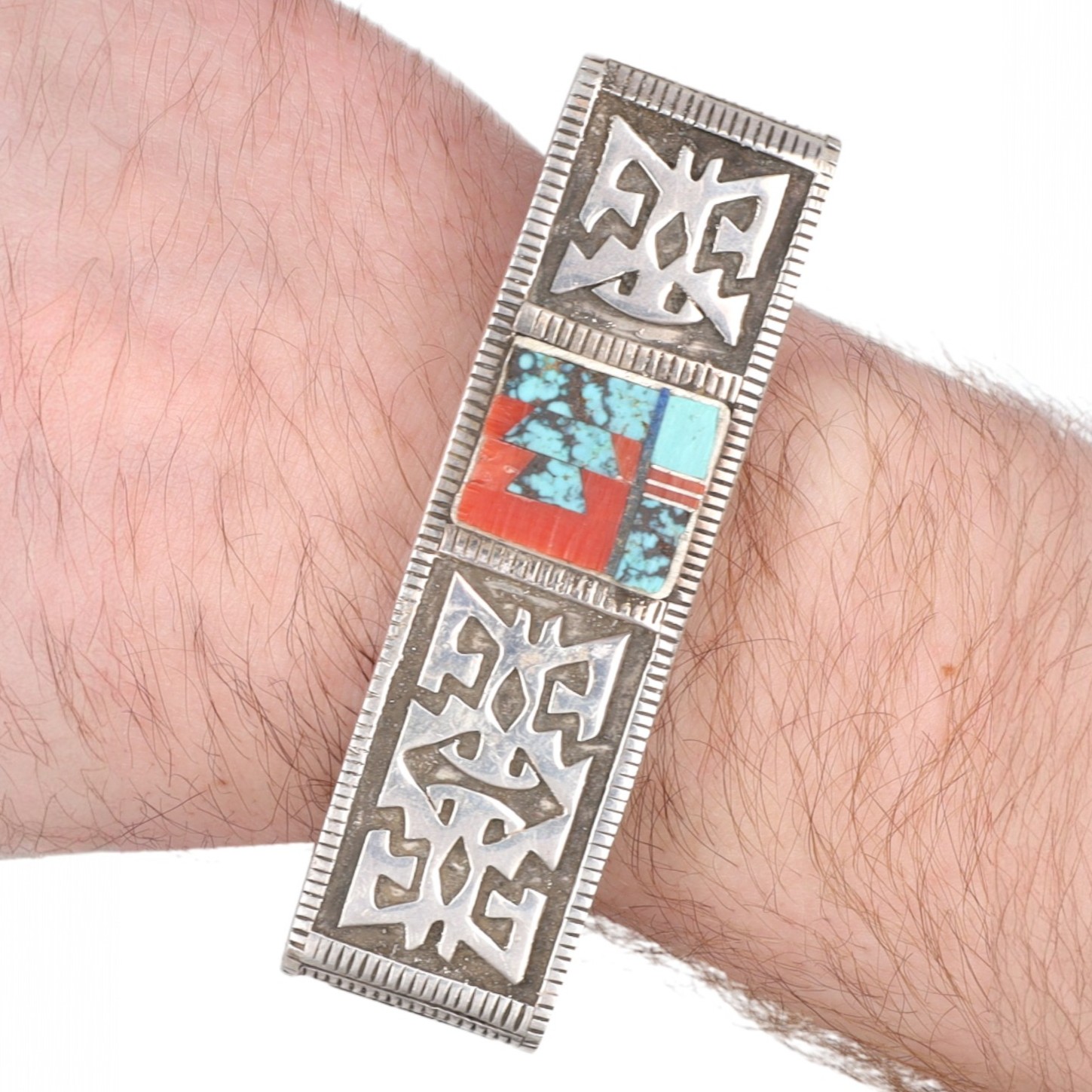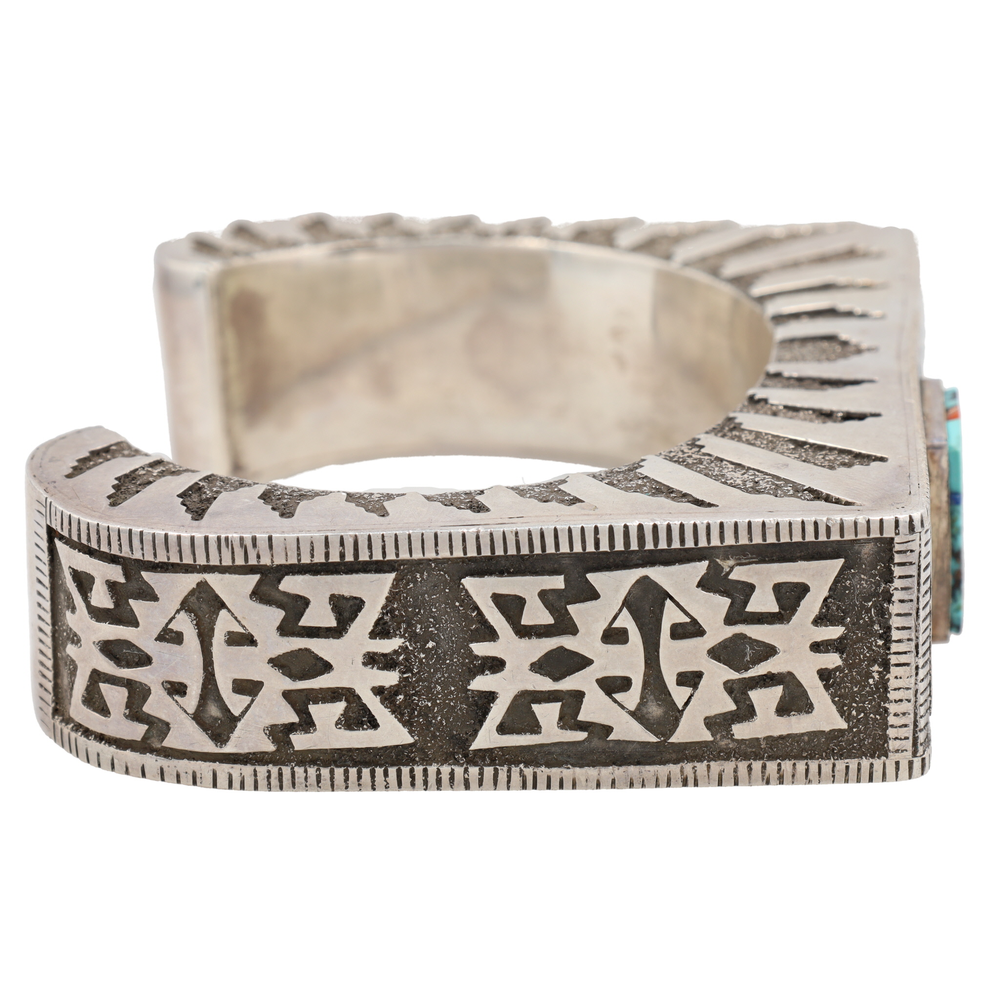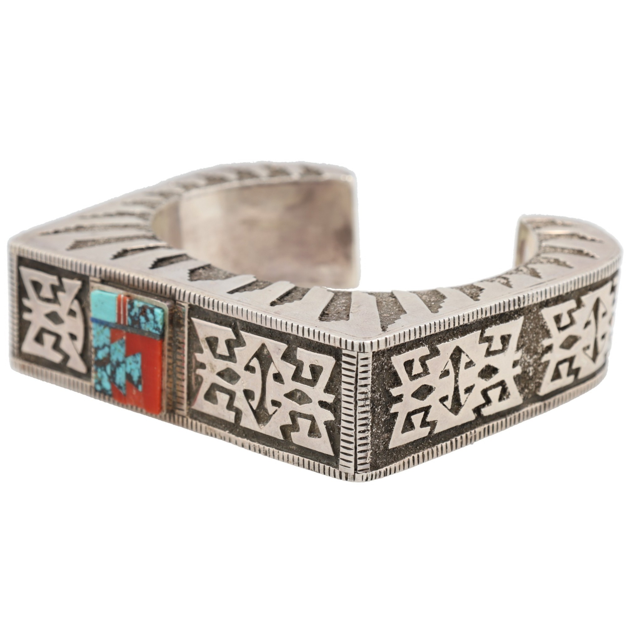 Vintage Navajo Sterling Heavy Gauge Multi Stone Inlay Cuff Bracelet