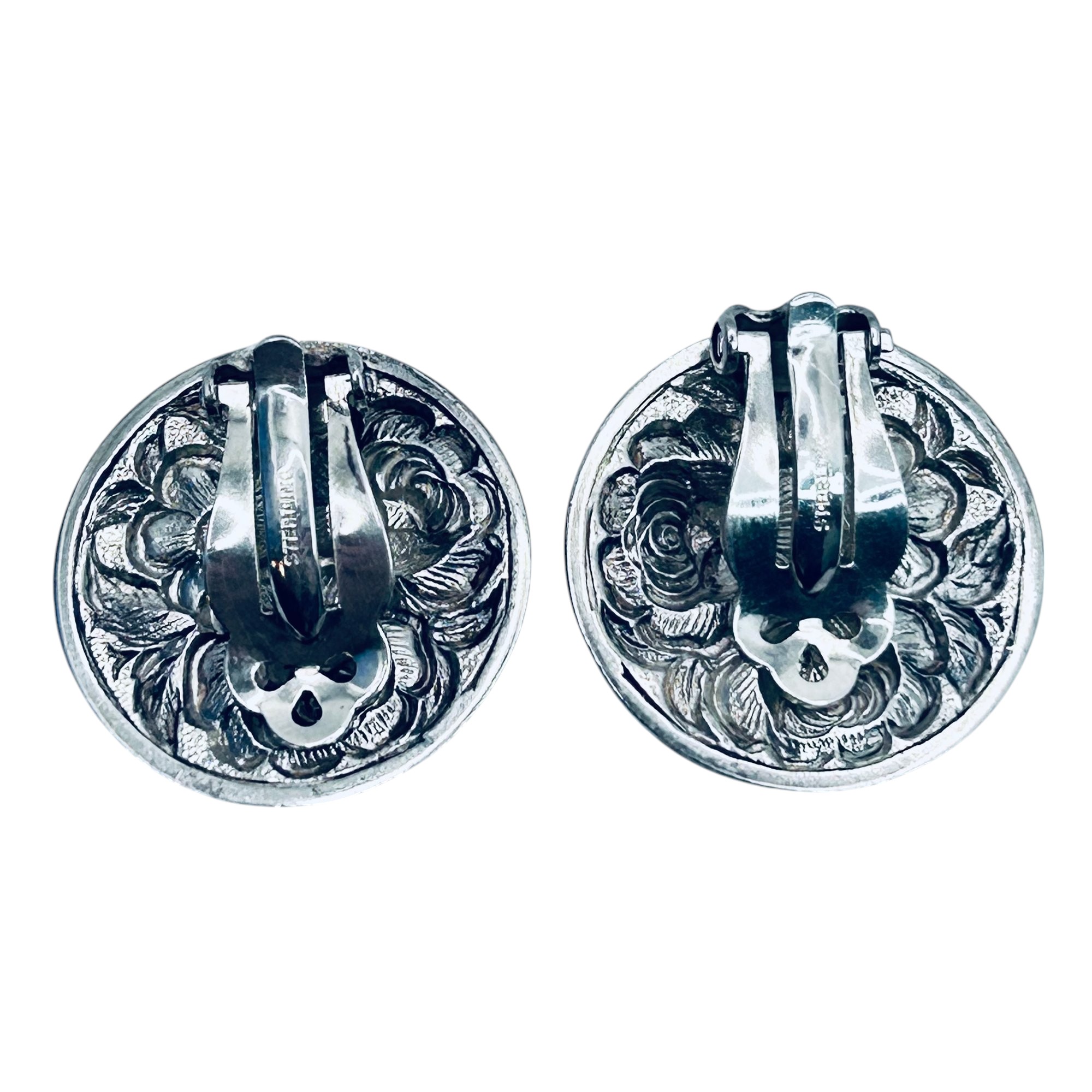 PAT. 156452 sterling silver detailed round flower clip on earrings. 12.33 g.
