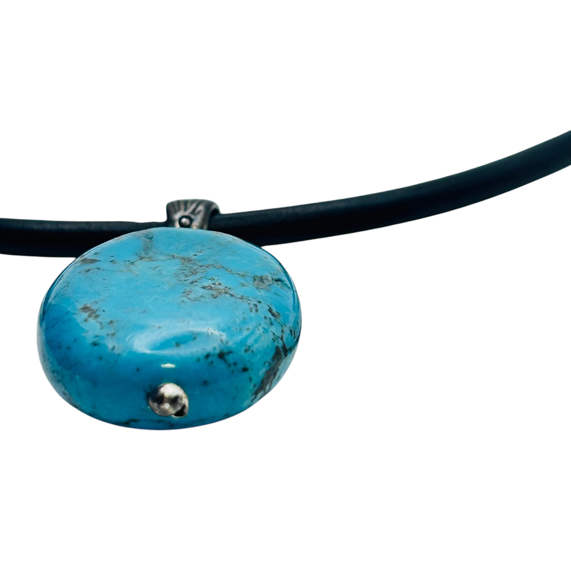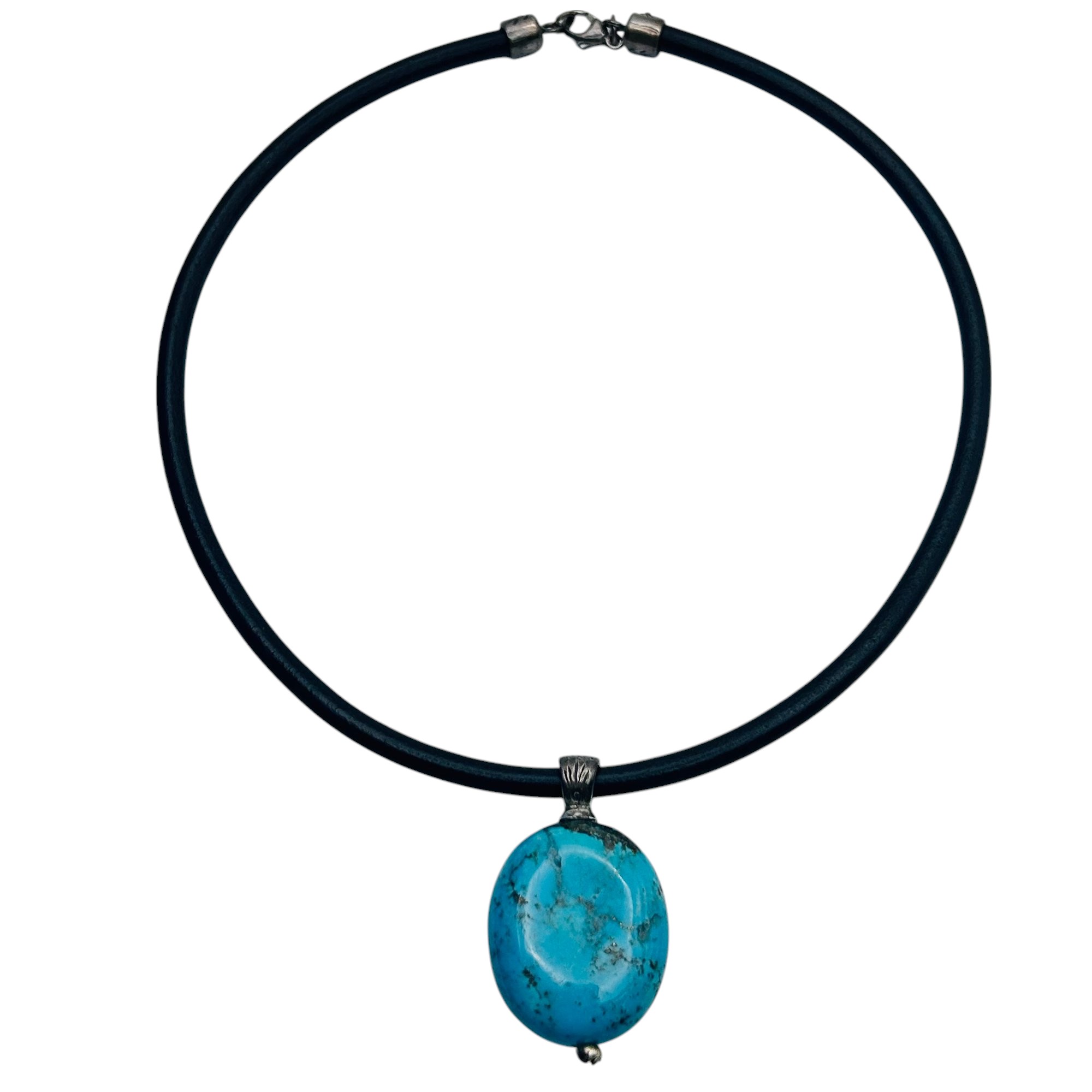 Oval TURQUOISE stone sterling silver leather cord necklace. 25.52 g.