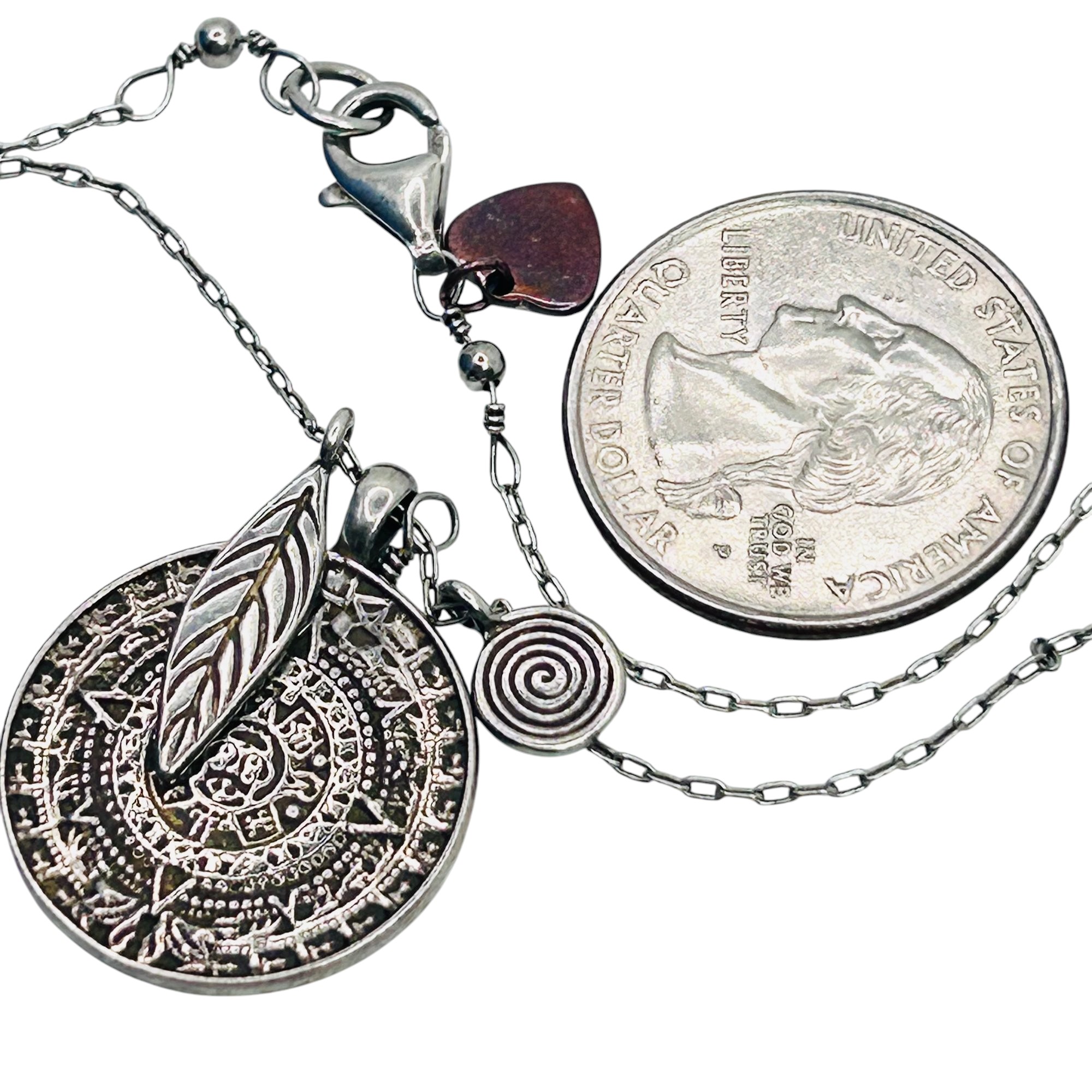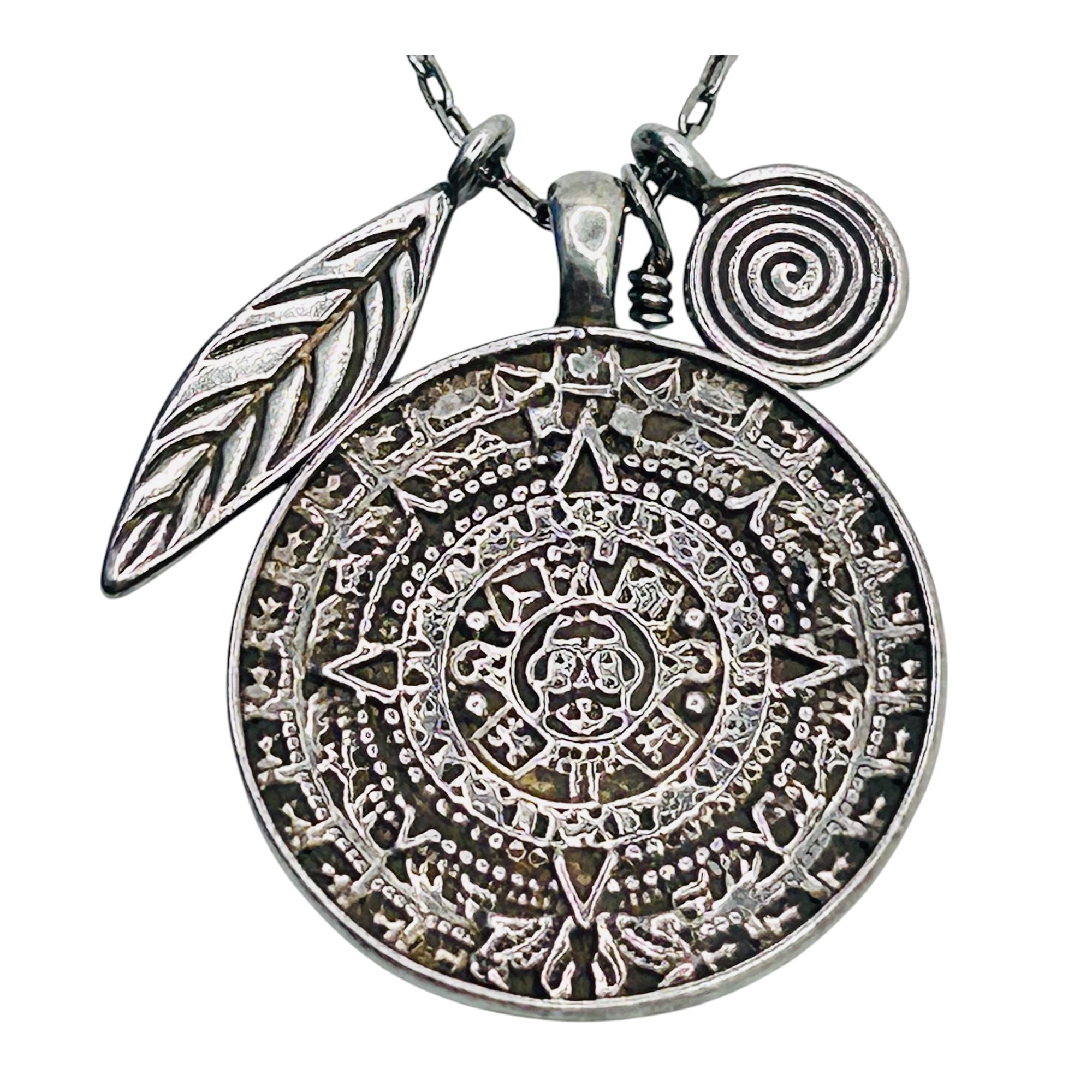 Aztec calendar sterling silver charm with trace chain necklace. 6.83 g.