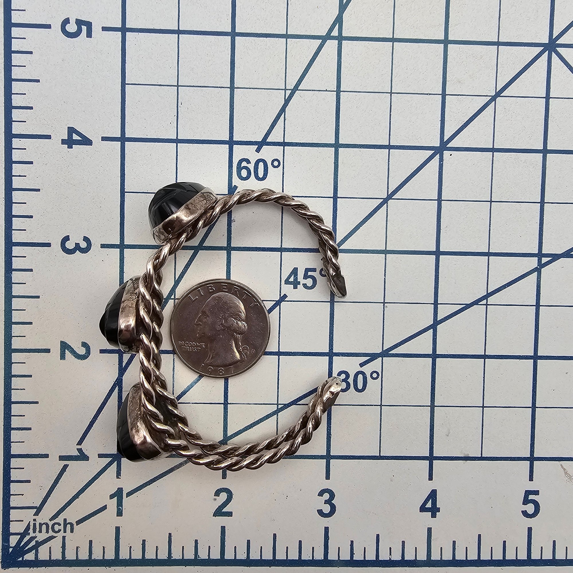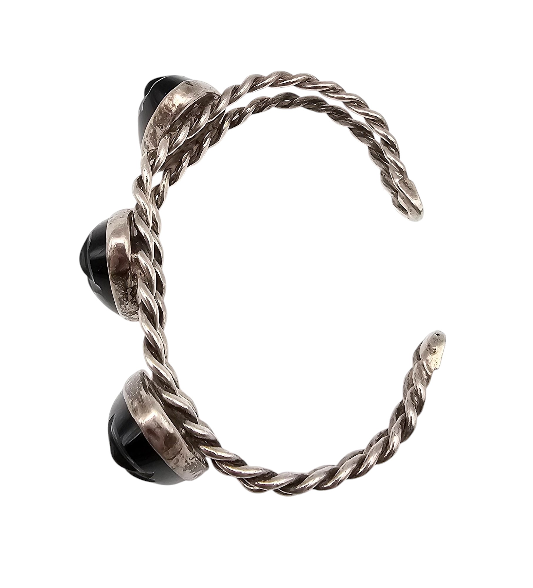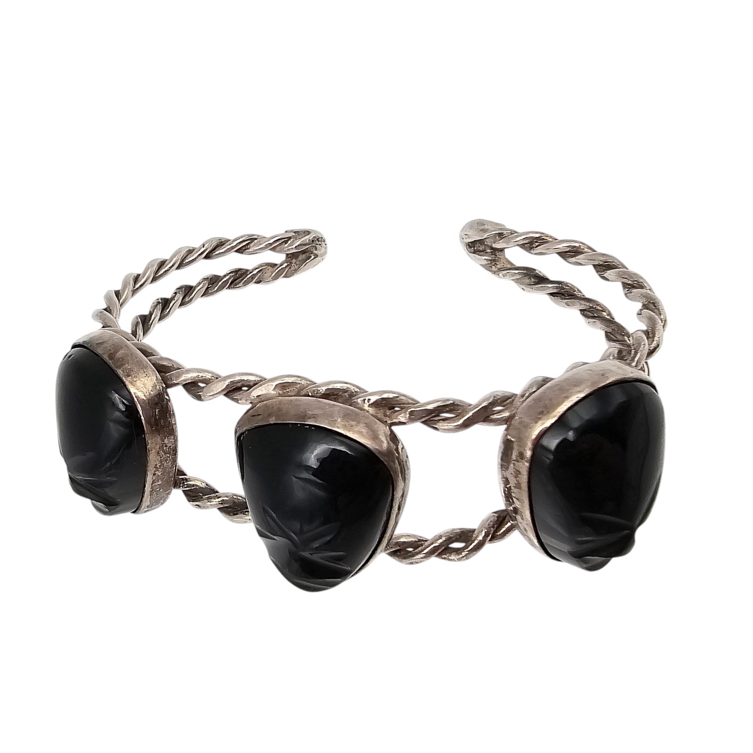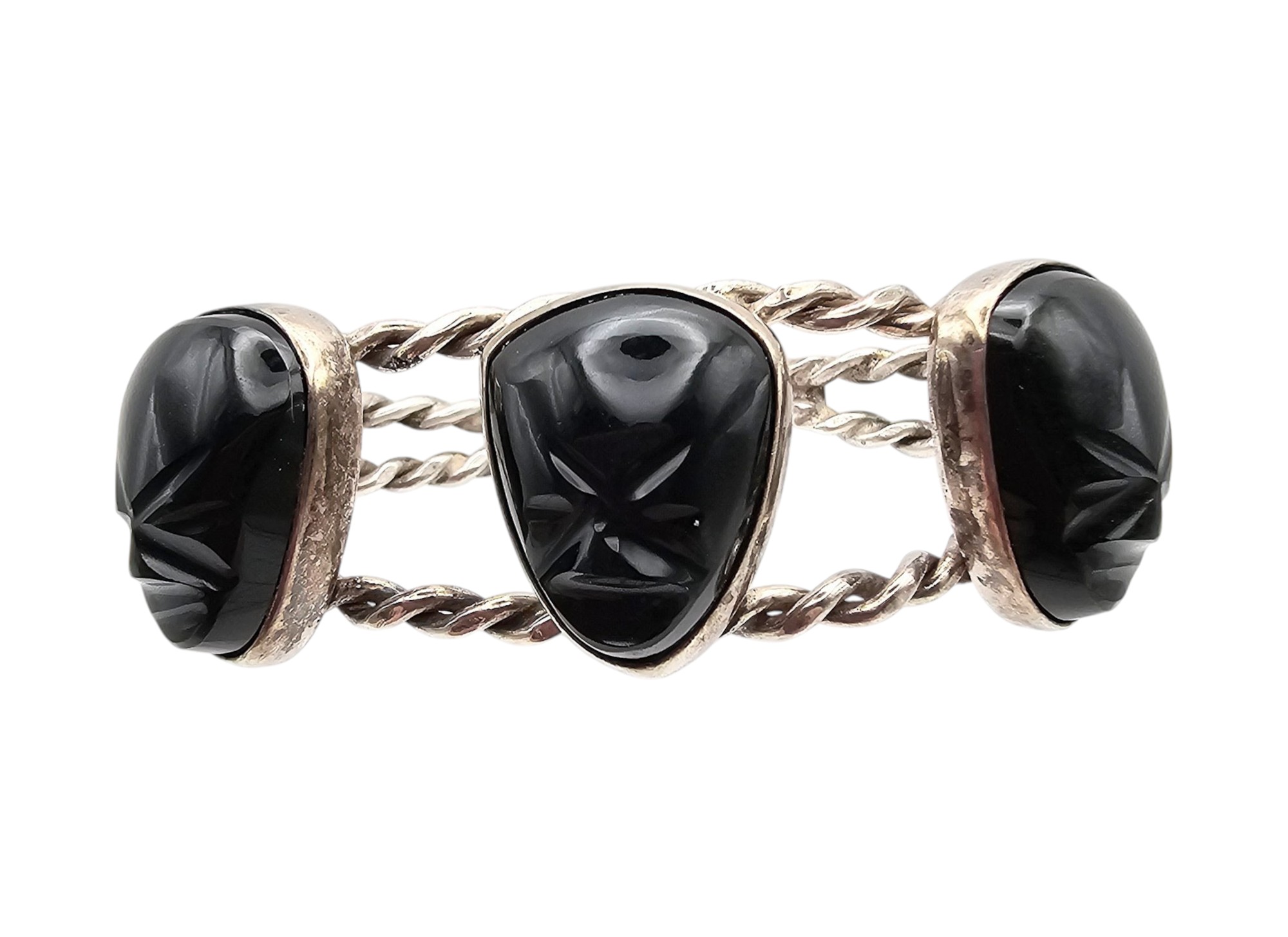 Signed with a Seahorse Carved Face Onyx Sterling Silver Cuff Bracelet 28.8 G