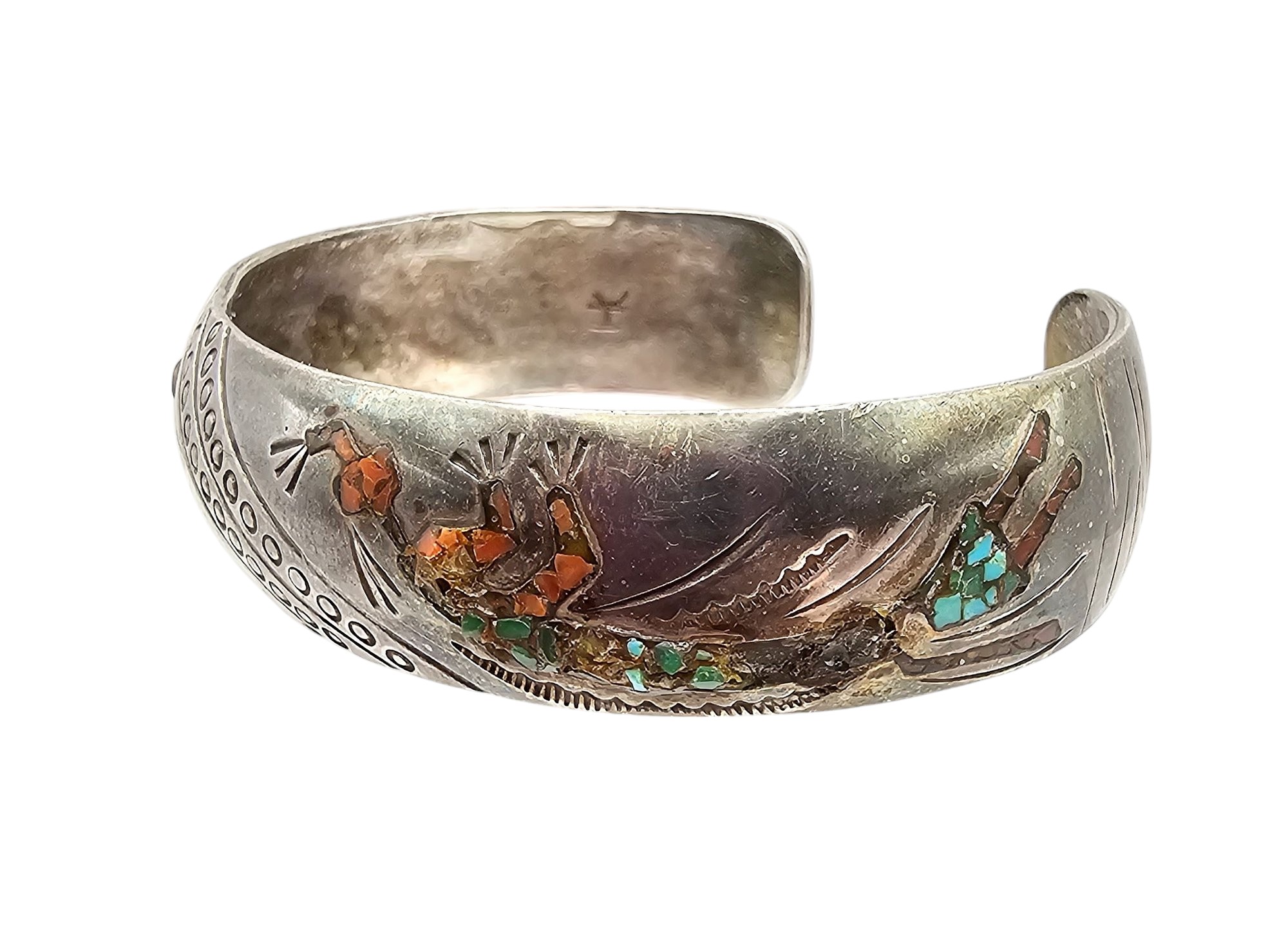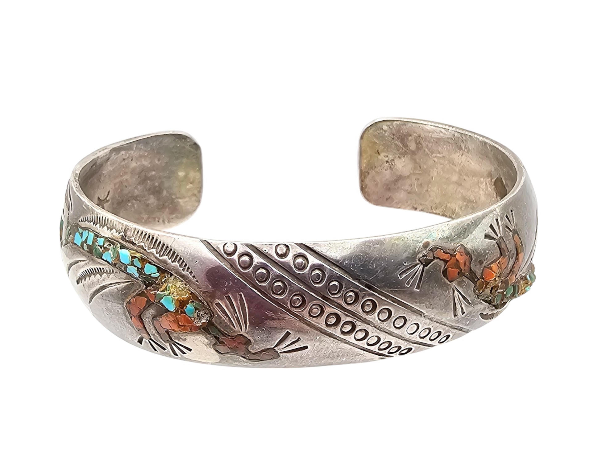 Vintage Signed Native Southwestern Turquoise Coral Cuff Bracelet 30 G as is missing some stones
